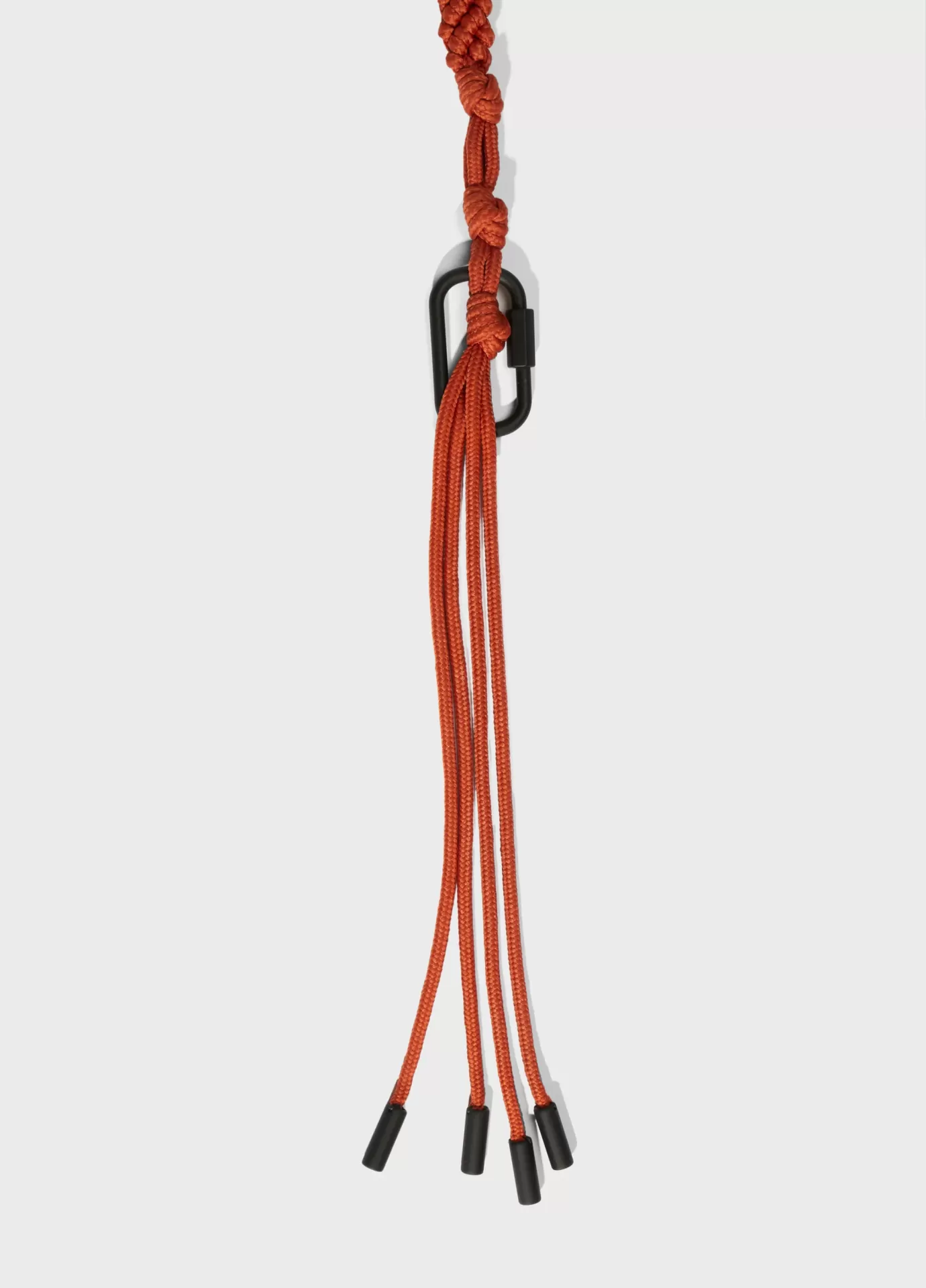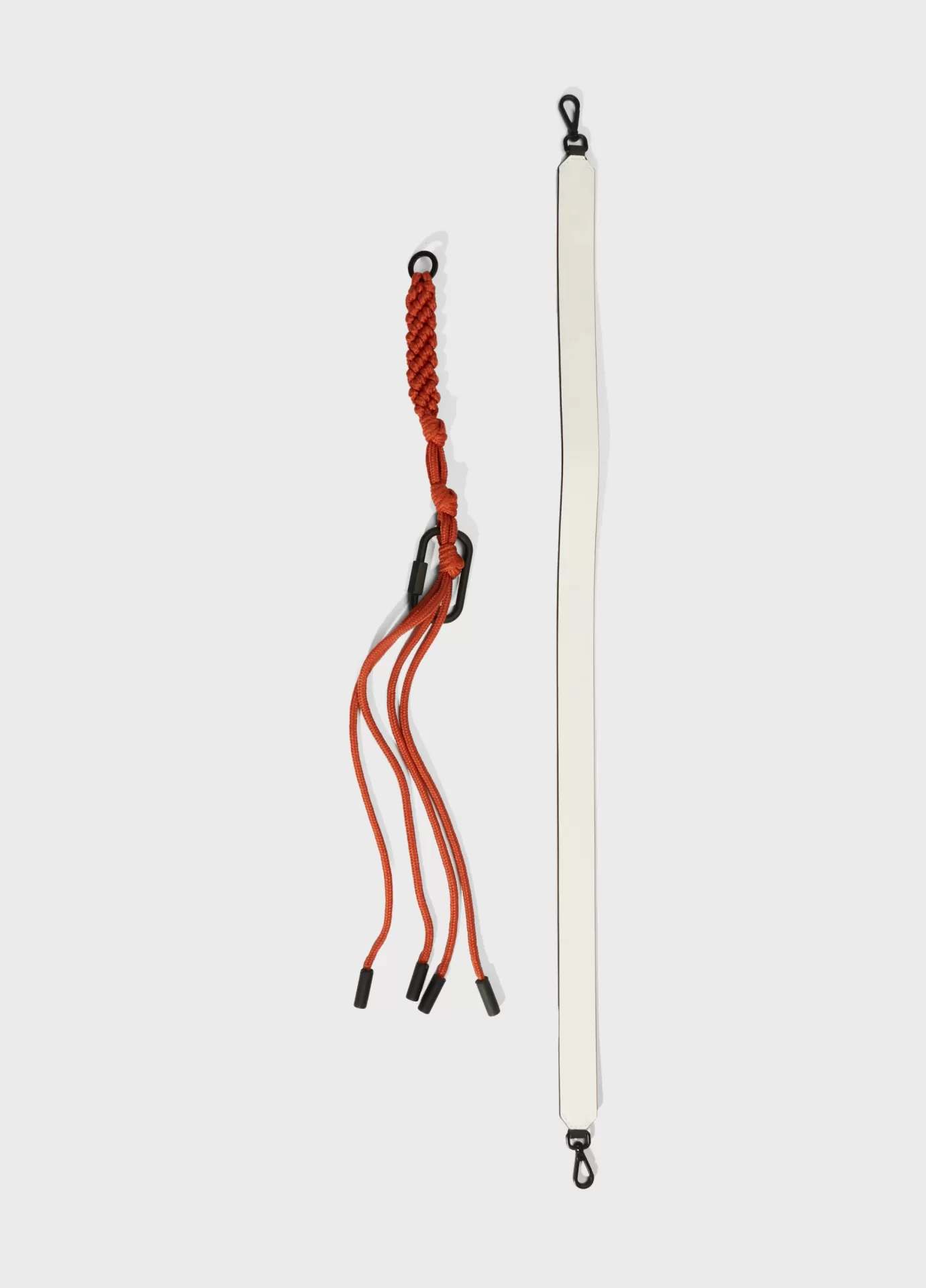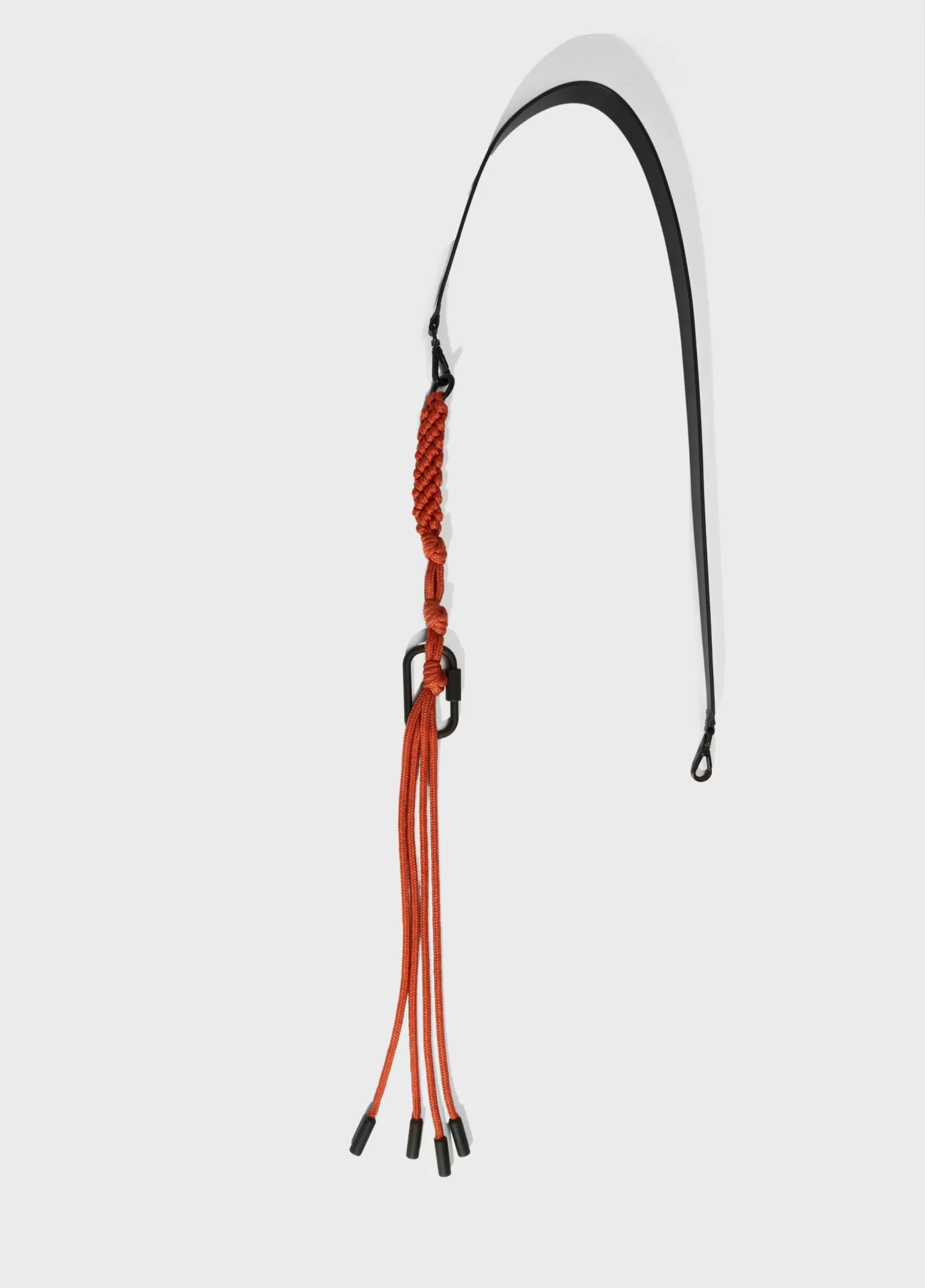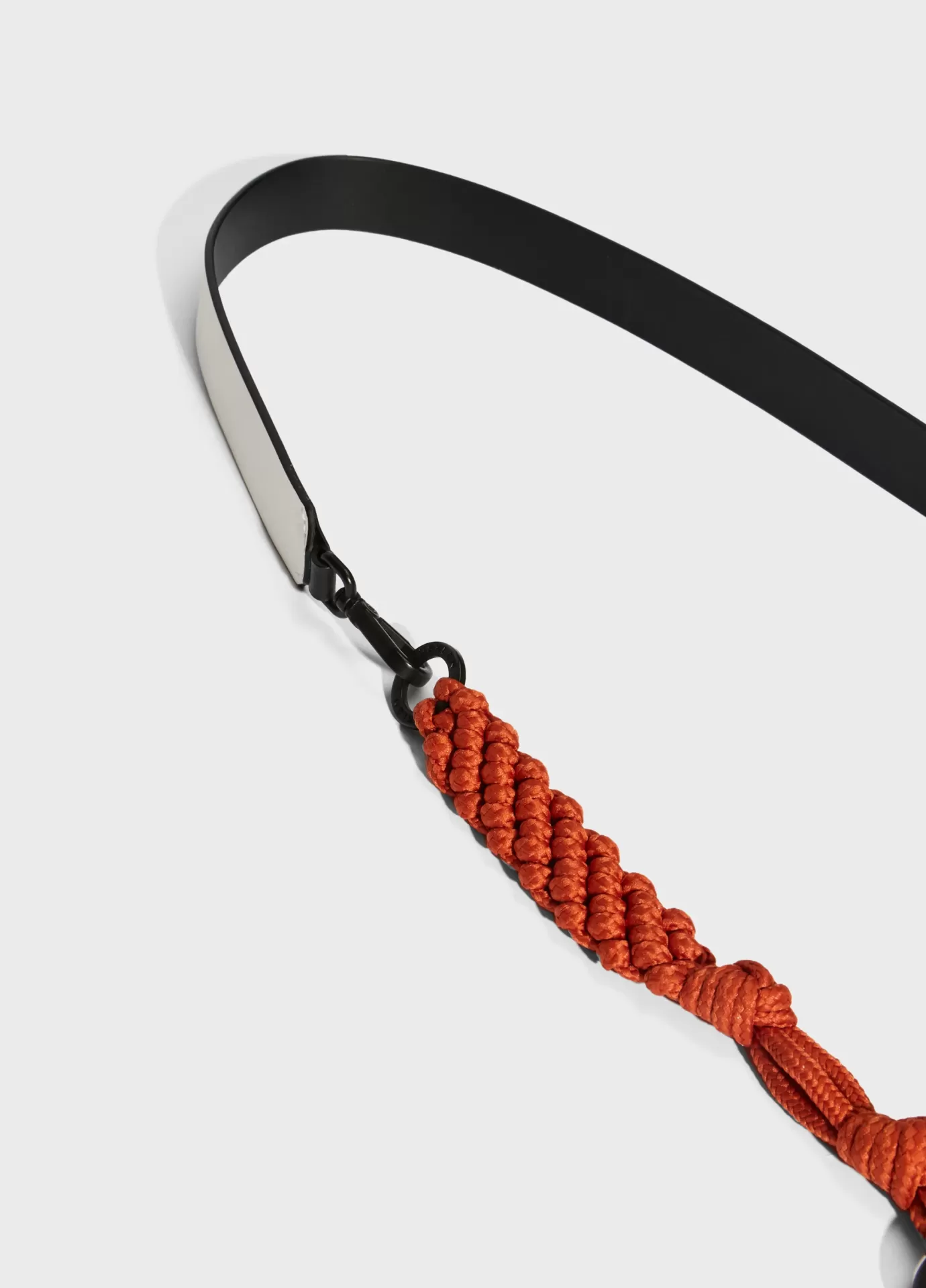 Alça de couro 100% bovino e corda 100% poliéster pet. modelo de alça com a parte em couro dupla face, podendo ser usada de ambos os lado, e macramê de corda. possui mosquetes e argola em metal preto fosco.