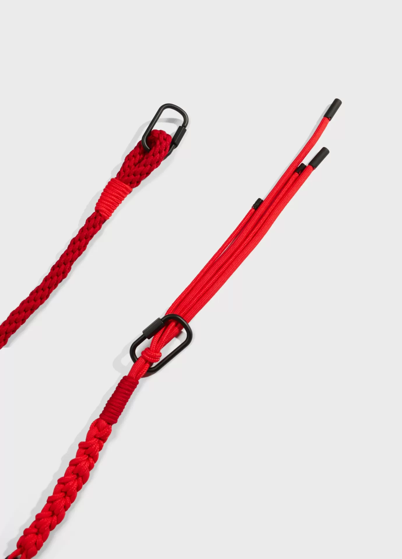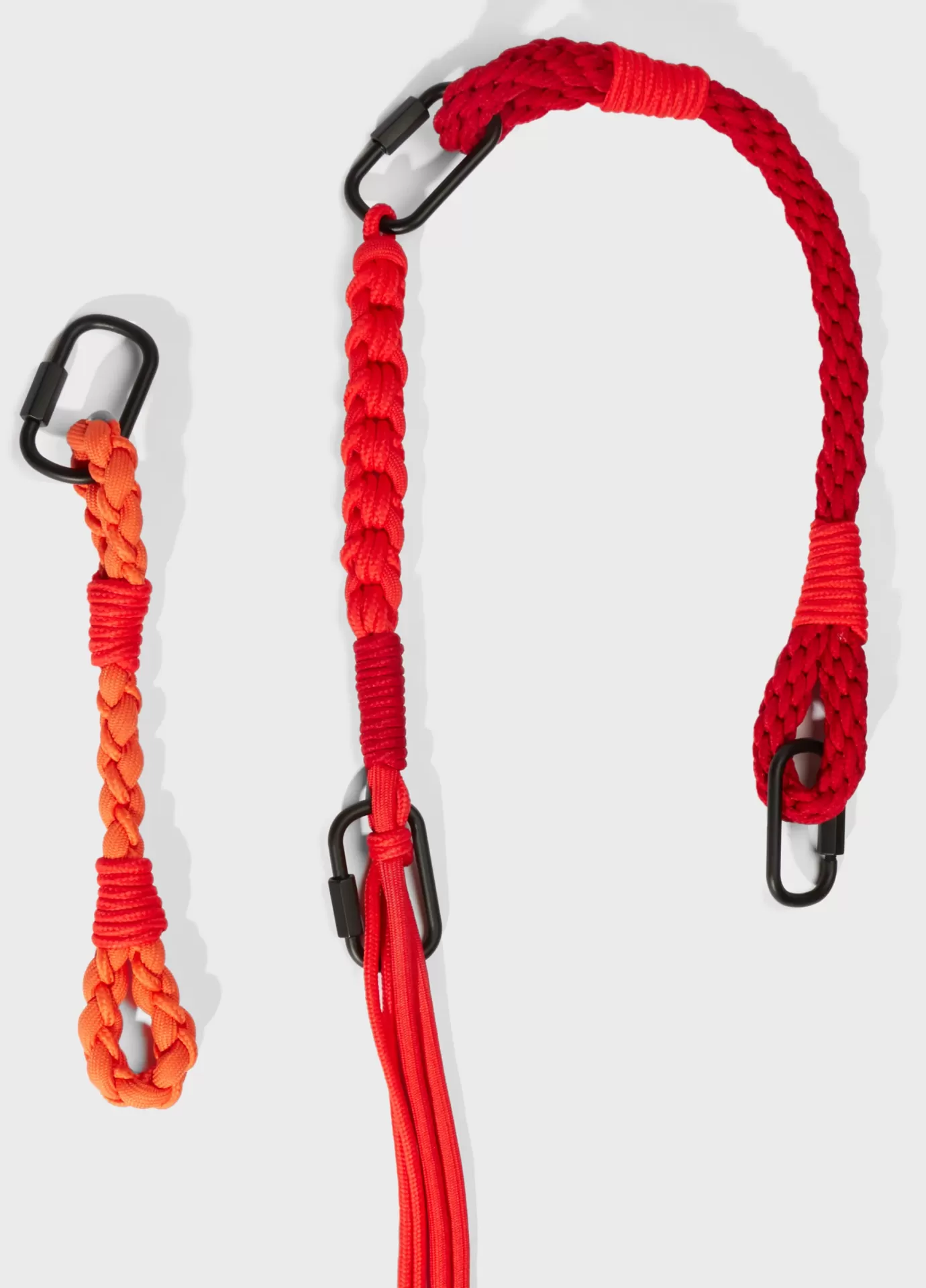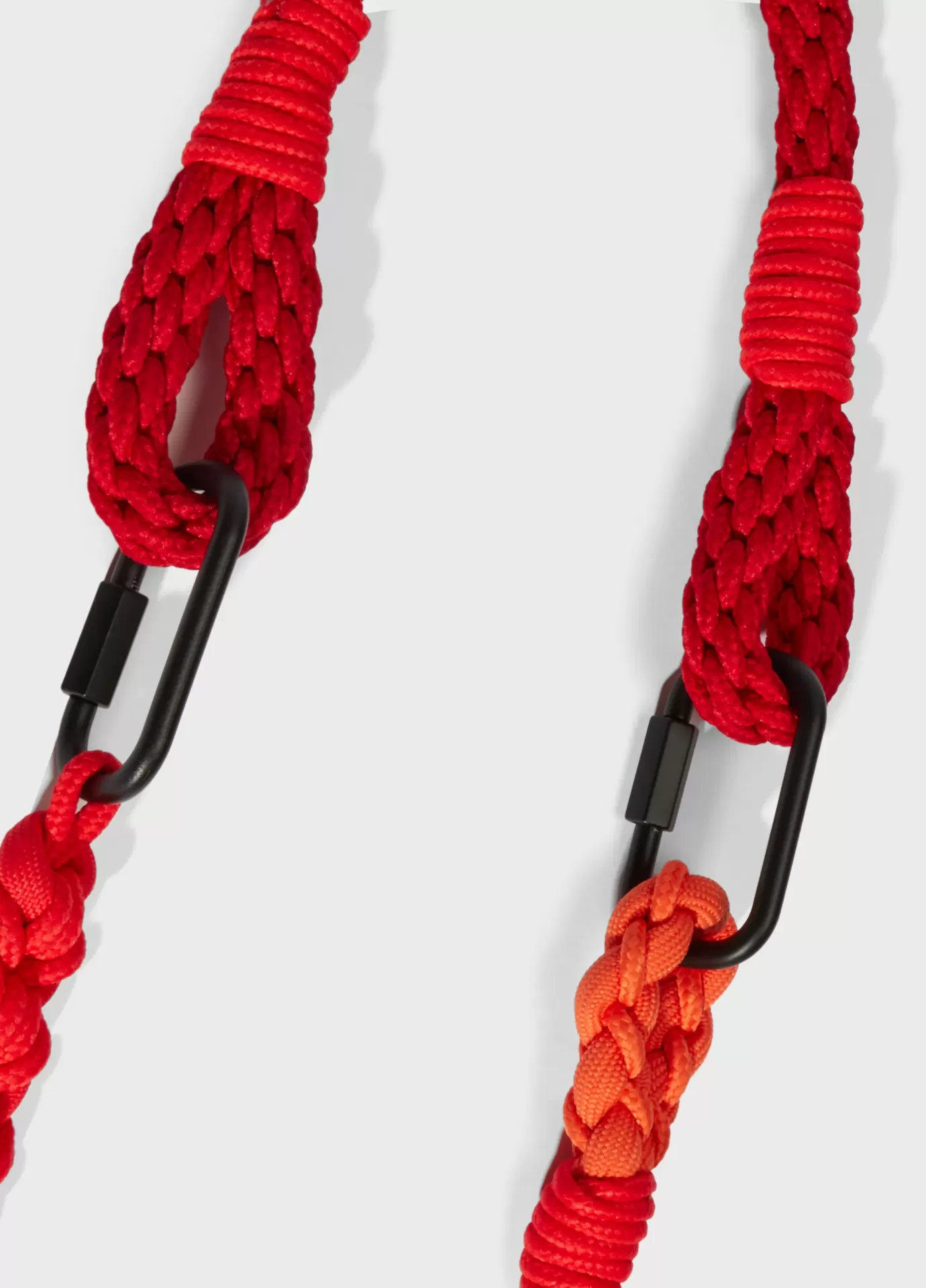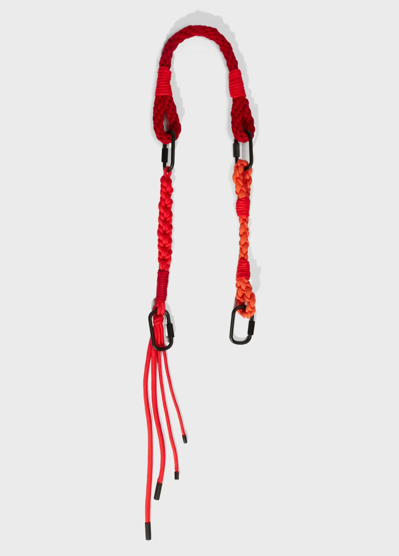 Alça de bolsa feita de amarrações de corda 100% poliéster pet. possui tag de borracha, e 4 mosquetões de rosquear para ser utilizada em bolsas osklen com argola no porta alças. esta alça pode ser usada na versão curta removendo as pontas presas nos dois mosquetões do topo, ou pode ser usada longa.