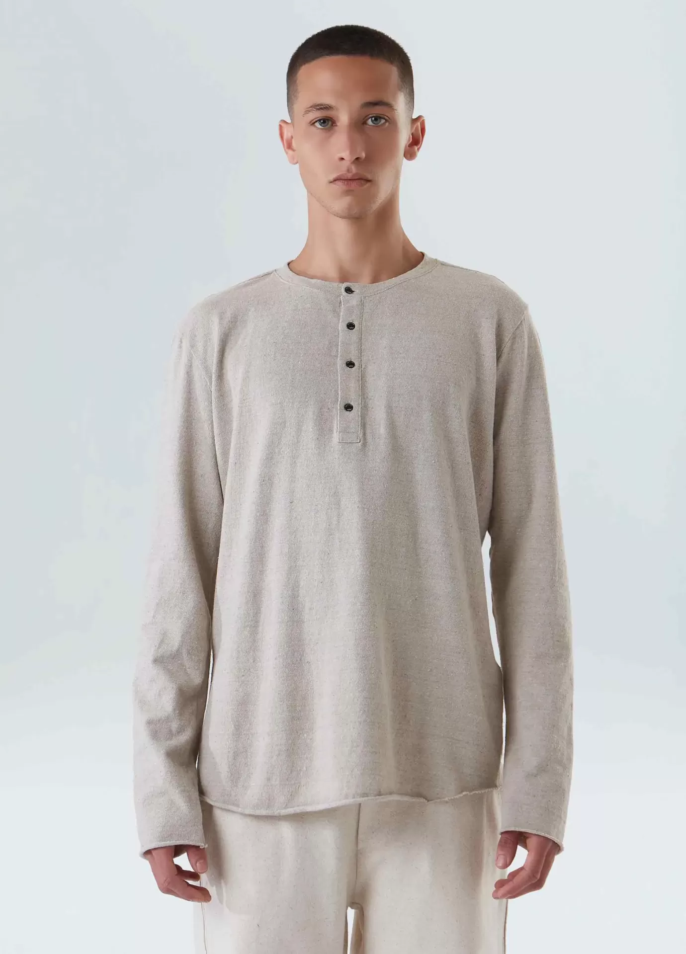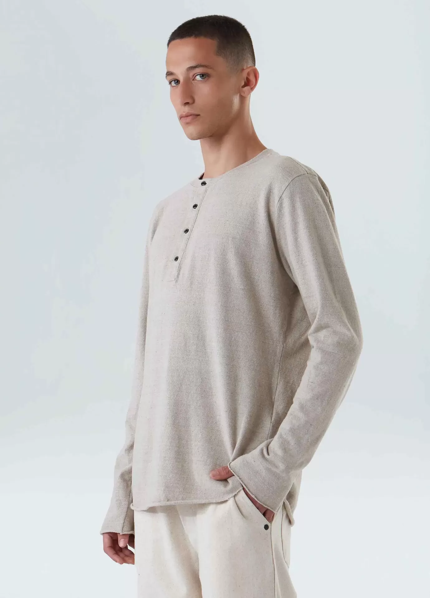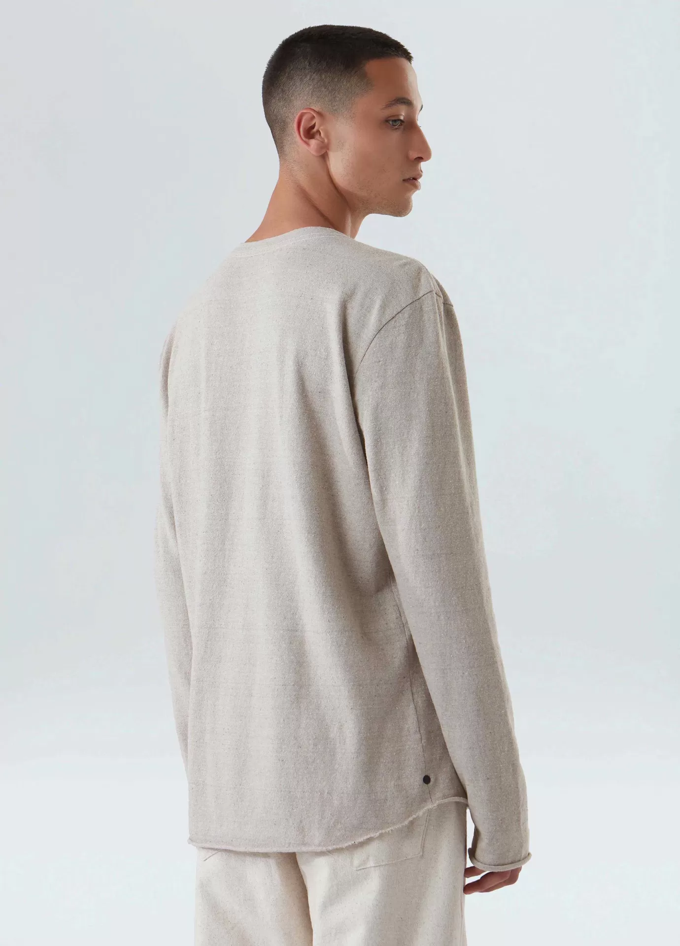 Camisa em malhão eco feita de fibras recicladas e algodão, que possui o amaciamento organic mint wash, um processo natural formulado à base do óleo essencial da menta orgânica, cultivada em pequenas hortas que fazem parte de um projeto social que promove a recuperação e ressocialização de dependentes químicos. bandeira redesign waste.