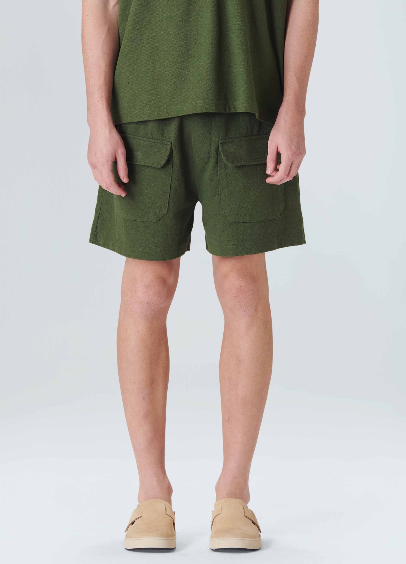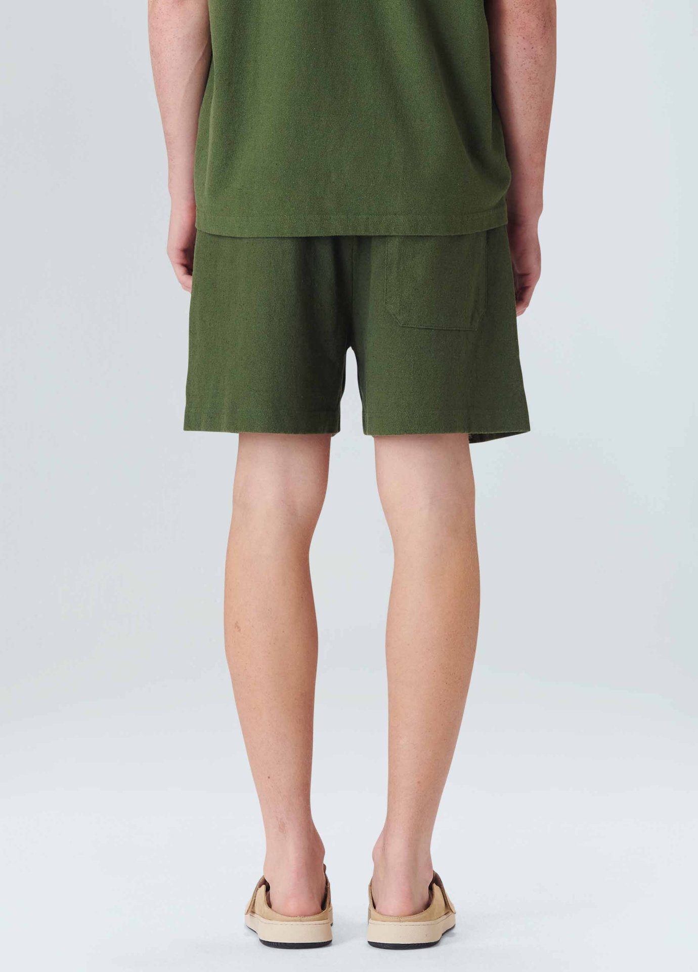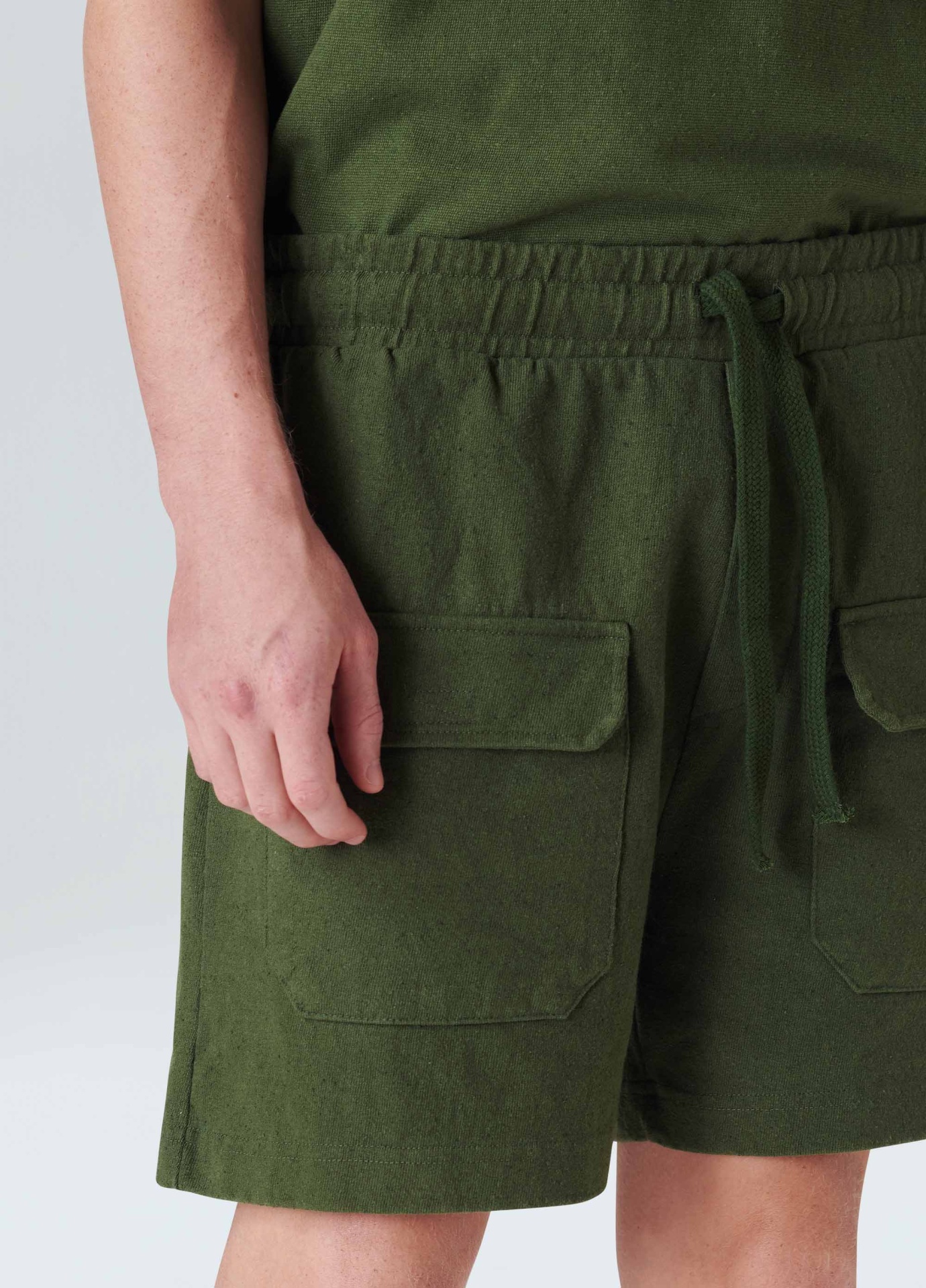 Bermuda masculina, E-Fabrics. Peça produzida com o reaproveitamento de resíduos têxteis, retalhos que são reciclados e tranformados em fio que dão origem a este produto, iniciativa que reduz o consumo de água e de produtos químicos e possui também amaciamento das fibras é feito com Andiroba Oil, desenvolvido a partir do óleo de andiroba, produzido em um processo orgânico e sustentável. Bandeira: Respect Our People e Re-design Waste.