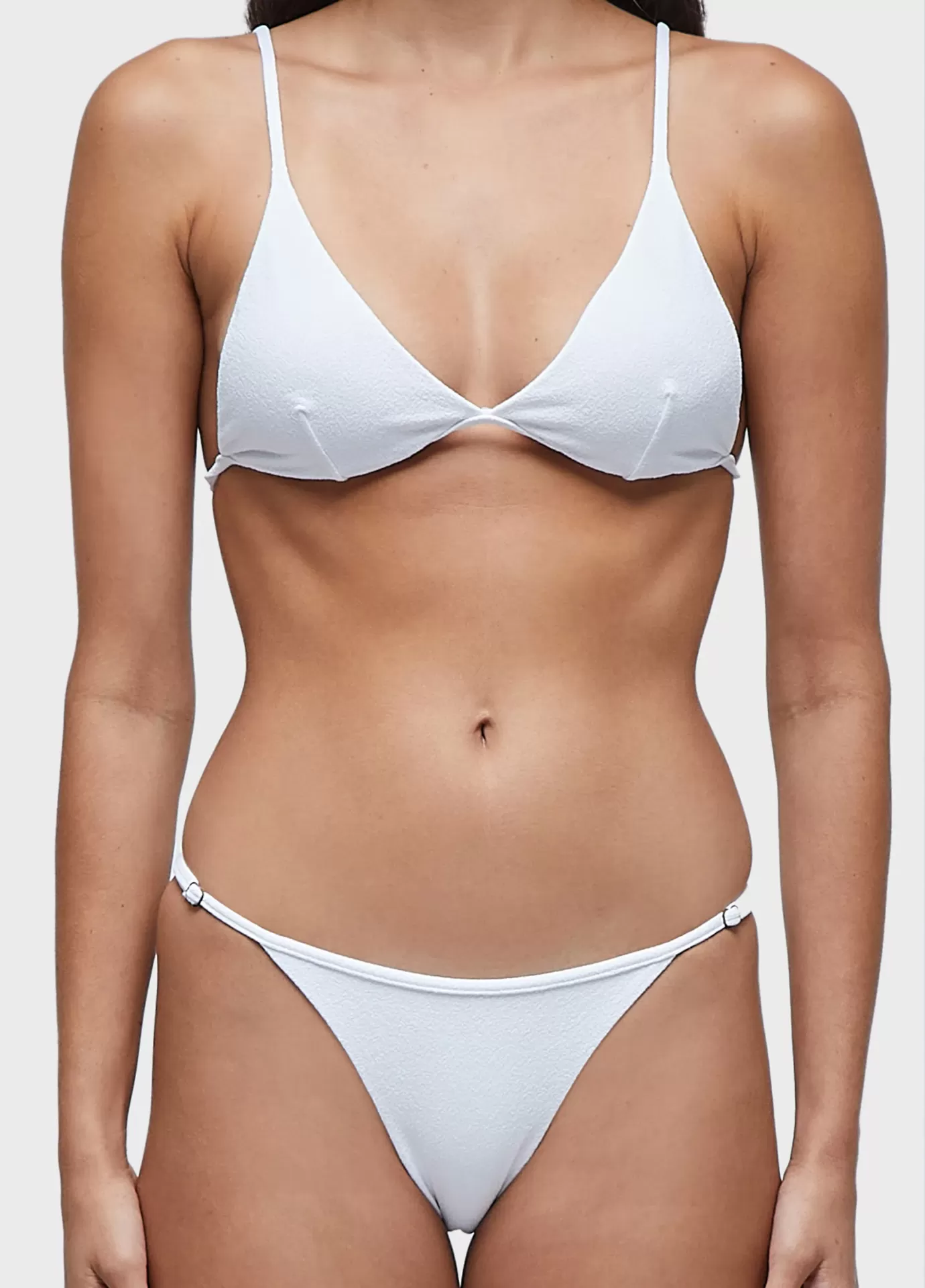 Top triângulo fixo e calcinha modelagem tanga com viés. tanto o rolotê da calcinha como do top são finos e possuem regulador para ajuste. desenvolvido em malha elástica com textura .forro em malha elástica leve.