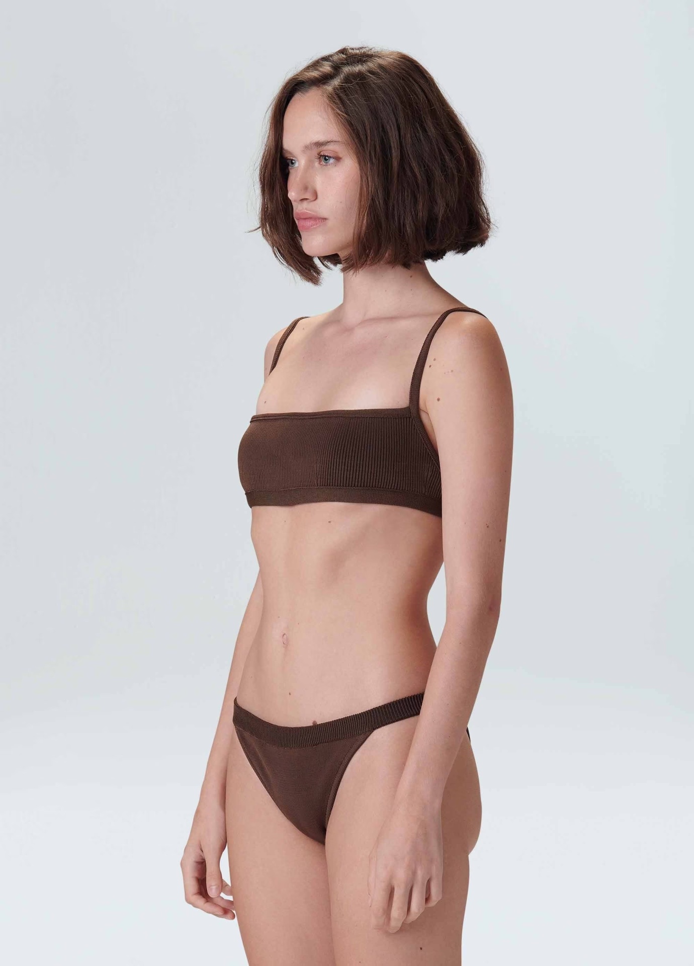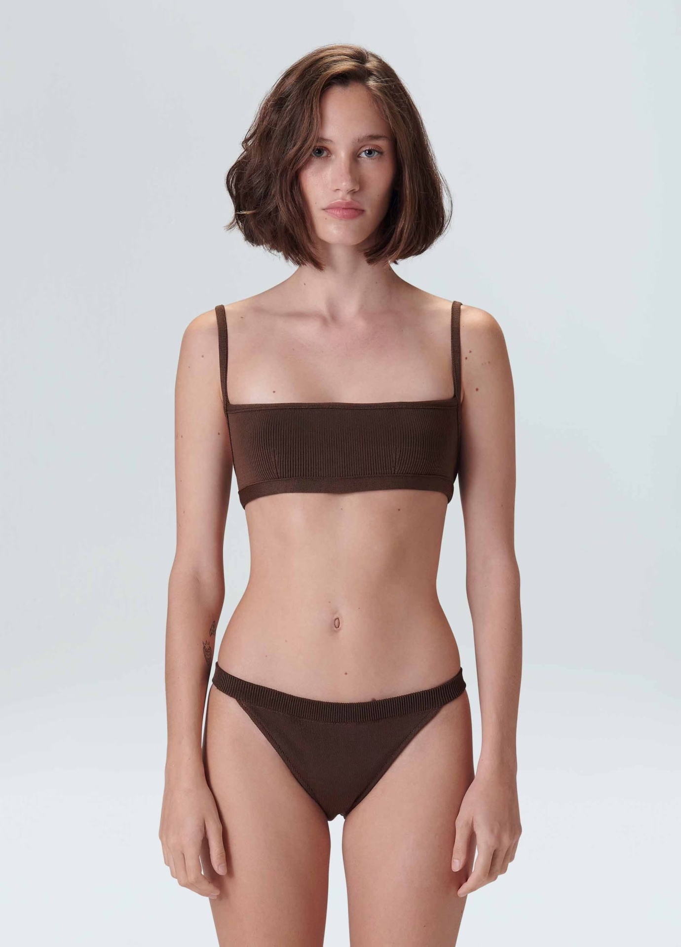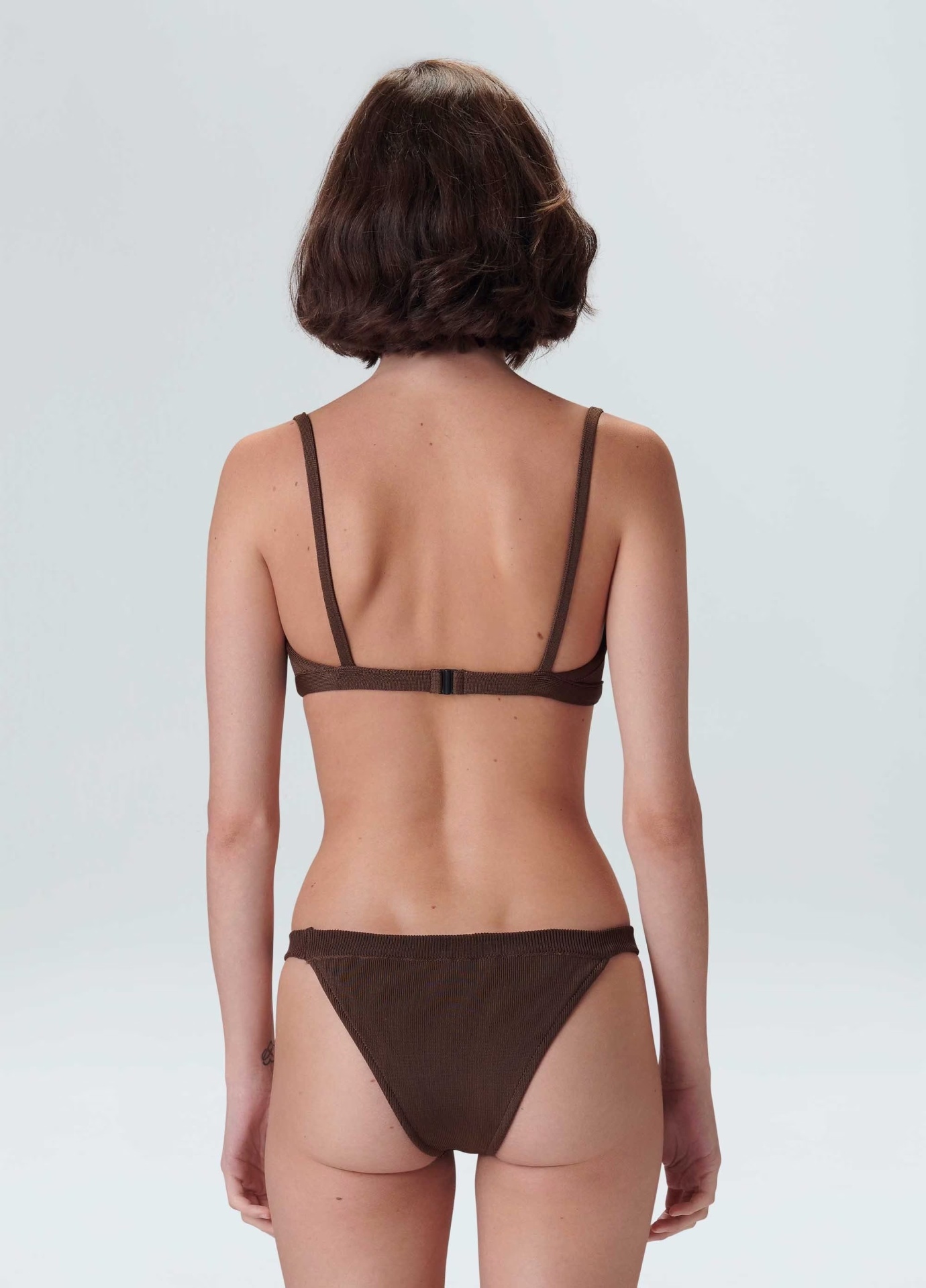 Biquíni de tricot canelado composto por top com decote reto e viés na base e calcinha com modelagem tanga, também com viés. O top possui fecho Osklen nas costas. Forro em malha elástica leve.