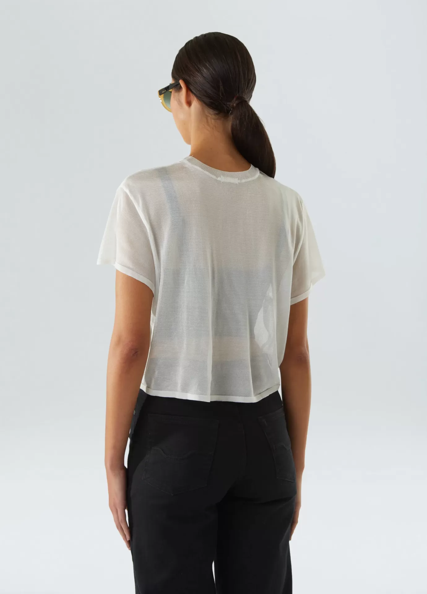 descrição Blusa manga curta de tricot feita com fio de rayon. a peça tem modelagem o