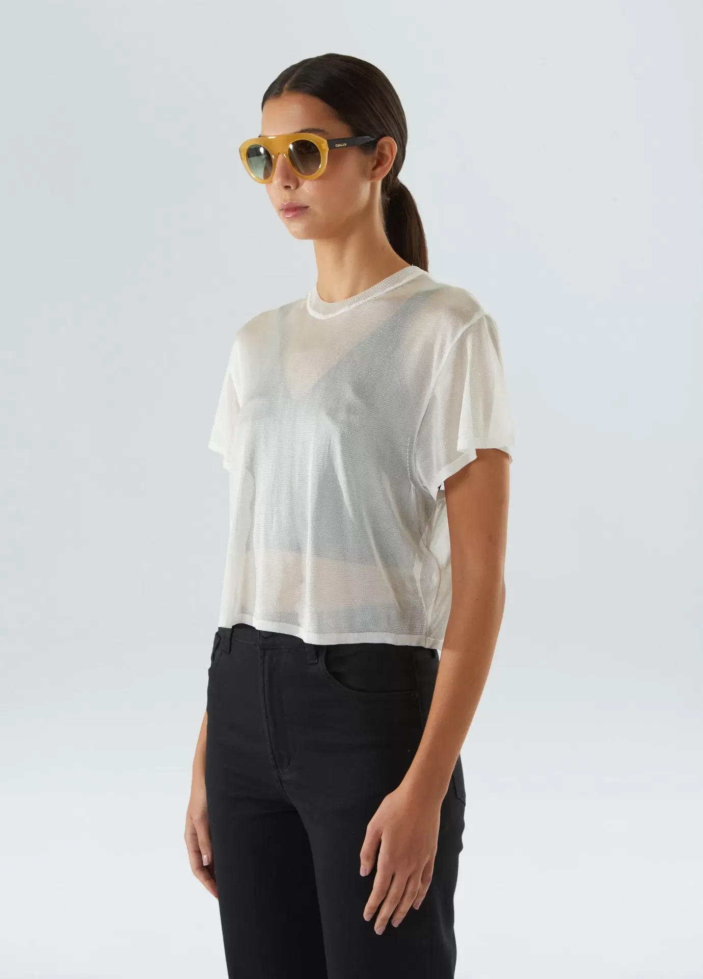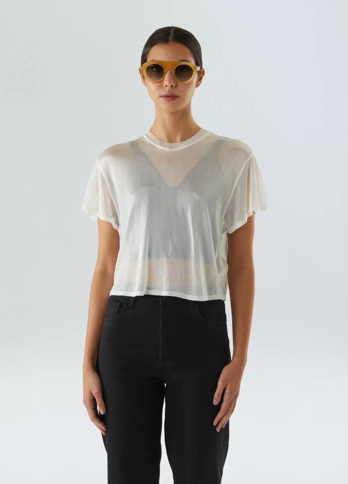 Blusa manga curta de tricot feita com fio de rayon. a peça tem modelagem oversized e transparência. acompanha um top decote v como combinação. o top é feito com fio de rayon com elastano.