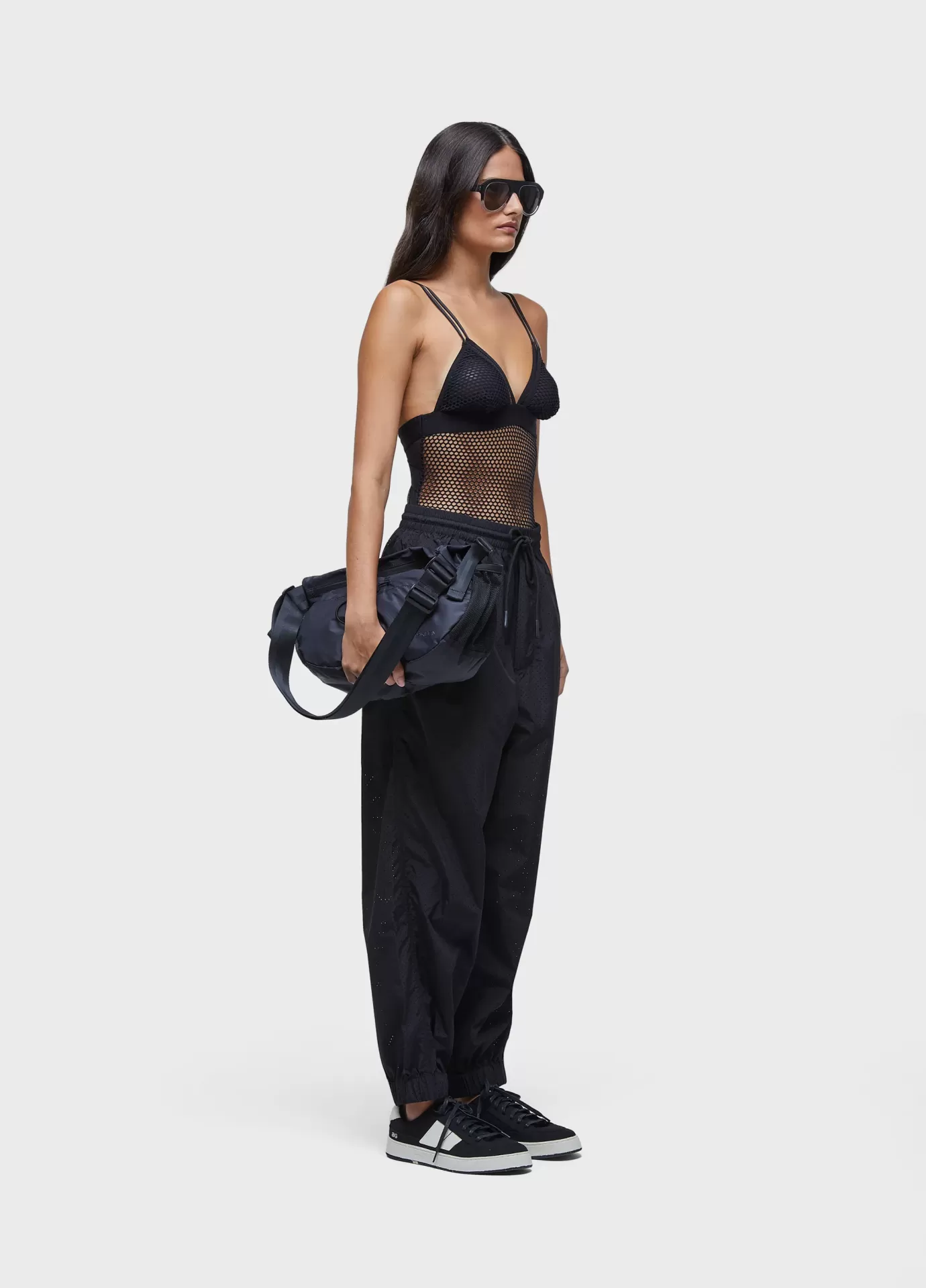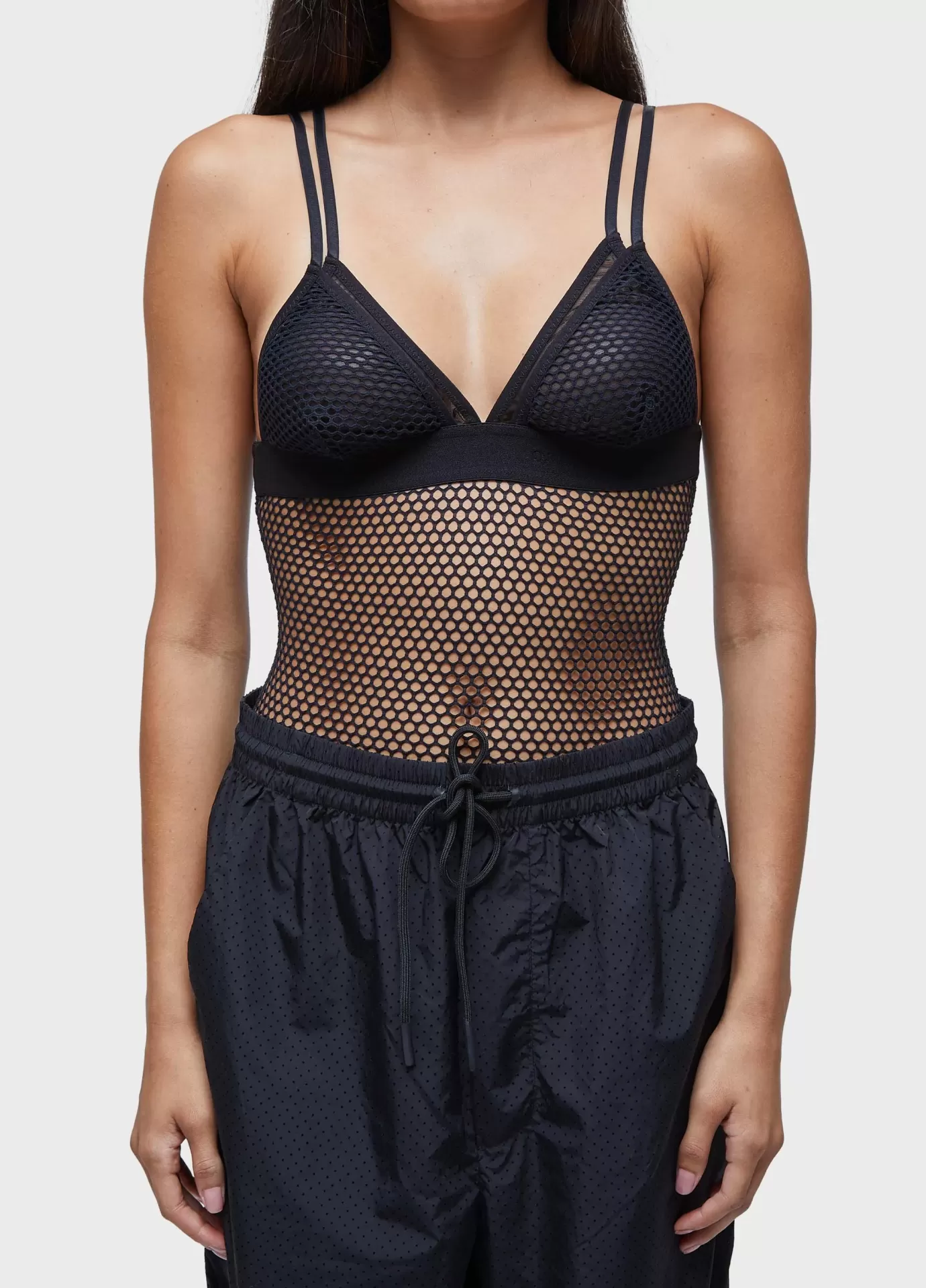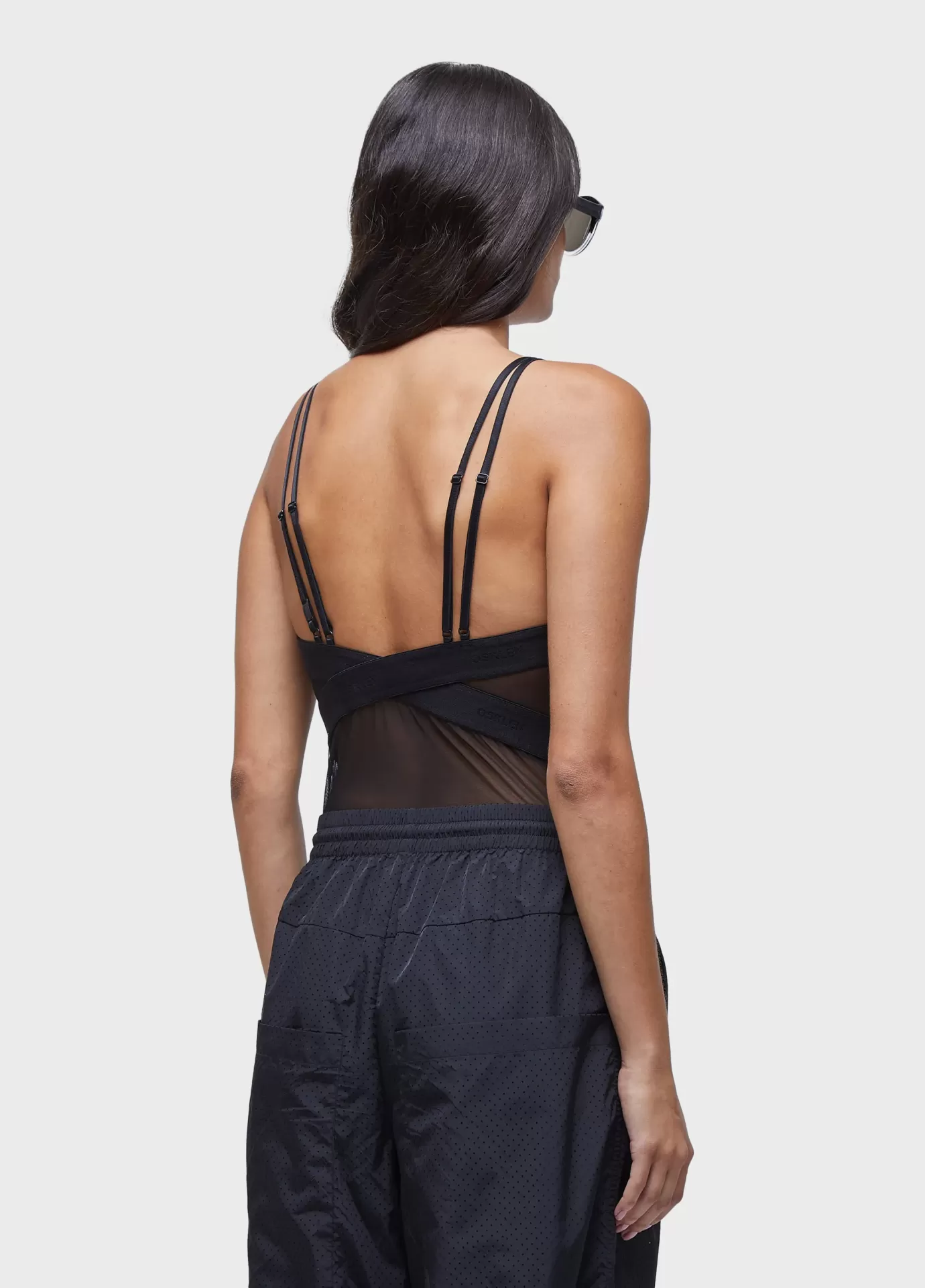 Body underwear com mix de materiais. a frente do body é feita de malha elástica em desenho de tela e as costas em tule elástico com transparência. o busto possui duas camadas, uma de tela e outra de tule, criando dois decotes sobrepostos. além disso, o body tem elástico osklen abaixo do peito e nas costas, com detalhe cruzado. alças reguláveis e fechamento com botão de pressão no entrepernas.