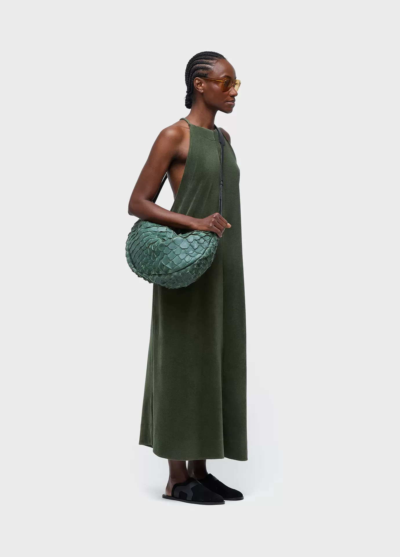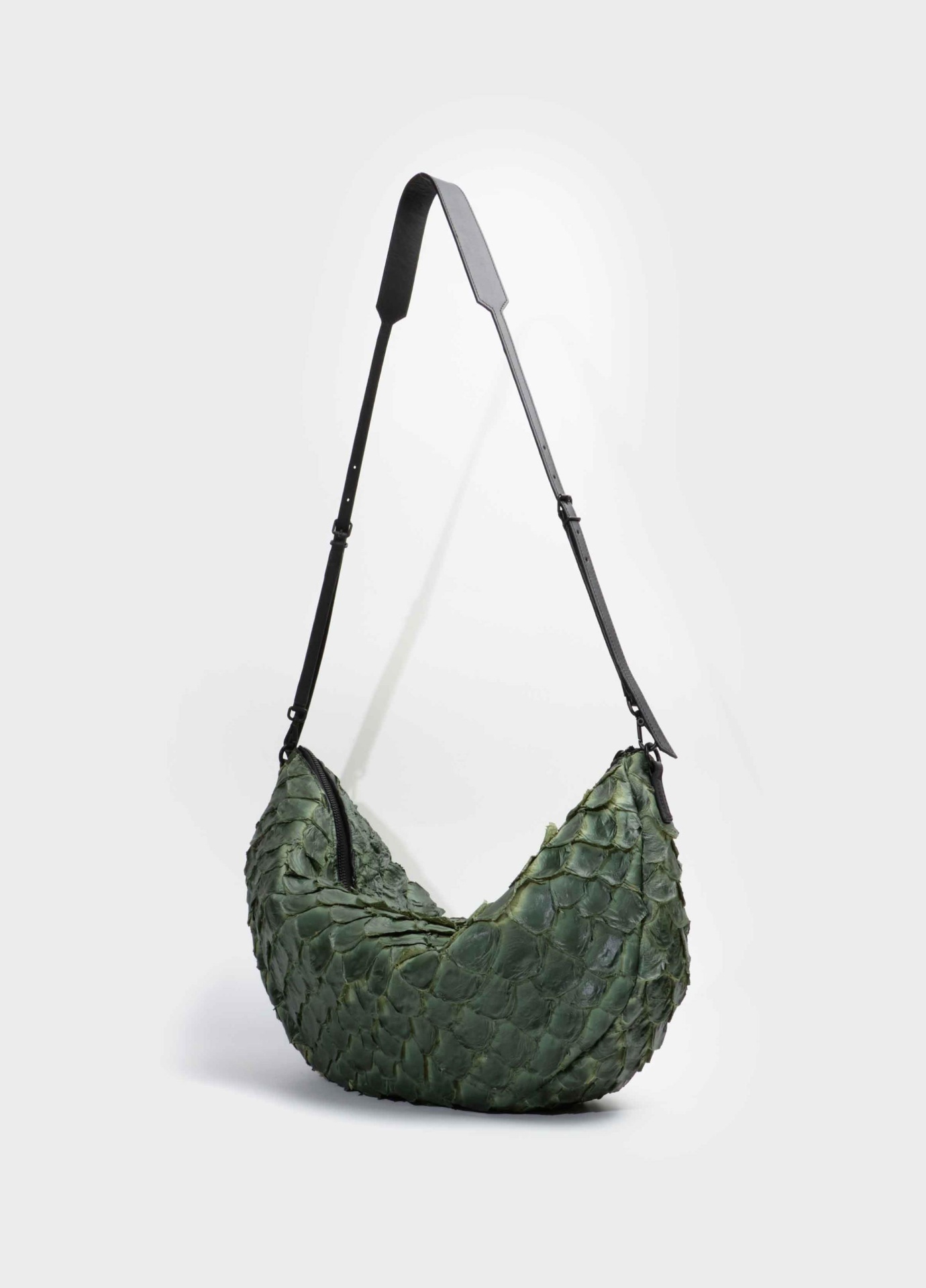 Bolsa em couro de pirarucu de tamanho médio, fechamento em zíper de metal, detalhes em couro bovino e forro em sarja 100% algodão. para que esta peça tivesse um super caimento, utilizamos uma pele de pirarucu com um novo tipo de acabamento, mais macio e suave.
