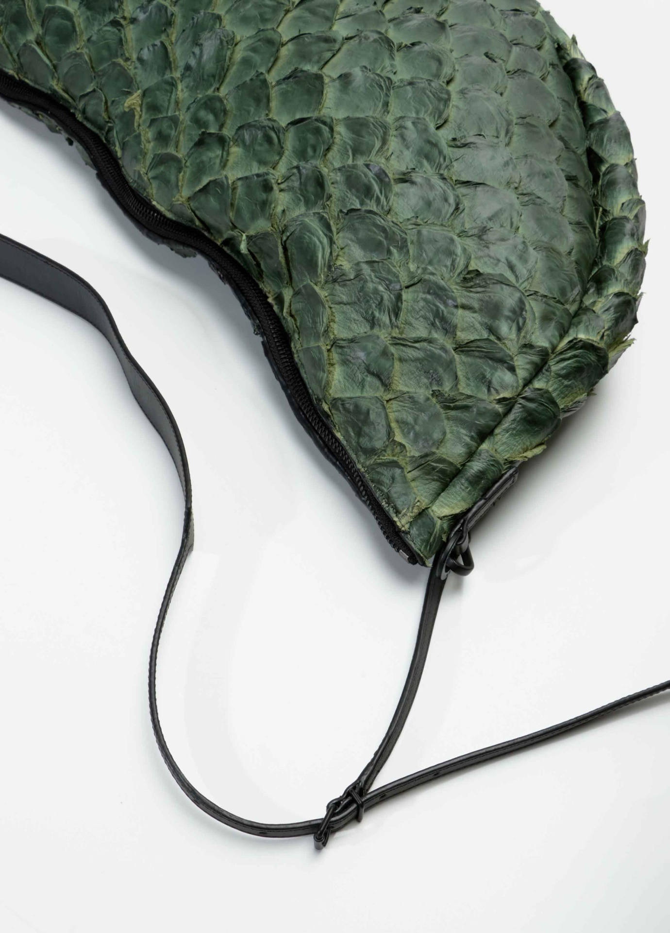 Bolsa em couro de pirarucu de tamanho médio, fechamento em zíper de metal, detalhes e