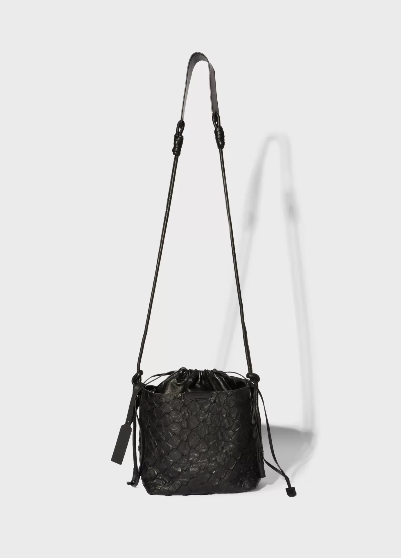 Bolsa em formato de balde de pirarucu com saquinho de couro, feita em couro de piraru