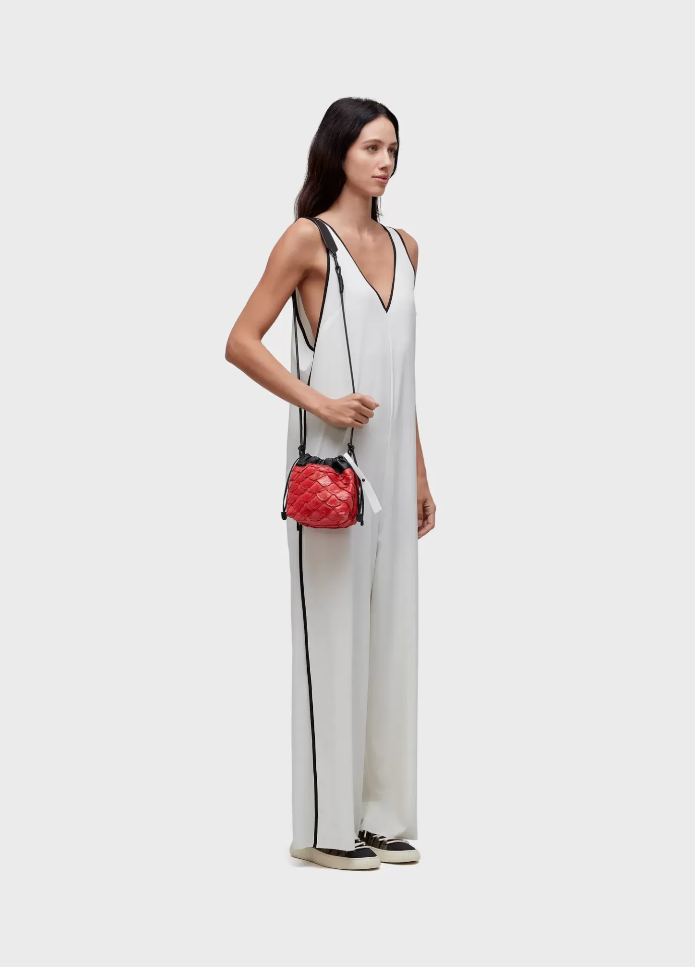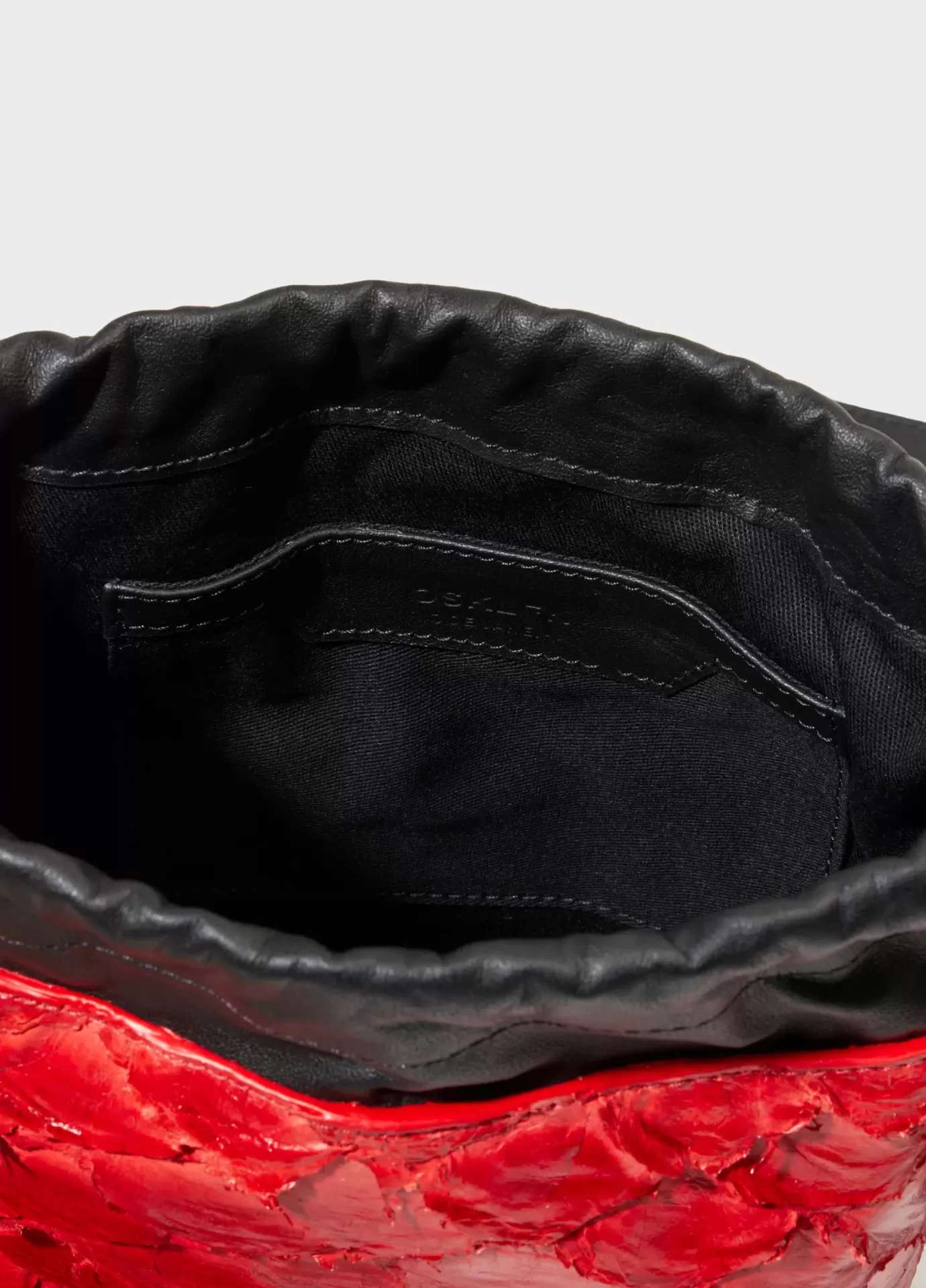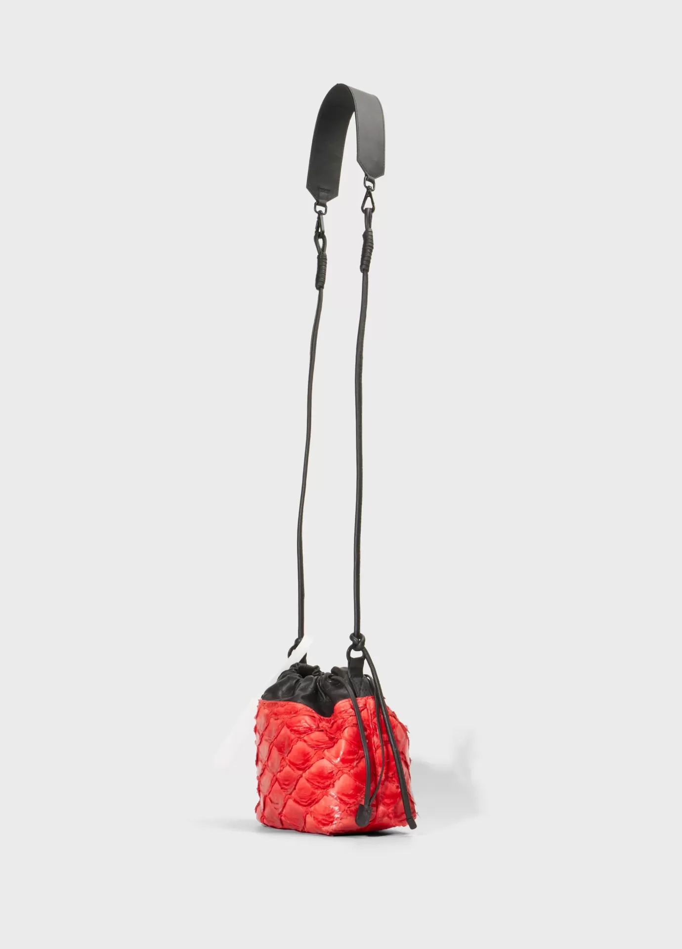 Bolsa em formato de saquinho, feita em couro de pirarucu e couro bovino, alça reguláv