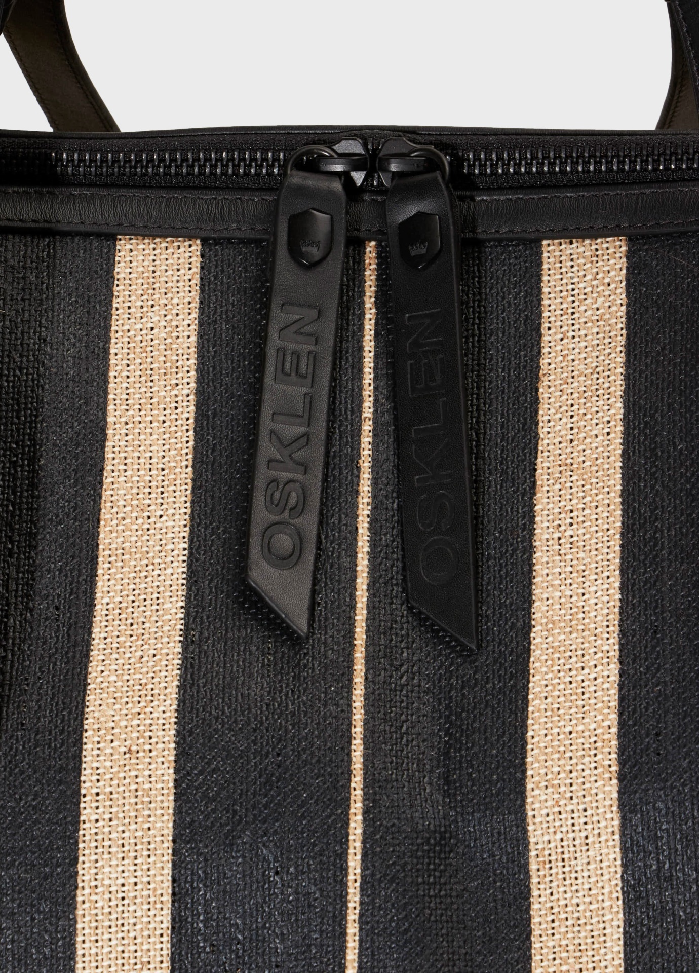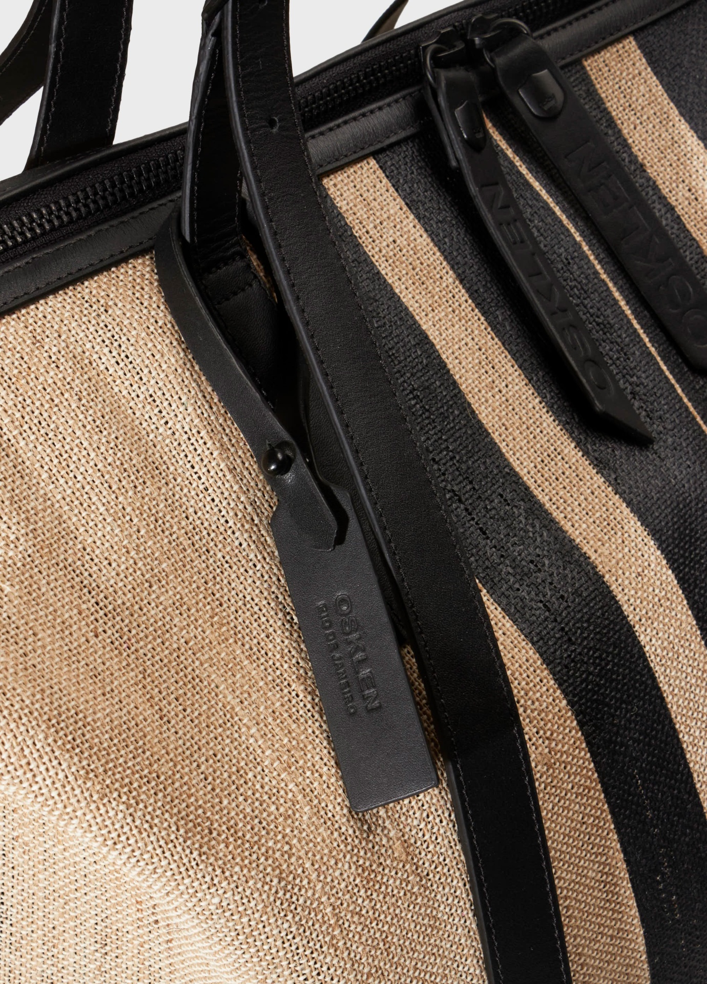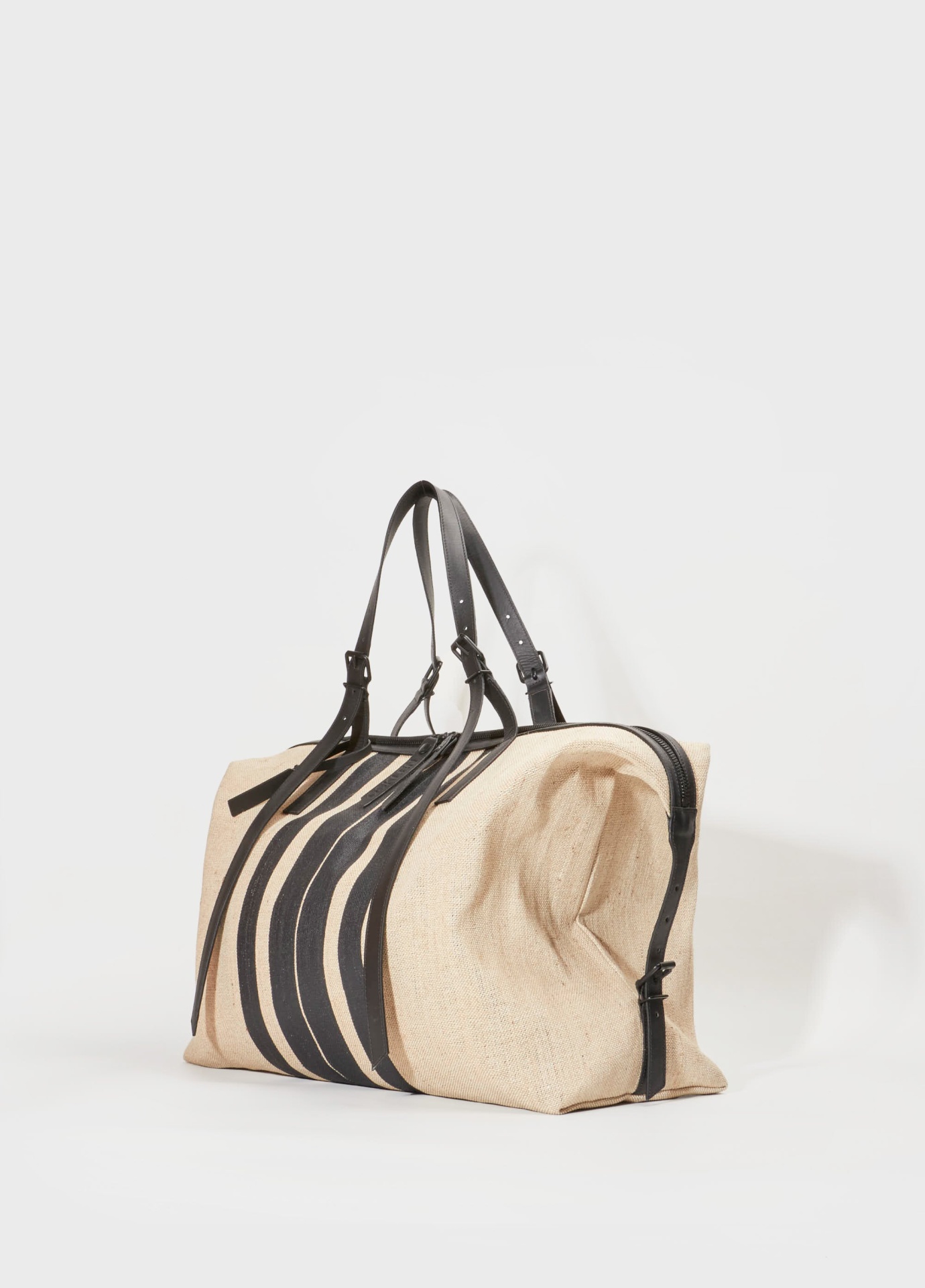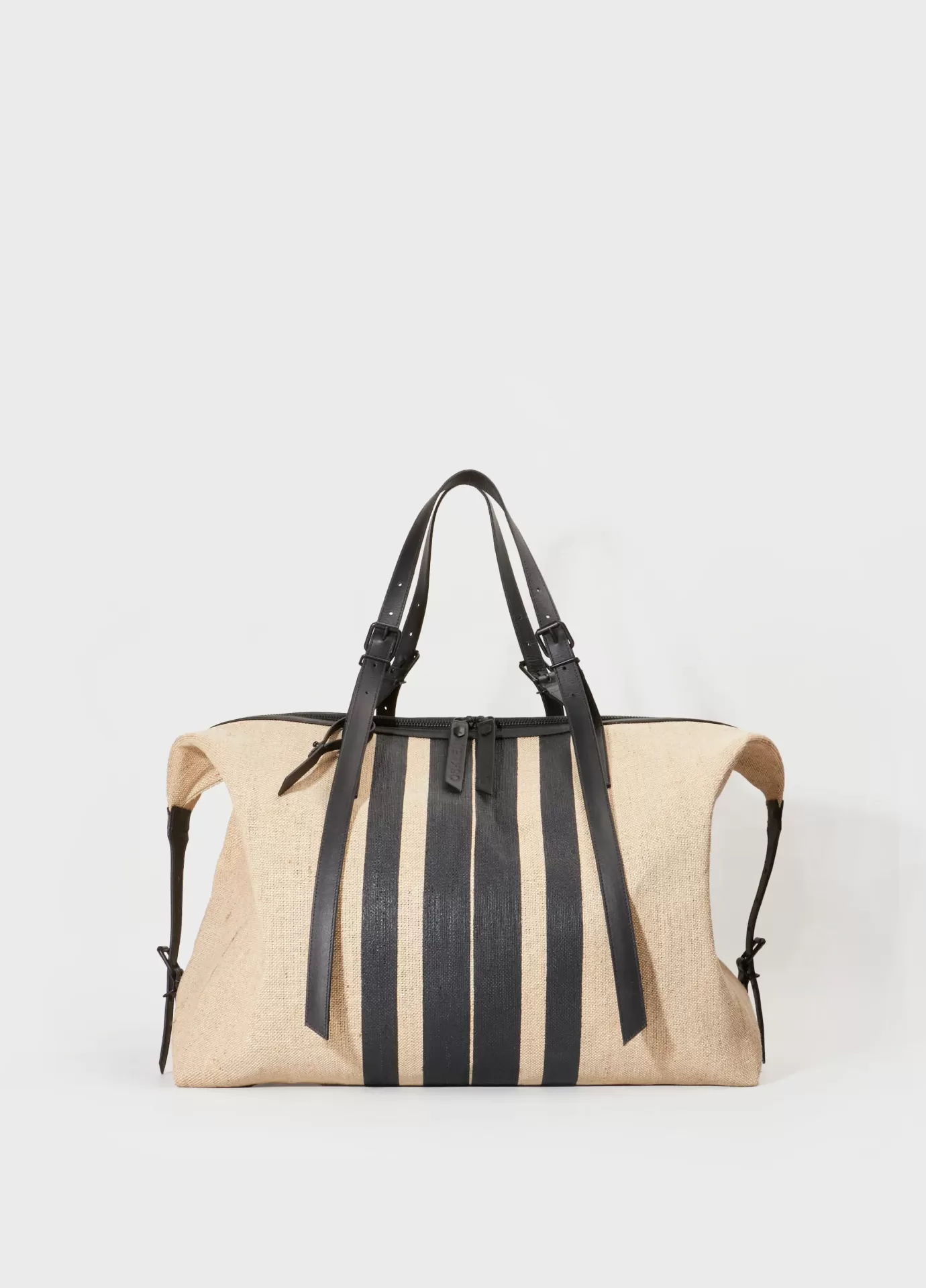 Mala de viagem estruturada feita em juta natural com acabamento texturizado e detalhes em couro preto. Apresenta design funcional com faixas verticais em couro que reforçam a estrutura e criam contraste visual marcante. Possui duas alças superiores ajustáveis, alça longa removível e fechamento em zíper metálico duplo com puxadores personalizados.