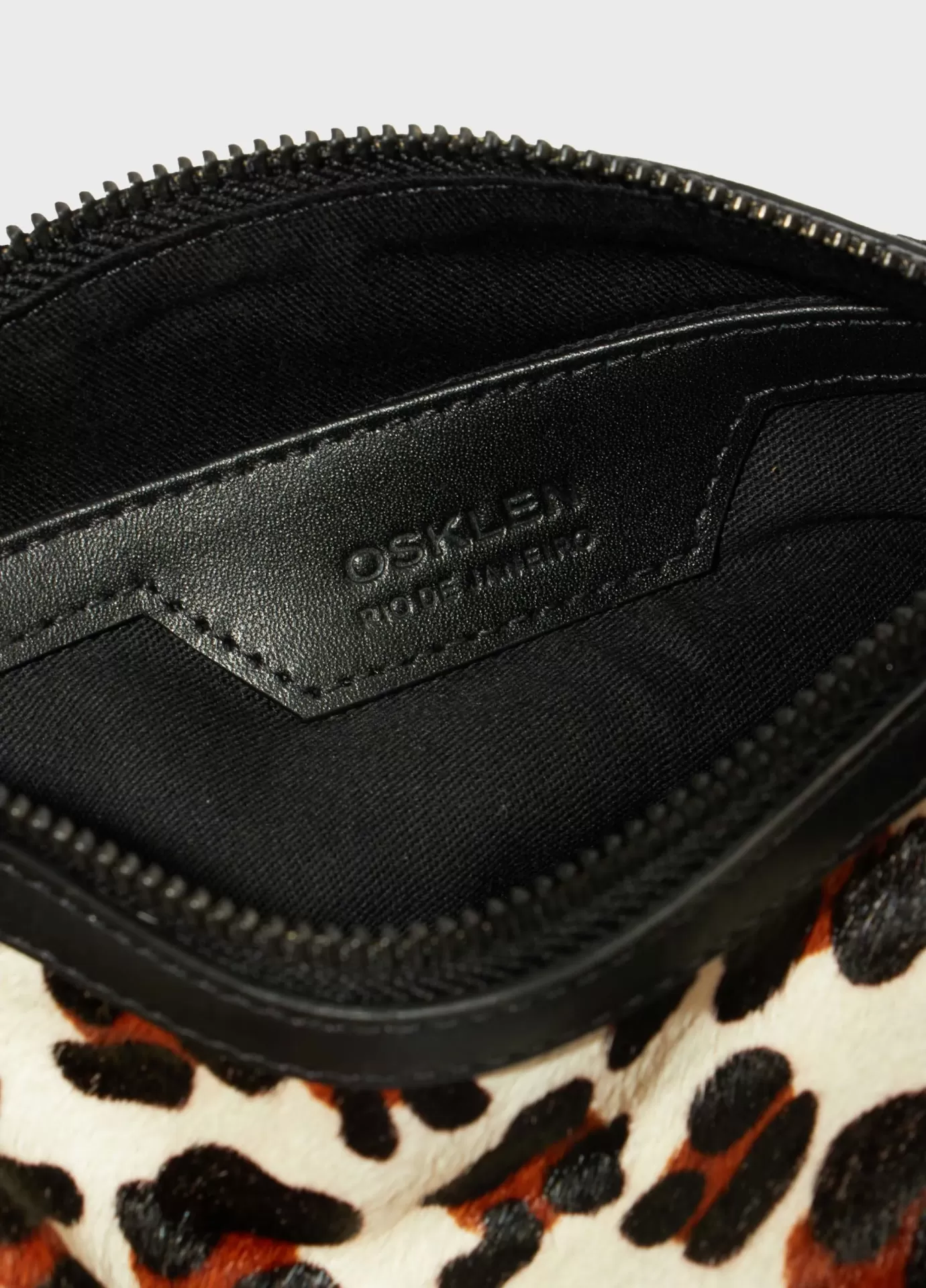 Bolsa feita em pelo bovino estampado, com forro de sarja 100% algodão e alças de couro bovino. Bolsa de tamanho pequeno, com fechamento de ziper. Alça com dois usos, podendo usá-la como bolsa de mão ou transpassada no corpo.