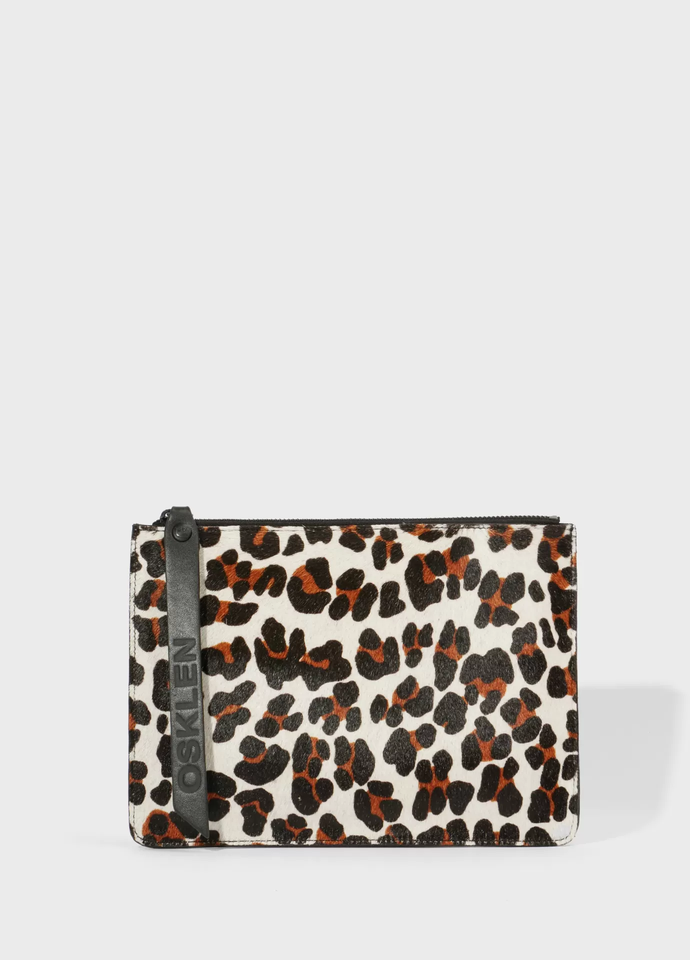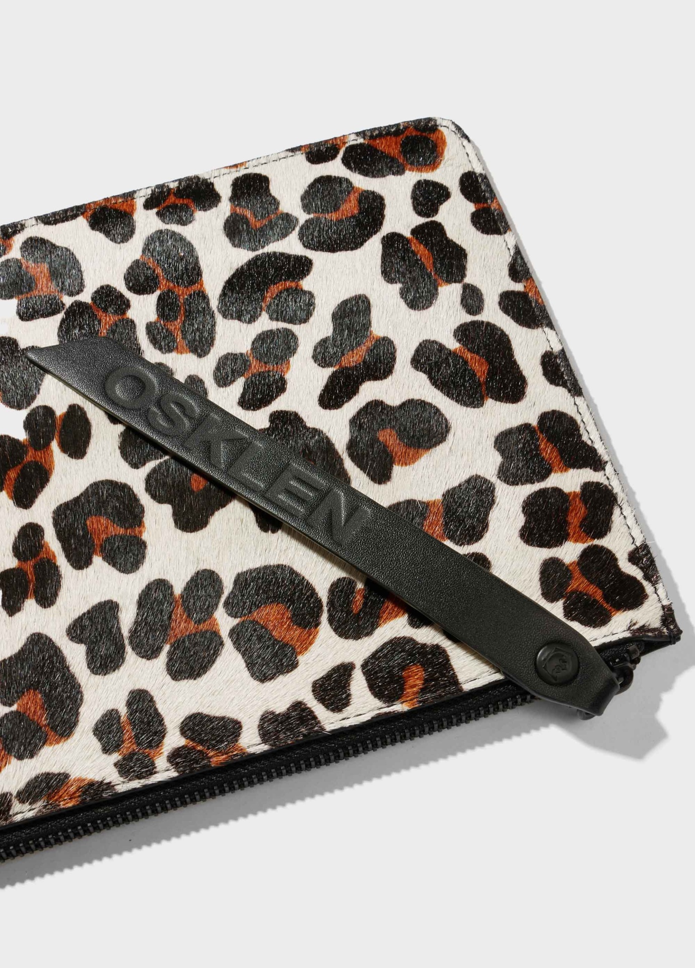 Bolsa modelo pouch feita em pelo bovino estampado, com forro de sarja 100% algodão. Bolsa de tamanho pequeno, modelo flat e fechamento em zíper. Assinatura Osklen no puxador de couro do zíper.