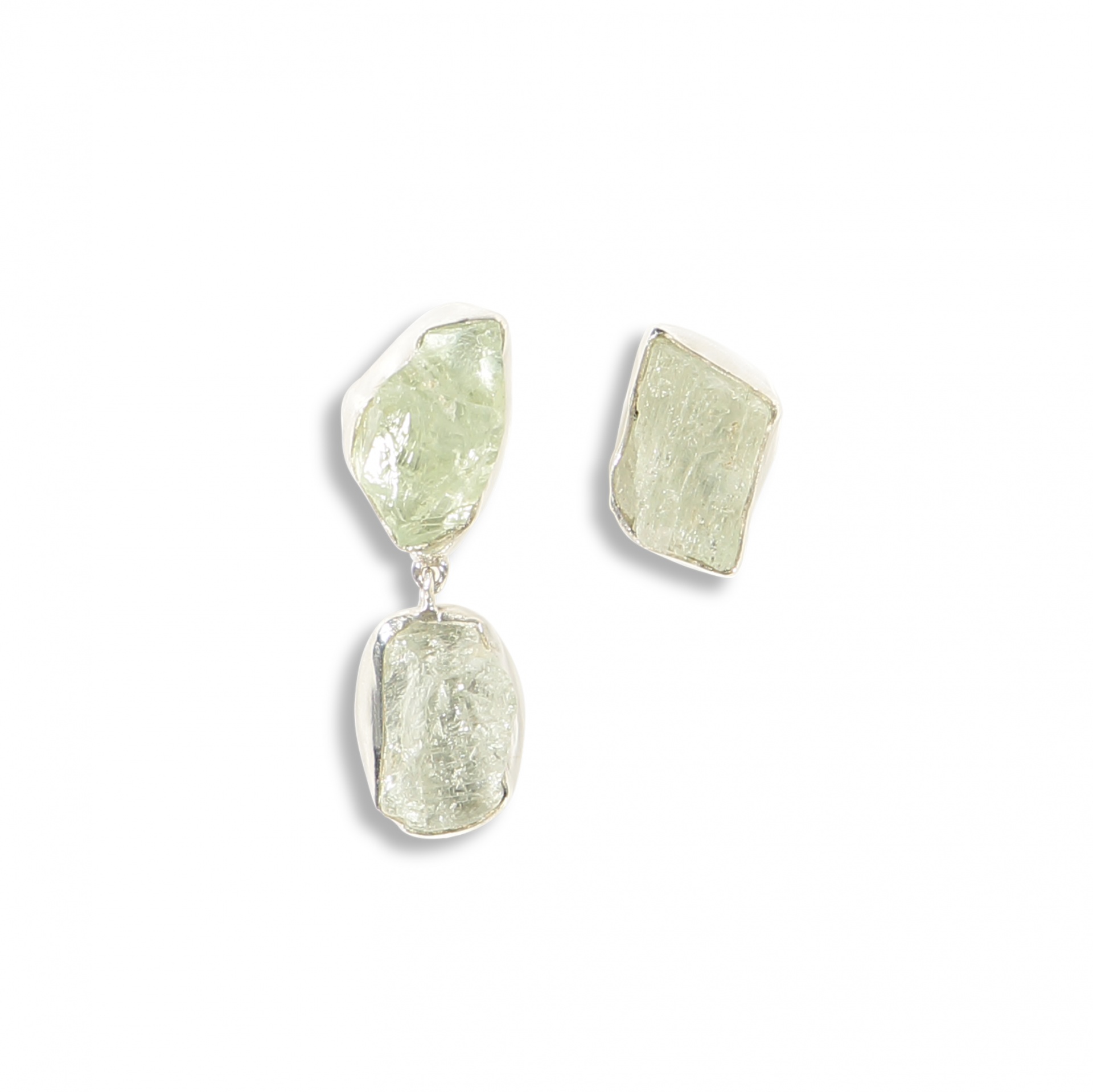 Brincos assimétricos com pedras verdes translúcidas em prata
