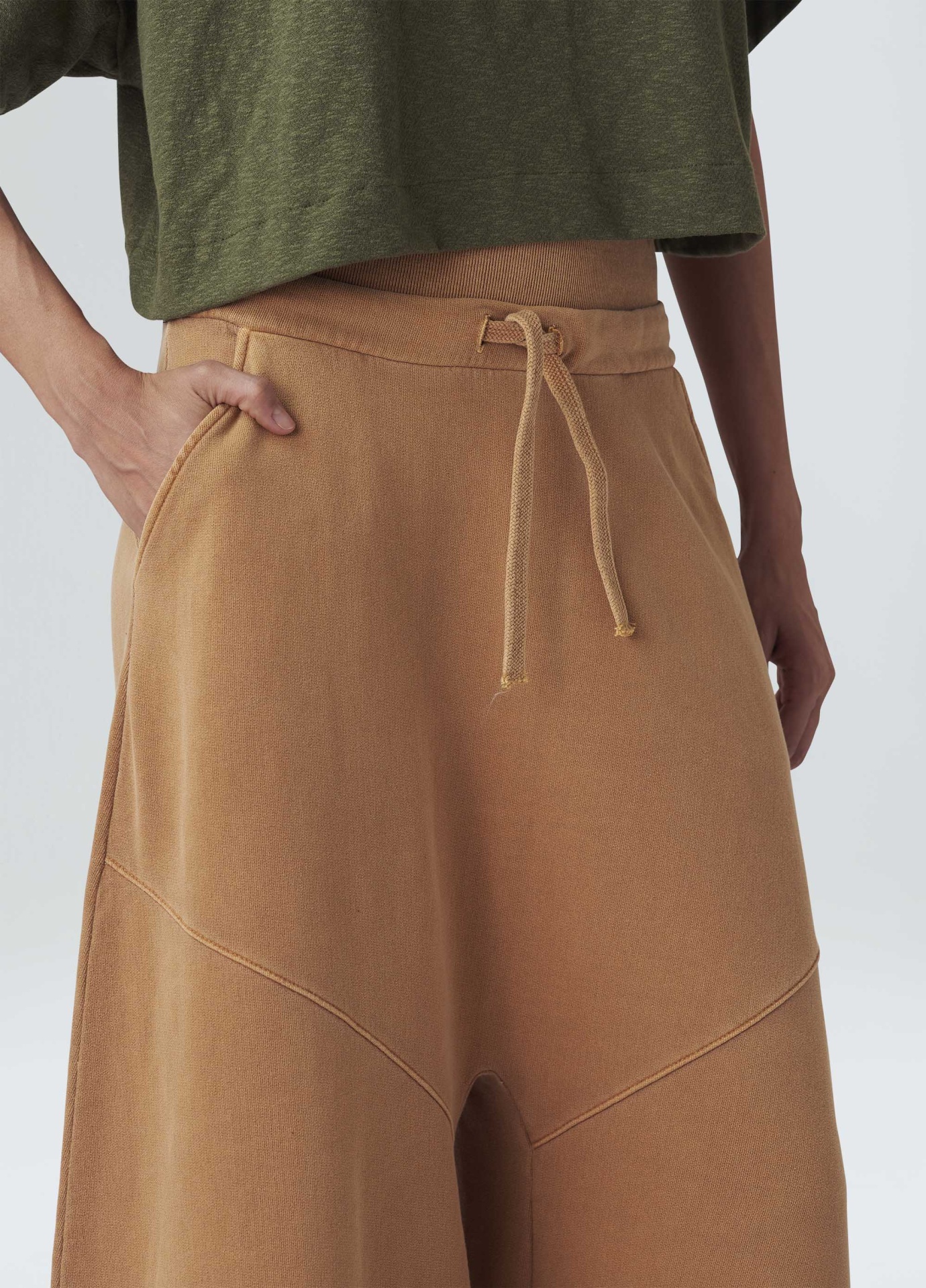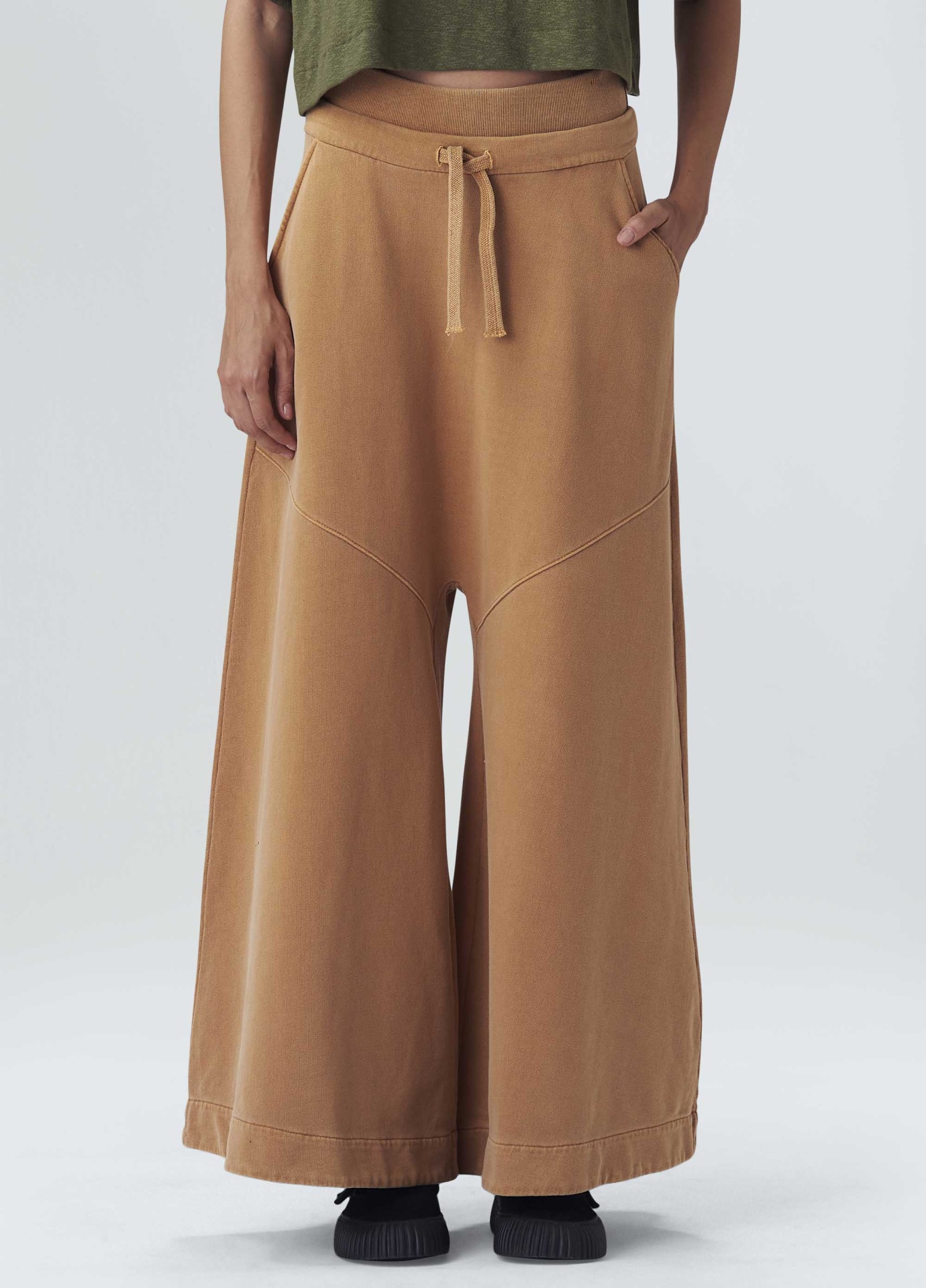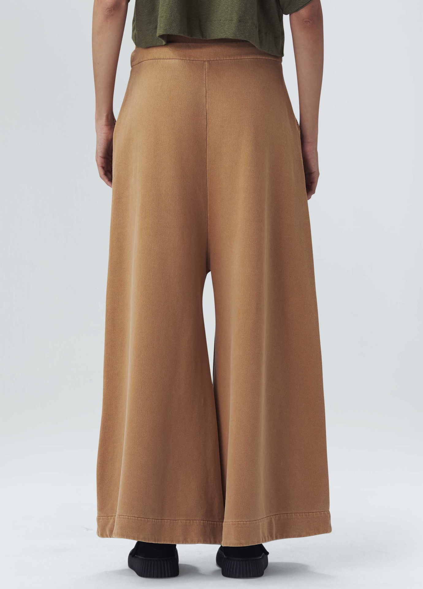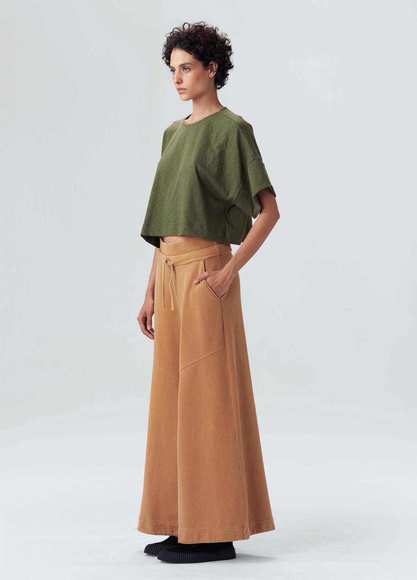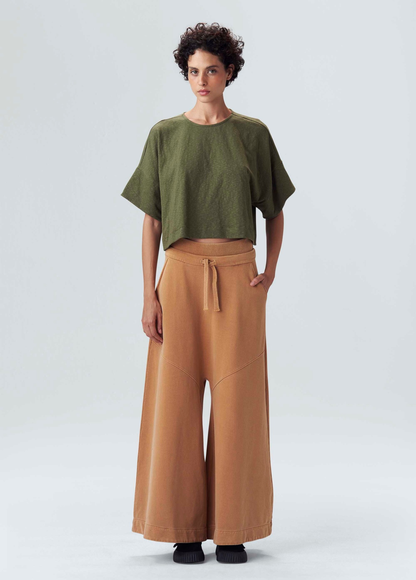 Calça feminina de moletom. A peça tem cintura alta com cós duplo, um de elástico e um com cadarço. Sua modelagem é ampla, criando uma silhueta em A. Essa é uma peça Regenerate Life + Respect our People, pois foi produzida com a técnica de tingimento Eco Dye, cujo processo reduz em cerca de 50% o consumo de água e energia elétrica em comparação aos tingimentos tradicionais. Além disso, faz parte do projeto Amazon Sense: um amaciante e aroma natural desenvolvido com matérias-primas oriundas da Amazônia, como o óleo de andiroba, copaíba, cumaru e estoraque. Essa iniciativa contribui para a manutenção da floresta de pé e beneficia mais de 800 pessoas envolvidas na produção. Composição: 100% algodão.