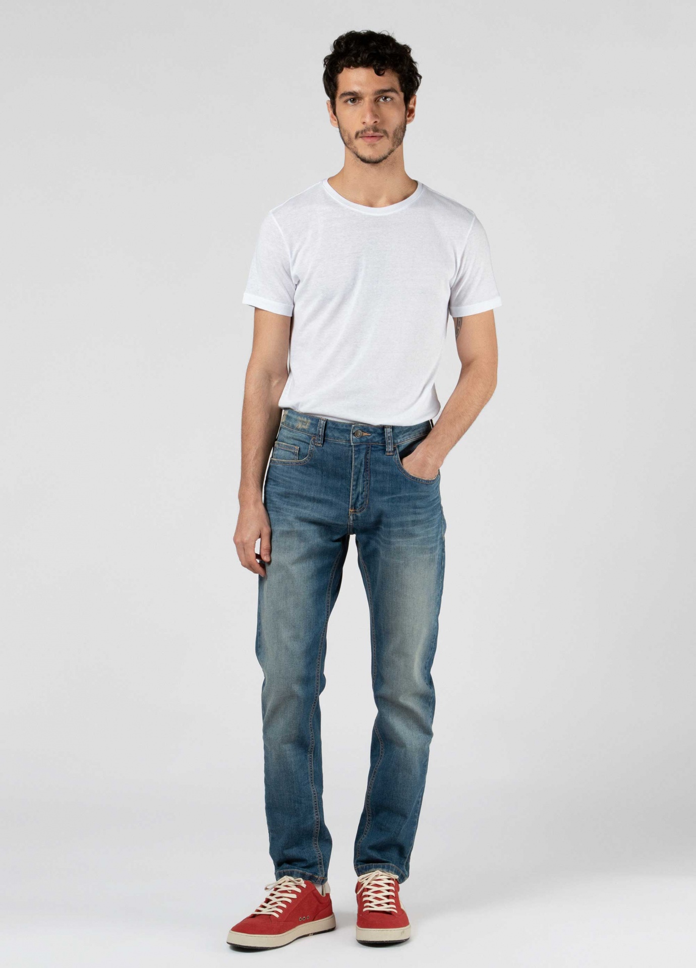 Modelagem Fit, ajustada ao corpo. Tecido denim com elastano, para dar conforto. Lavagem diferenciada com aspecto gasto. Processos de lavagem manuais.