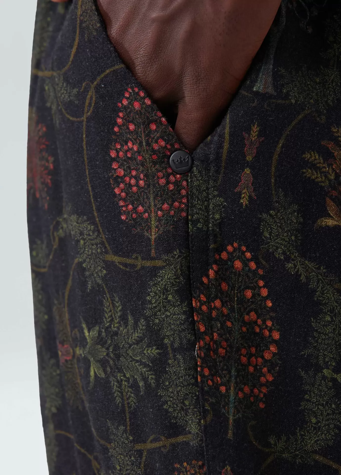Calça masculina. feita a partir de um e-fabric de fibras recicladas e algodão. essa peça foi produzida através do reaproveitamento de resíduos têxteis, que são reciclados e transformados em um novo tecido, promovendo o upcycling e a economia circular.