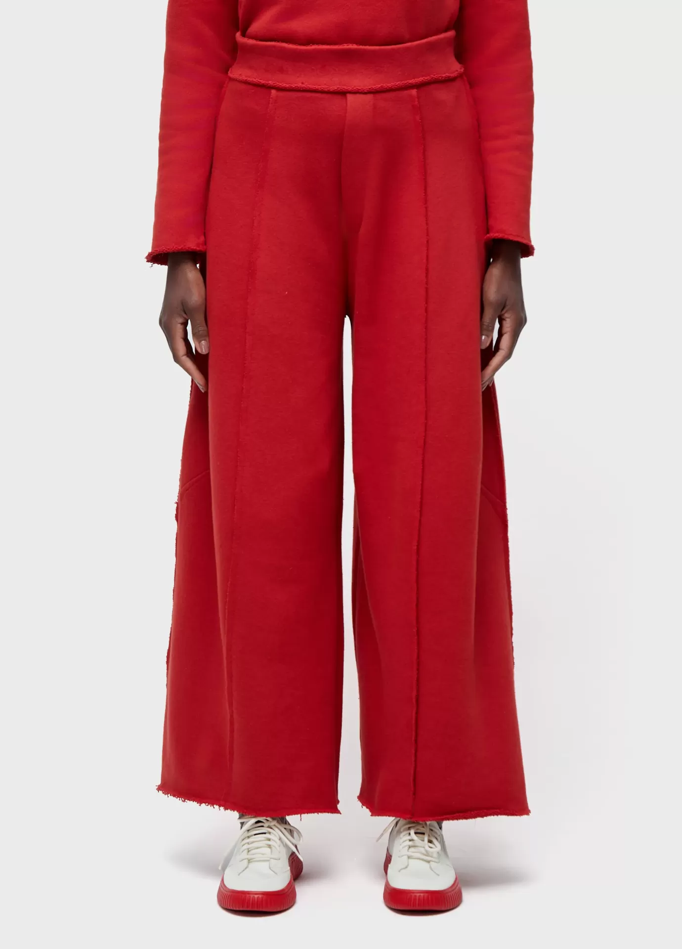 Calça feminina com cós de elástico e cintura alta; modelagem ampla; peça double face: lado com textura e outro liso; feito em moletom com fibras recicladas e amaciadas com menta orgânica. bandeira rw - recycled fibers + organic mint wash