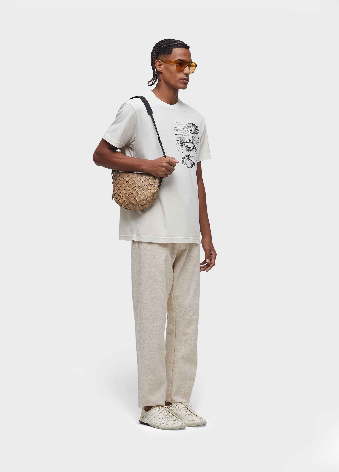 Calça e-basics em malhão rústico e-fabrics com algodão reciclado, proveniente da sobra de resíduos têxteis. essa peça promove a economia circular. durante o processo, as fibras são separadas por cor e desfibradas para criação de novos fios. dessa forma,