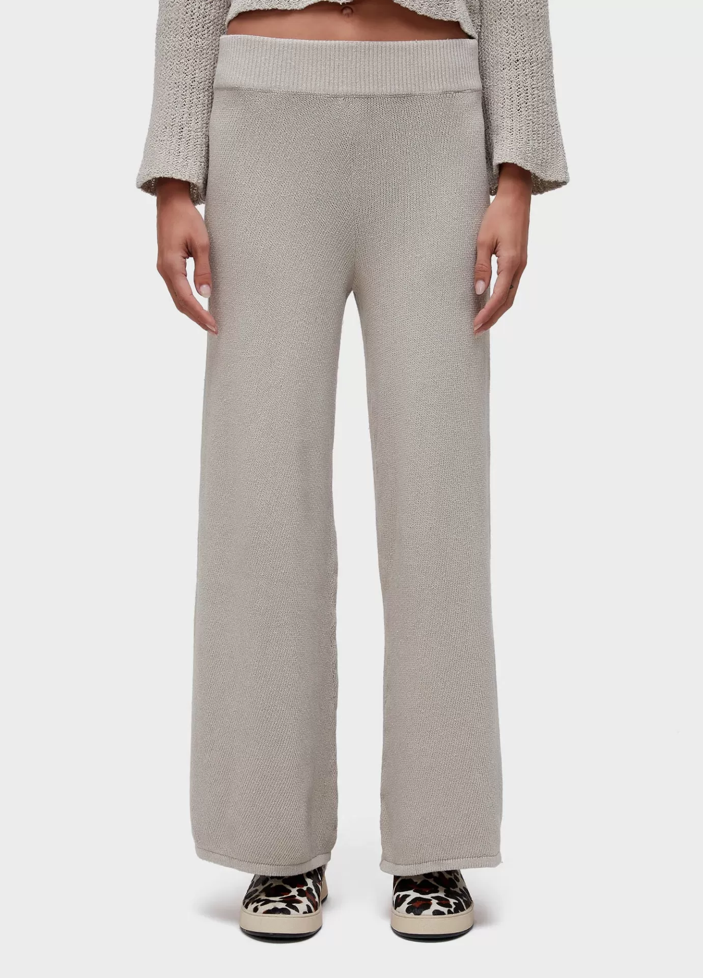 Calça de modelagem reta feita de tricot, desenvolvida com fio de algodão reciclado. B
