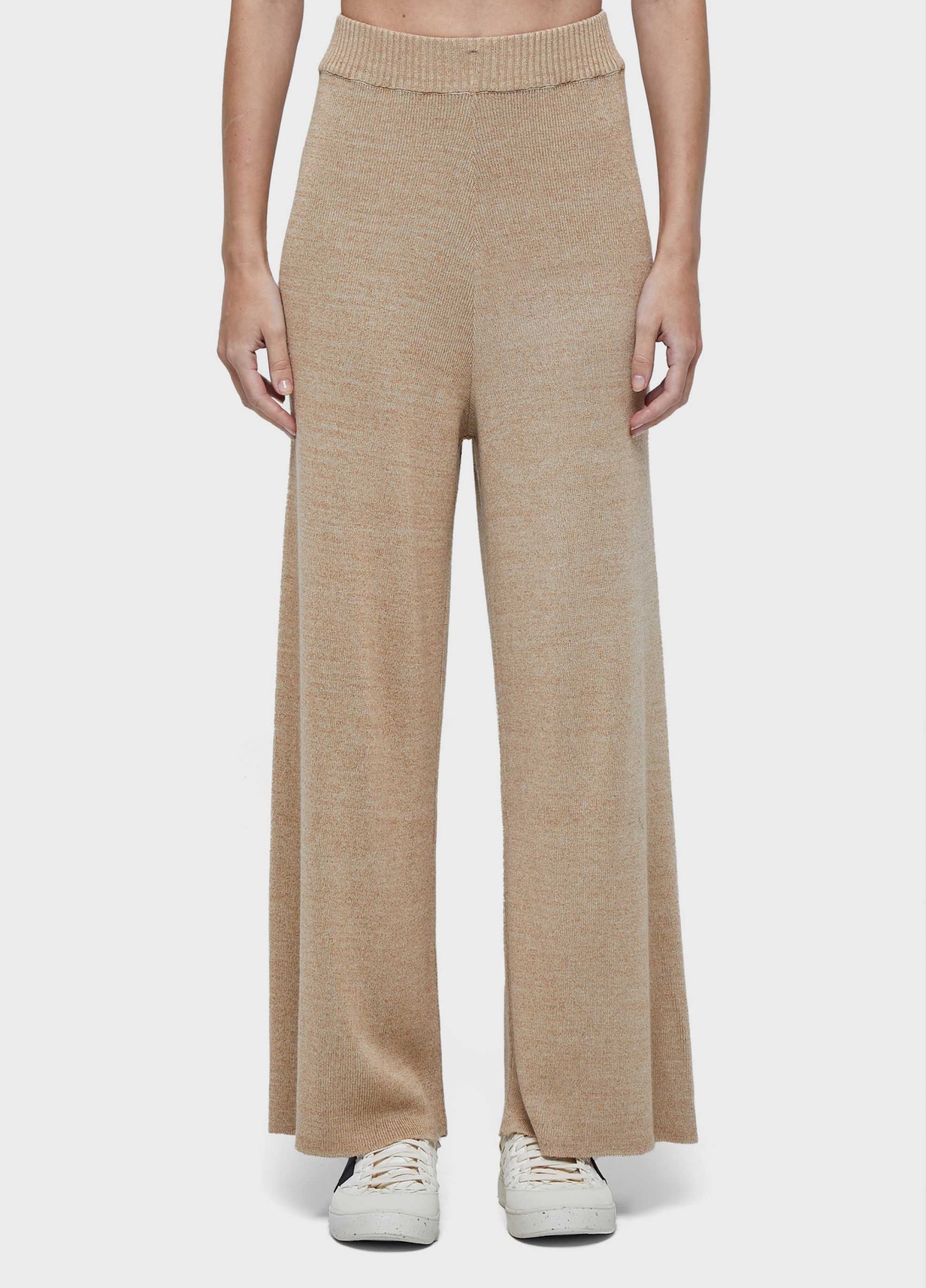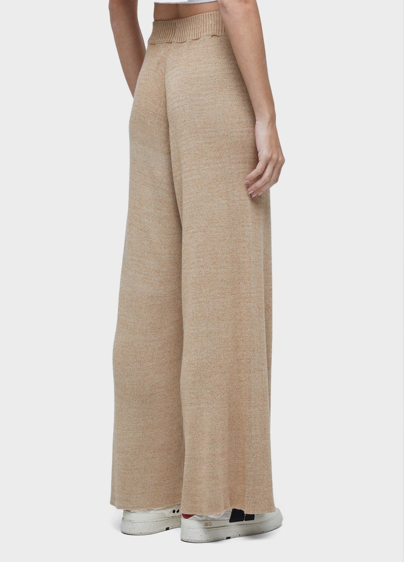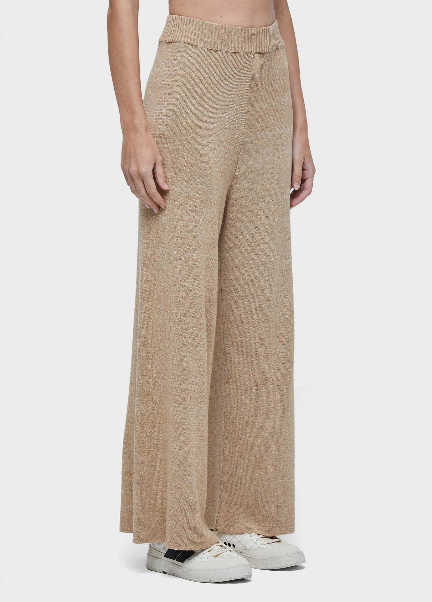 Calça de tricot feita com fio de cortiça. a peça possui modelagem reta e cós aplicado