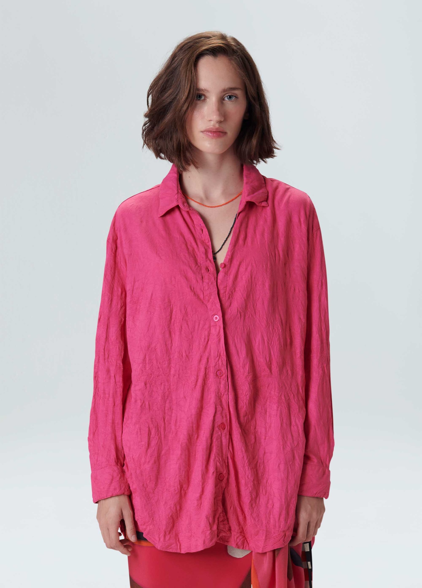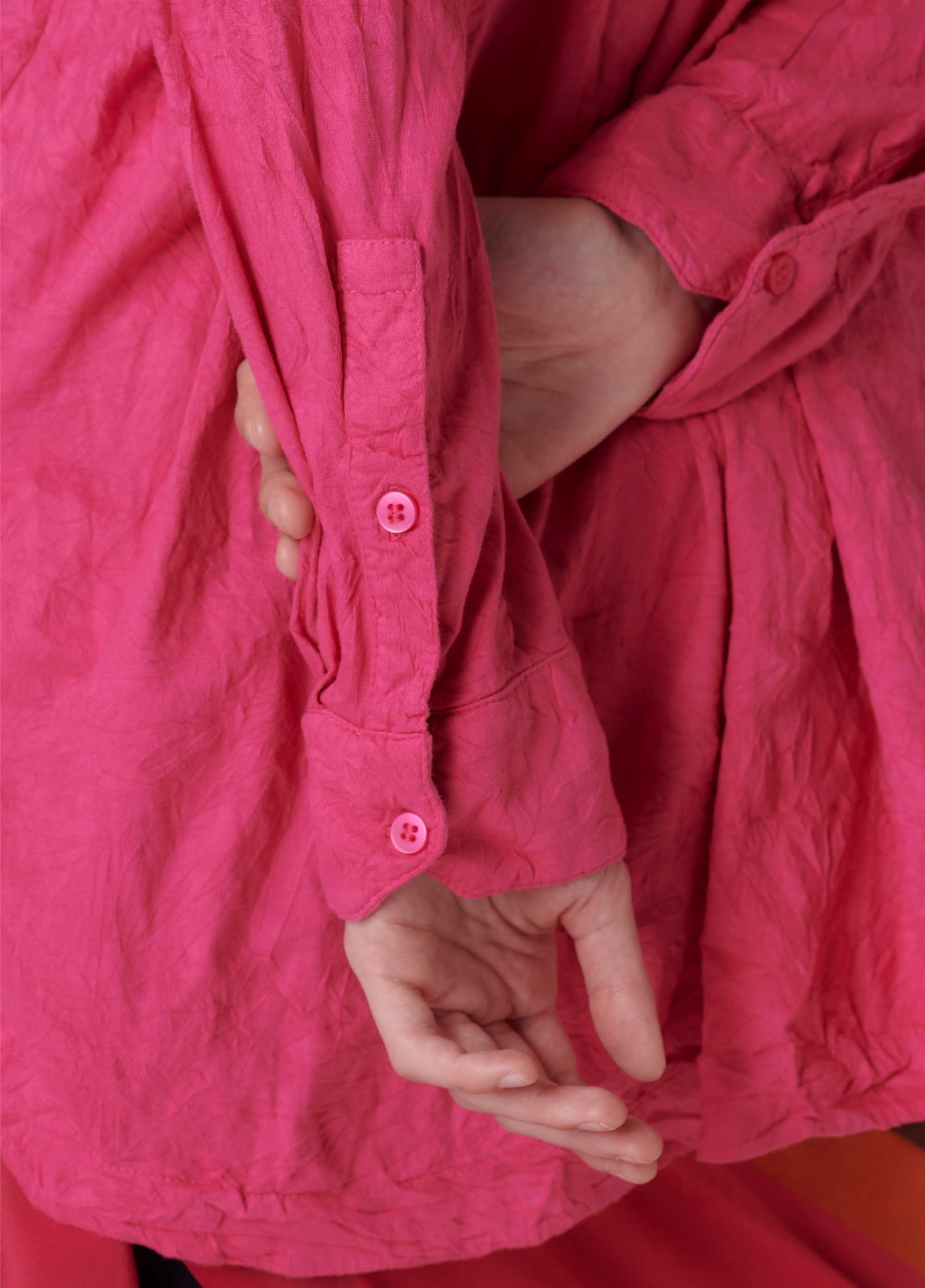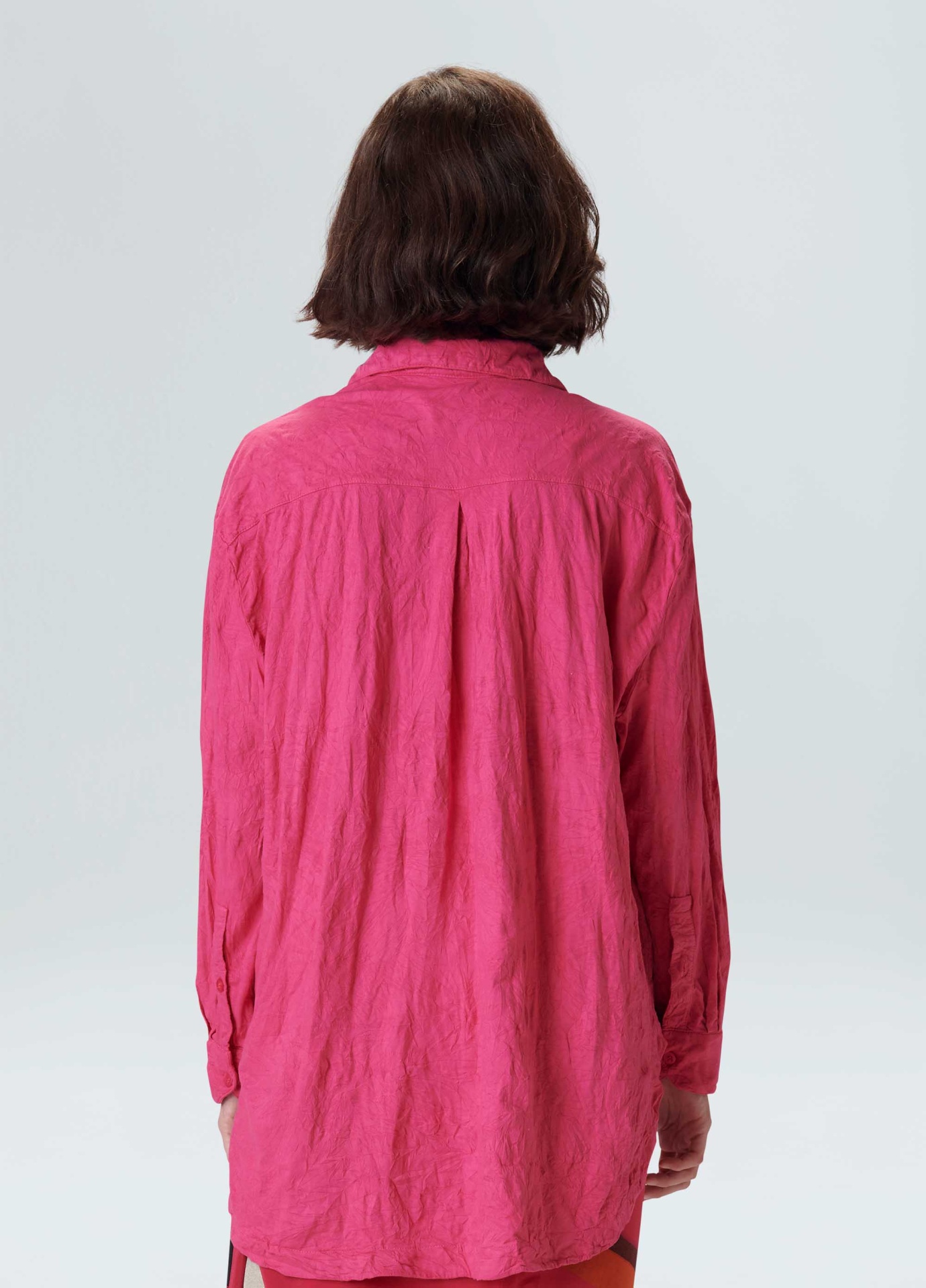 Camisa feminina feita em malha de algodão. A peça possui fechamento de botões no centro frente, gola e punho de camisaria e modelagem ampla. A camisa é resinada amassada e vem em um saquinho de malha para guardar a peça enrolada em formato de nó, mantendo sua característica amassada. Não passar a peça. Essa é uma peça Regenerate Life, pois foi produzida com algodão nacional certificado seguindo critérios minuciosos de redução dos impactos ambientais e sociais durante seu cultivo. Seu processo produtivo utiliza energia renovável, reduz o consumo de água e fomenta as cadeias produtivas brasileiras.
