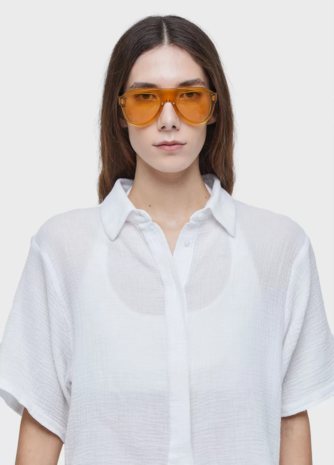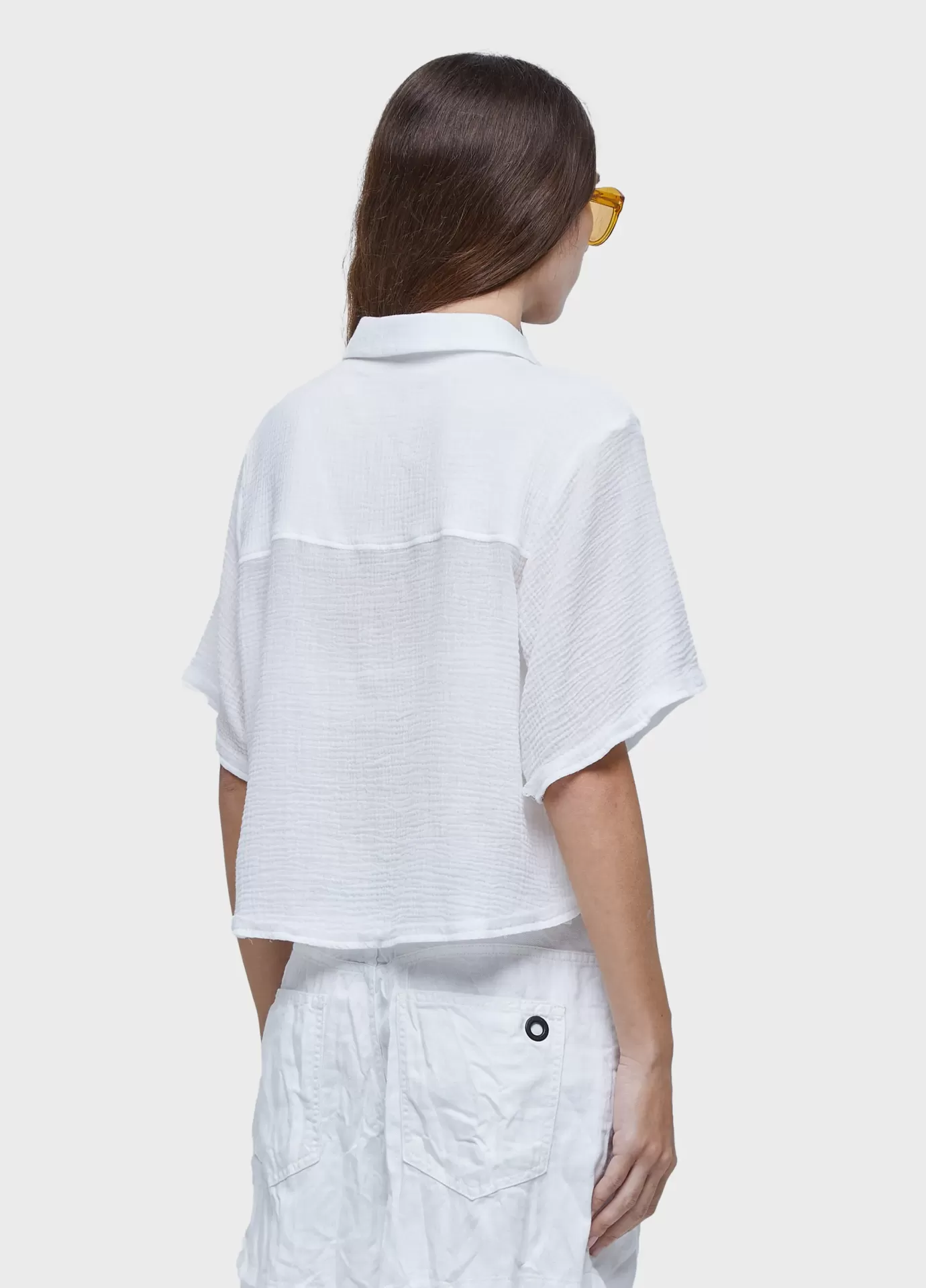 Camisa de modelagem quadradinha, com ombros largos e comprimento curto. abotoamento frontal. acabamento desfiado. tecido finíssimo texturizado de algodão.