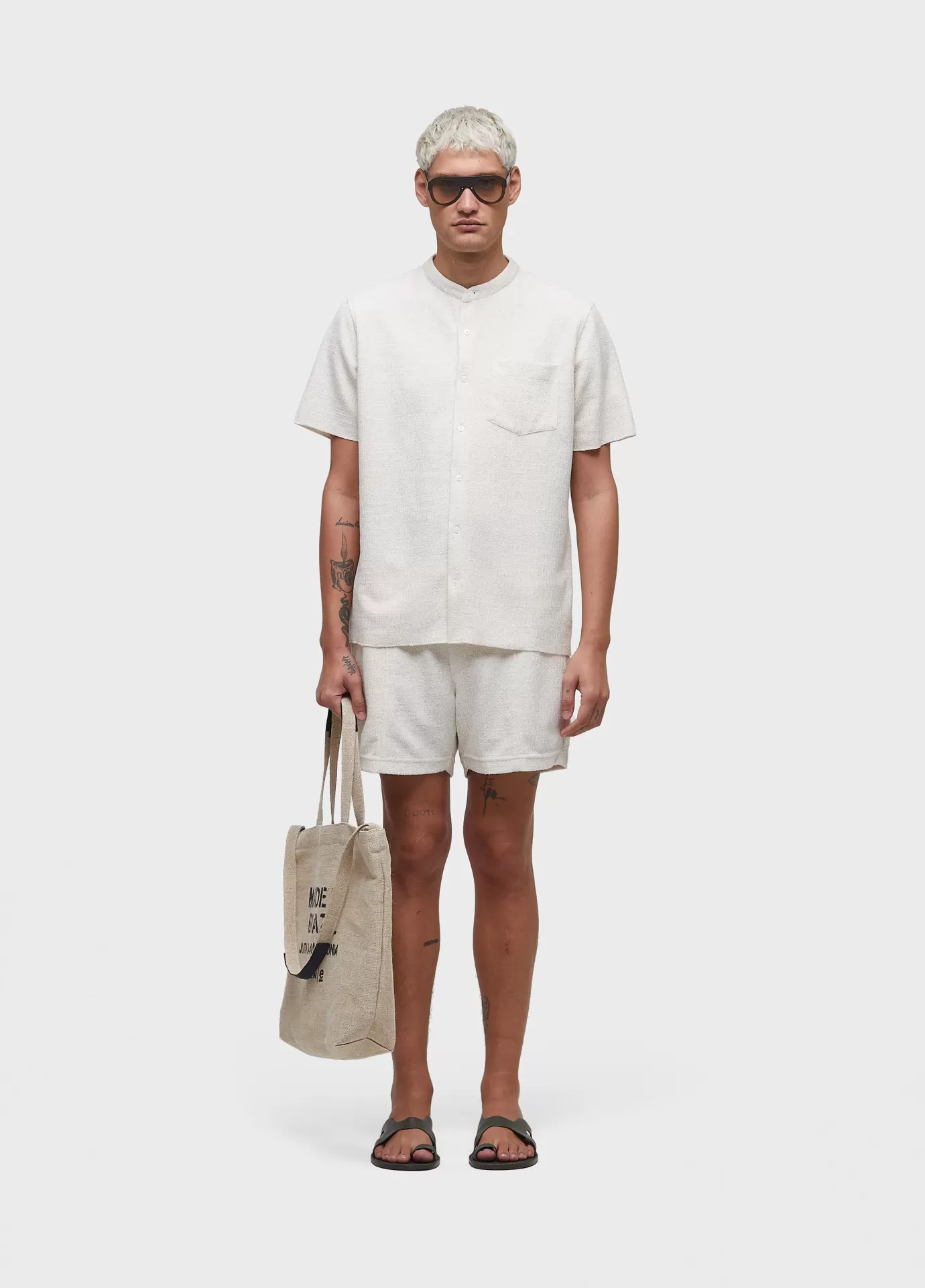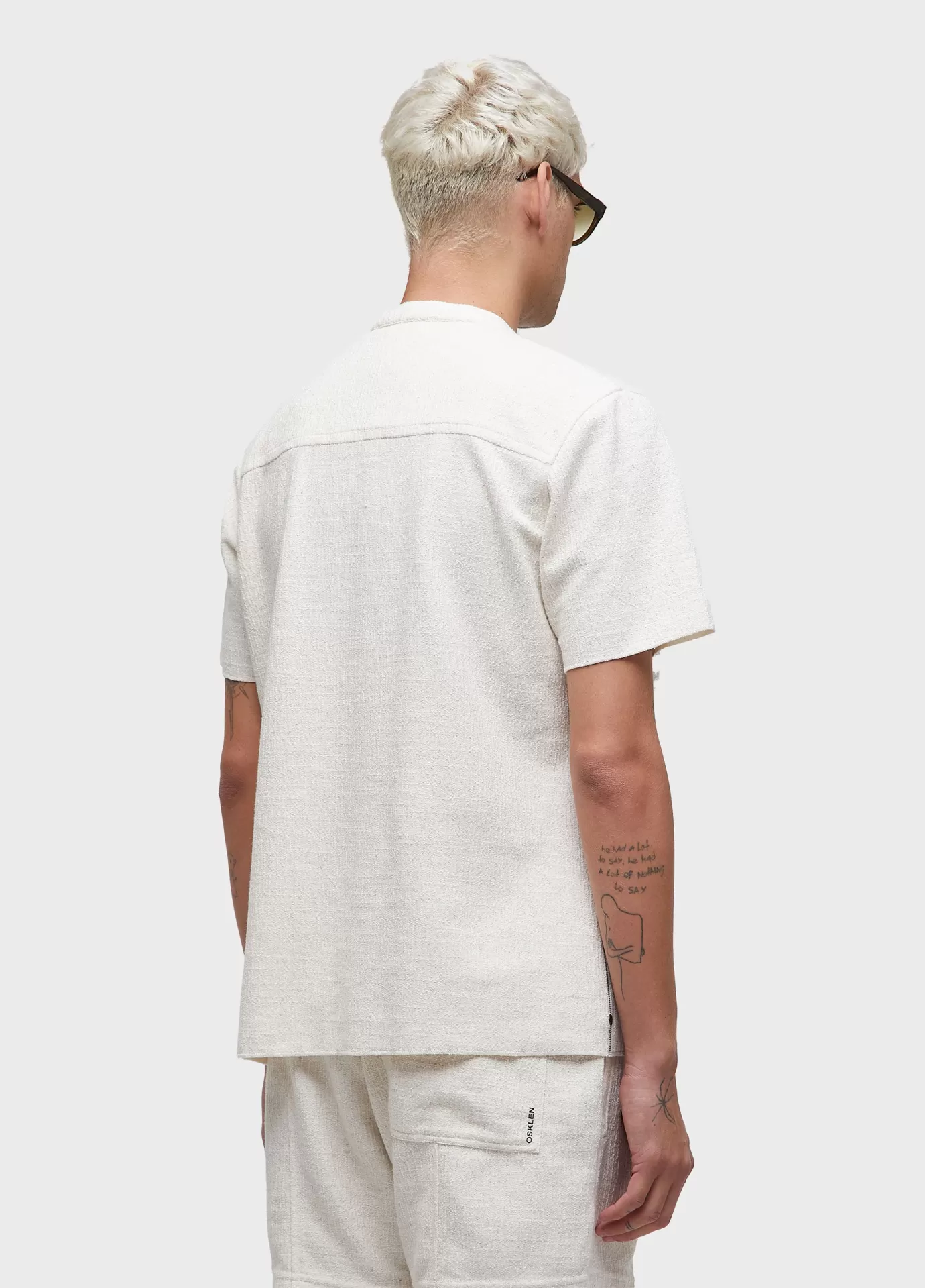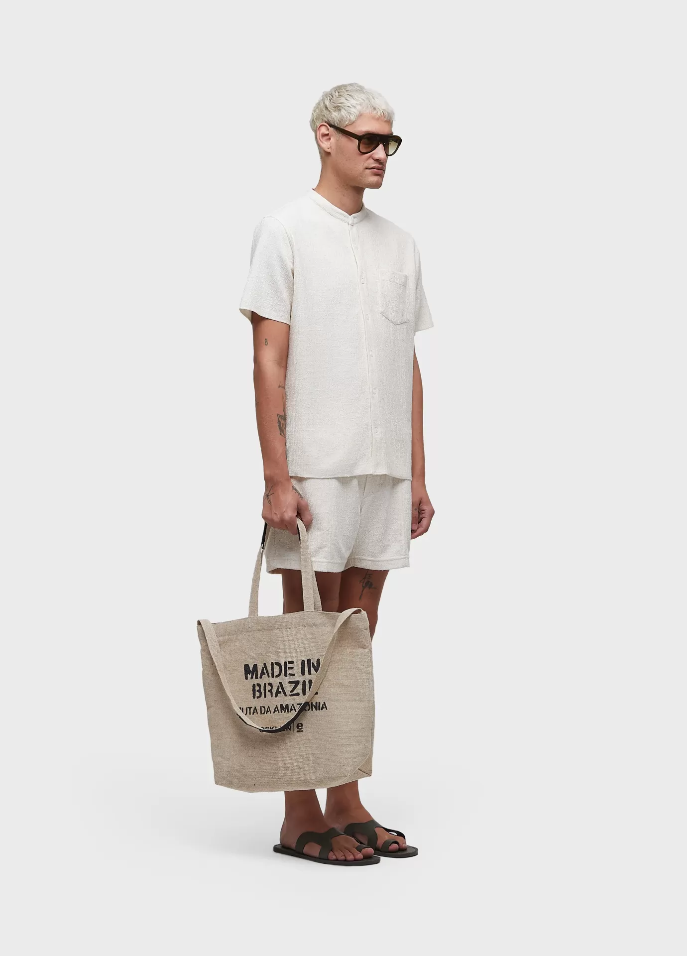 Camisa masculina manga curta feita em malha 52% algodão 44% poliéster 4% linho. base de modelagem over. a peça possui amaciamento organic mint wash, um processo natural formulado à base do óleo essencial da menta orgânica, cultivada em pequenas hortas que fazem parte de um projeto social que promove a recuperação e ressocialização de dependentes químicos. bandeira: respect our people.