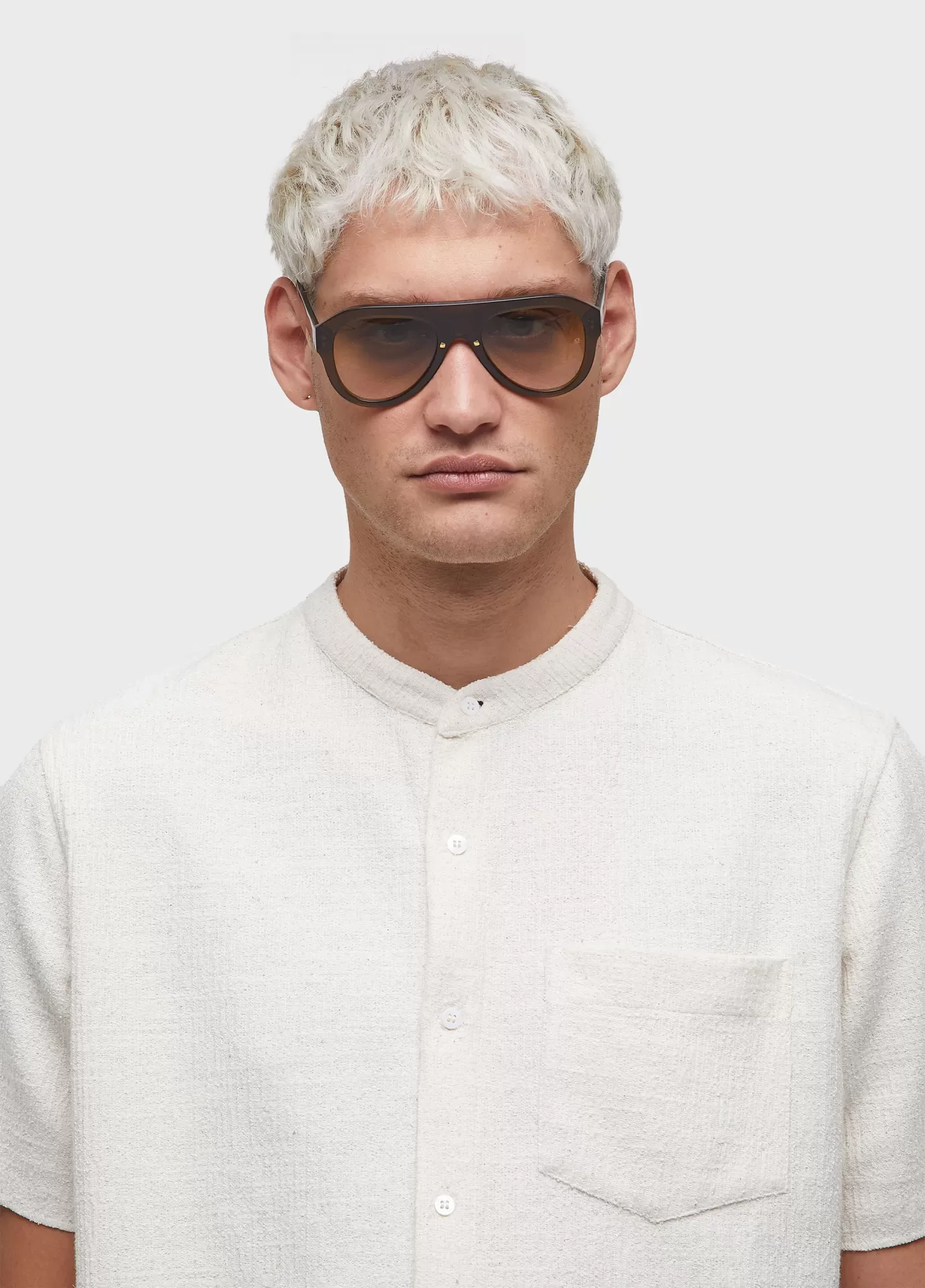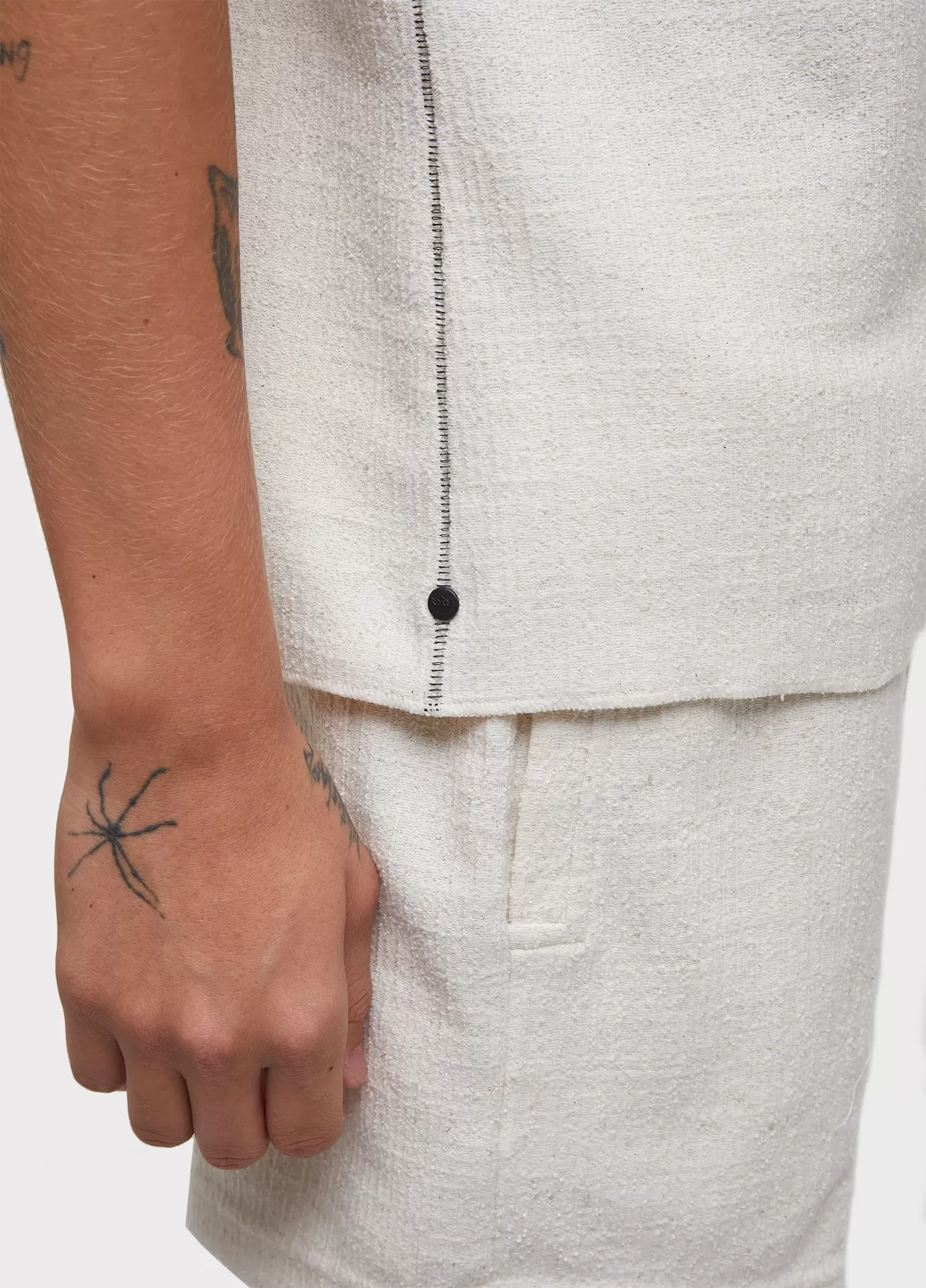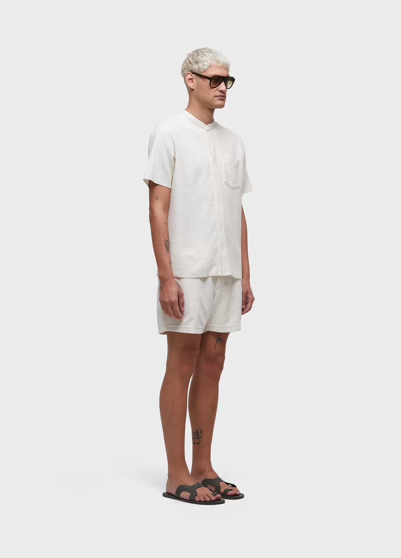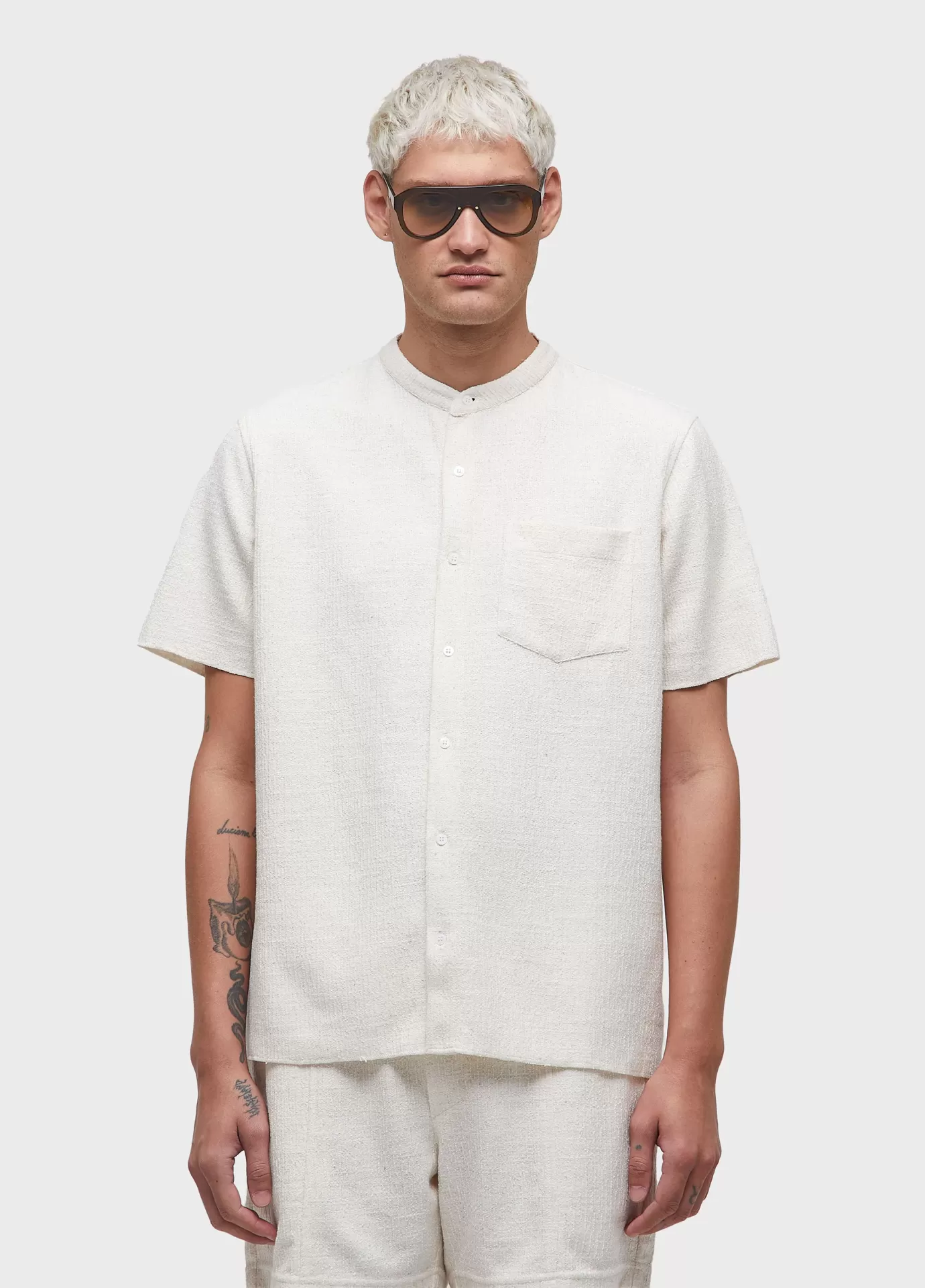 Camisa masculina manga curta feita em malha 52% algodão 44% poliéster 4% linho. base de modelagem over. a peça possui amaciamento organic mint wash, um processo natural formulado à base do óleo essencial da menta orgânica, cultivada em pequenas hortas que fazem parte de um projeto social que promove a recuperação e ressocialização de dependentes químicos. bandeira: respect our people.