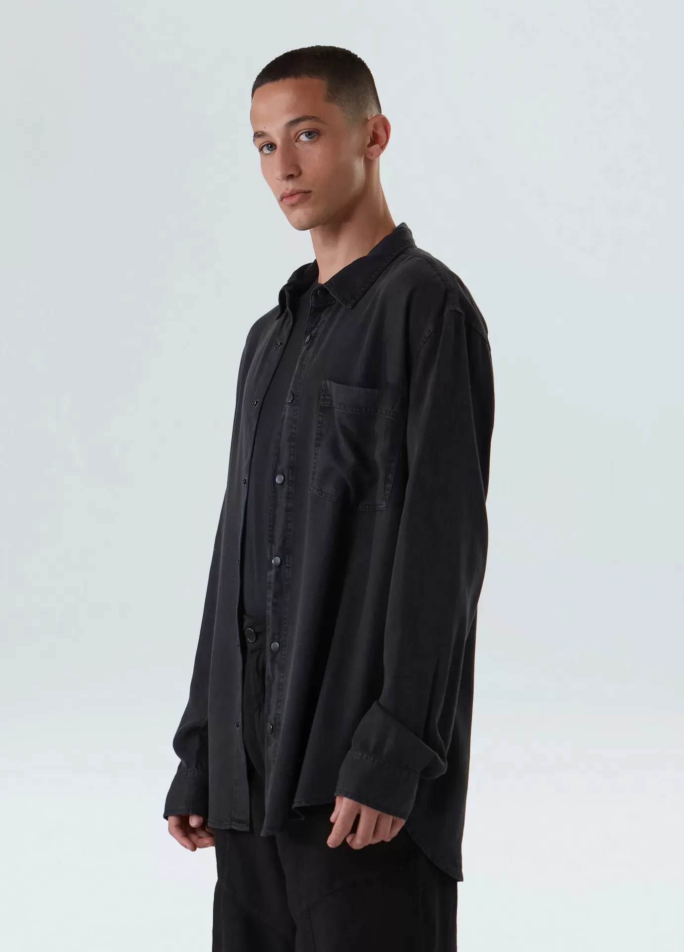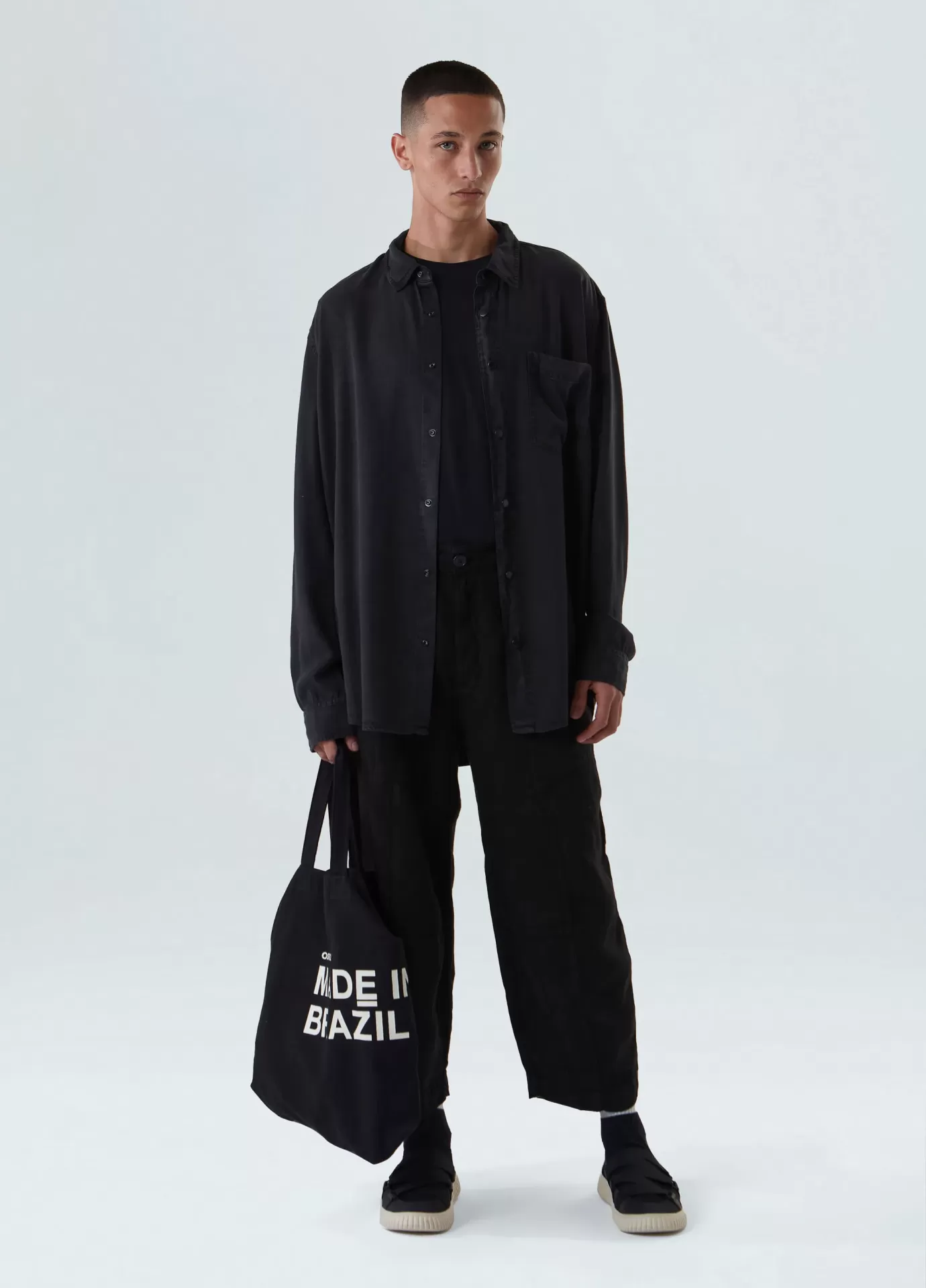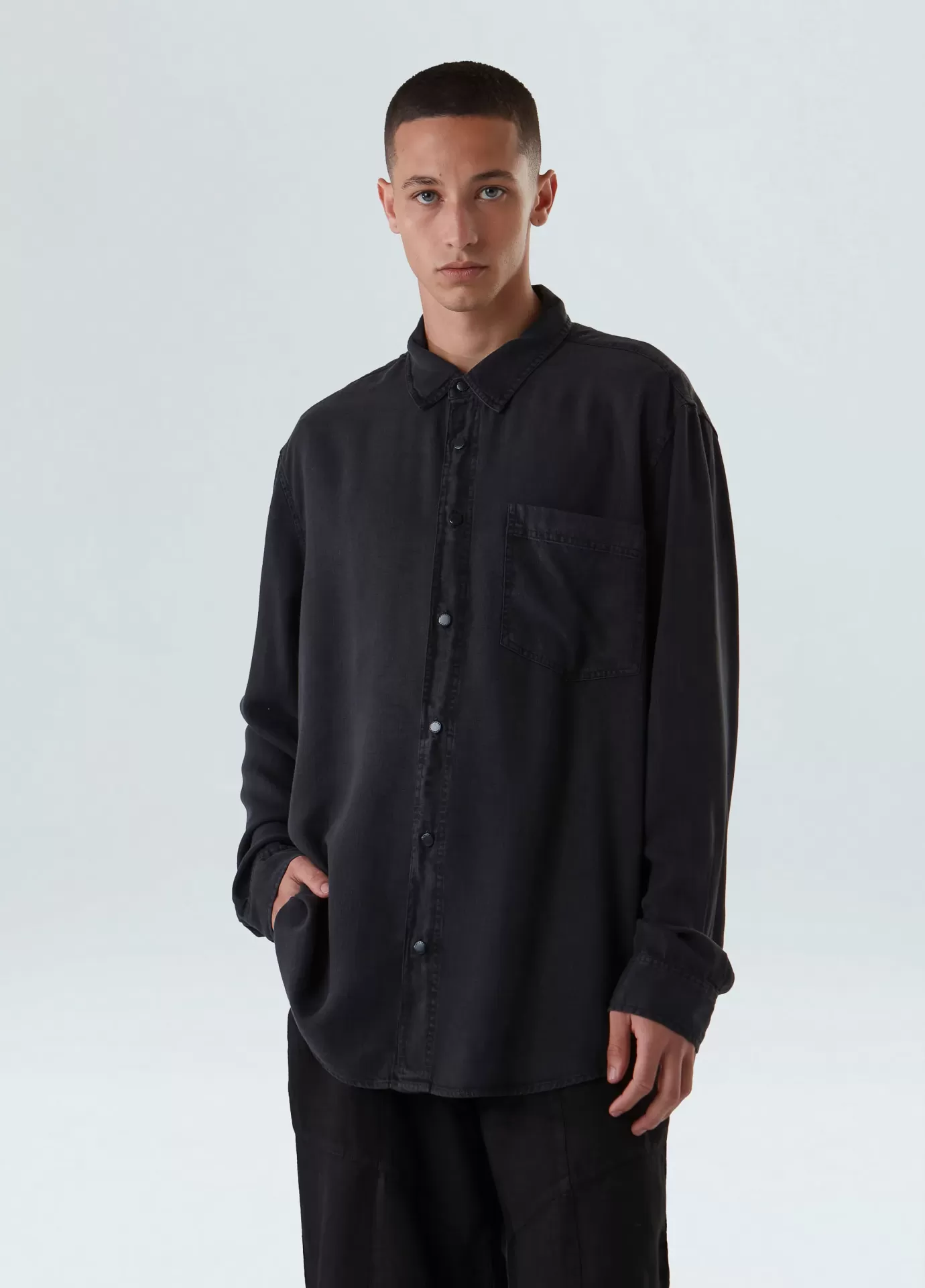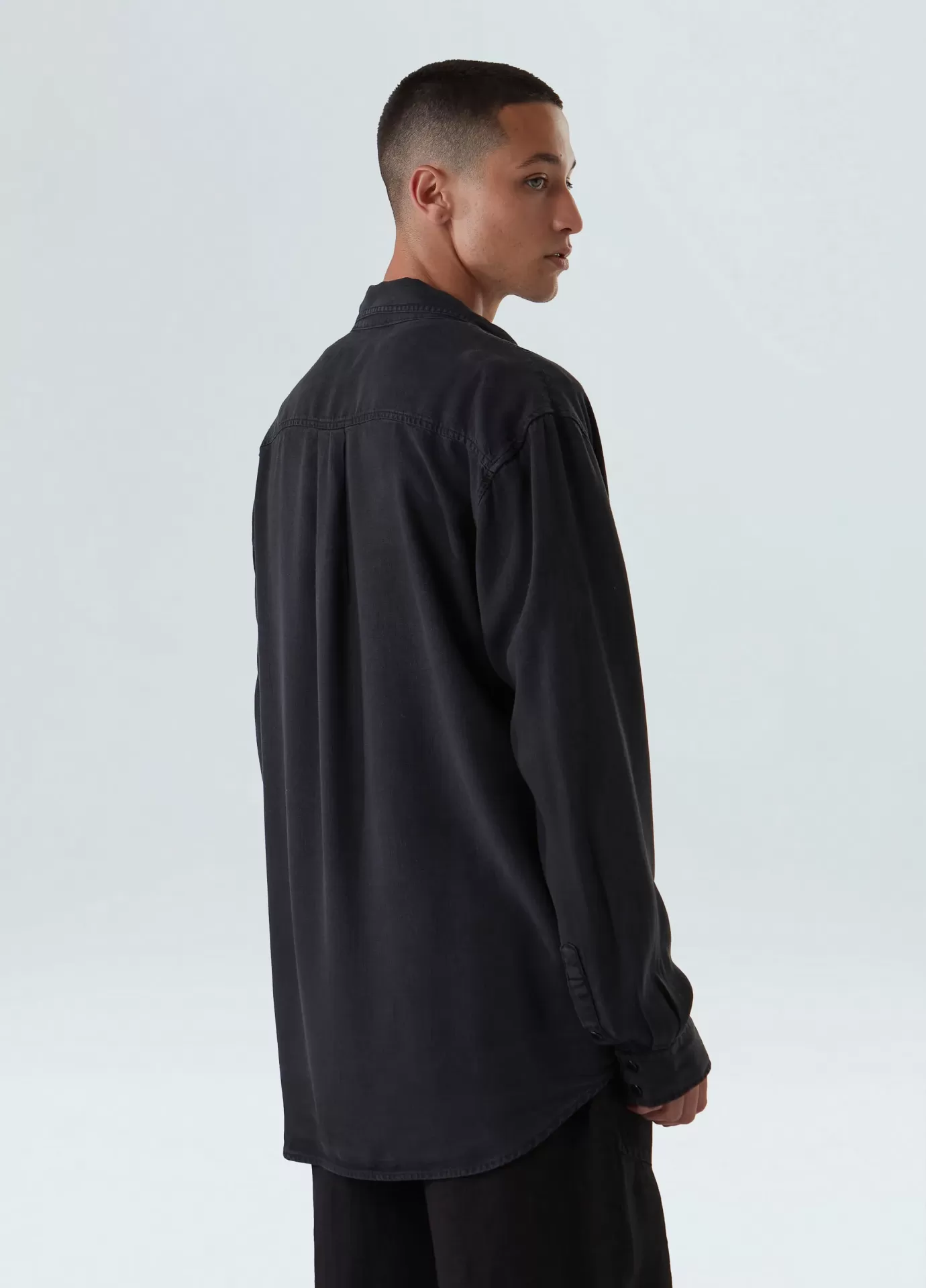 Camisa manga longa, com modelagem over, peça feita em liocel e a partir de matéria prima proveniente de fontes sustentáveis e certificadas.o liocel é uma fibra confeccionada a partir da celulose de madeiras oriundas de reflorestamento e manejo sustentável.