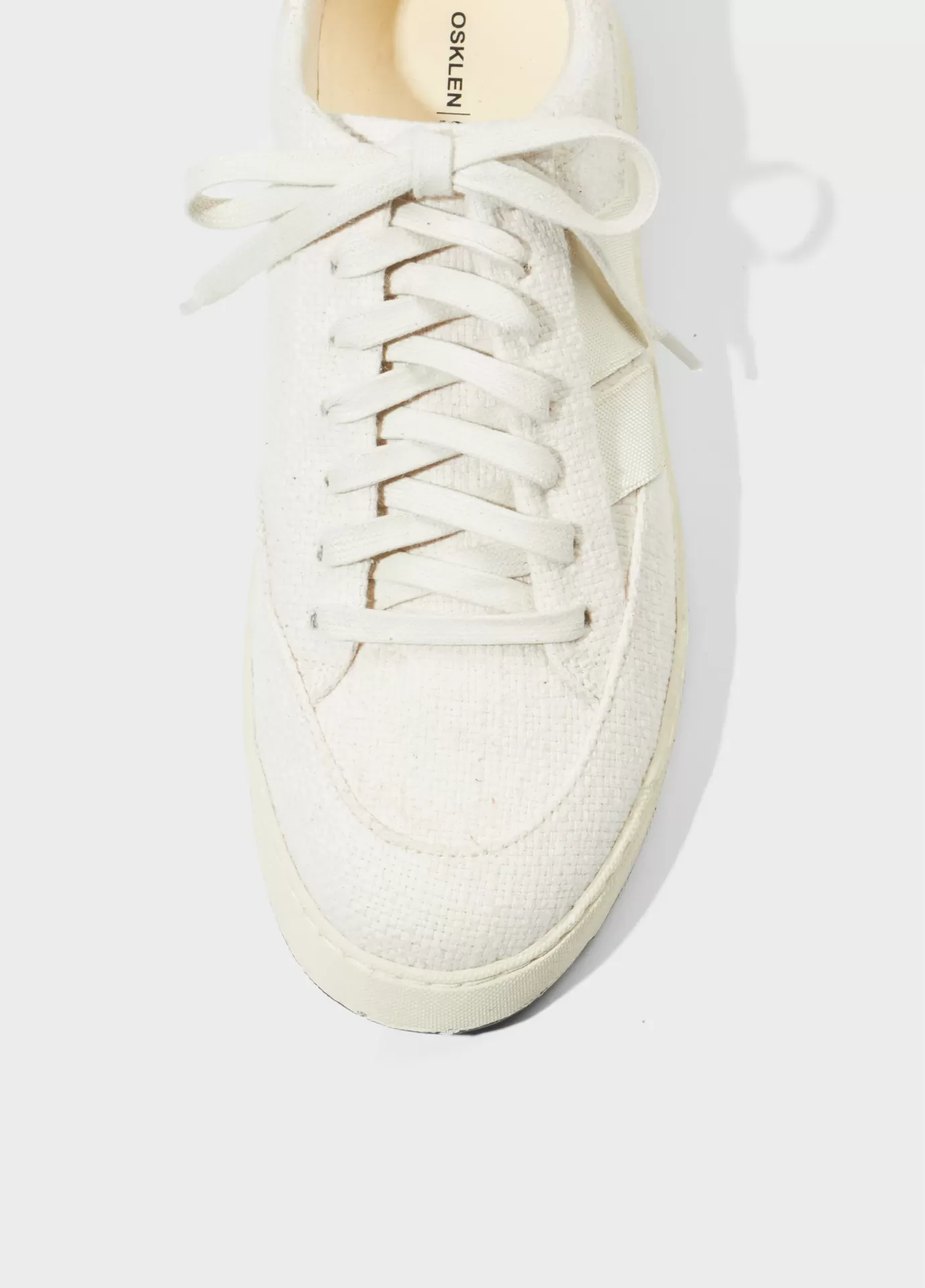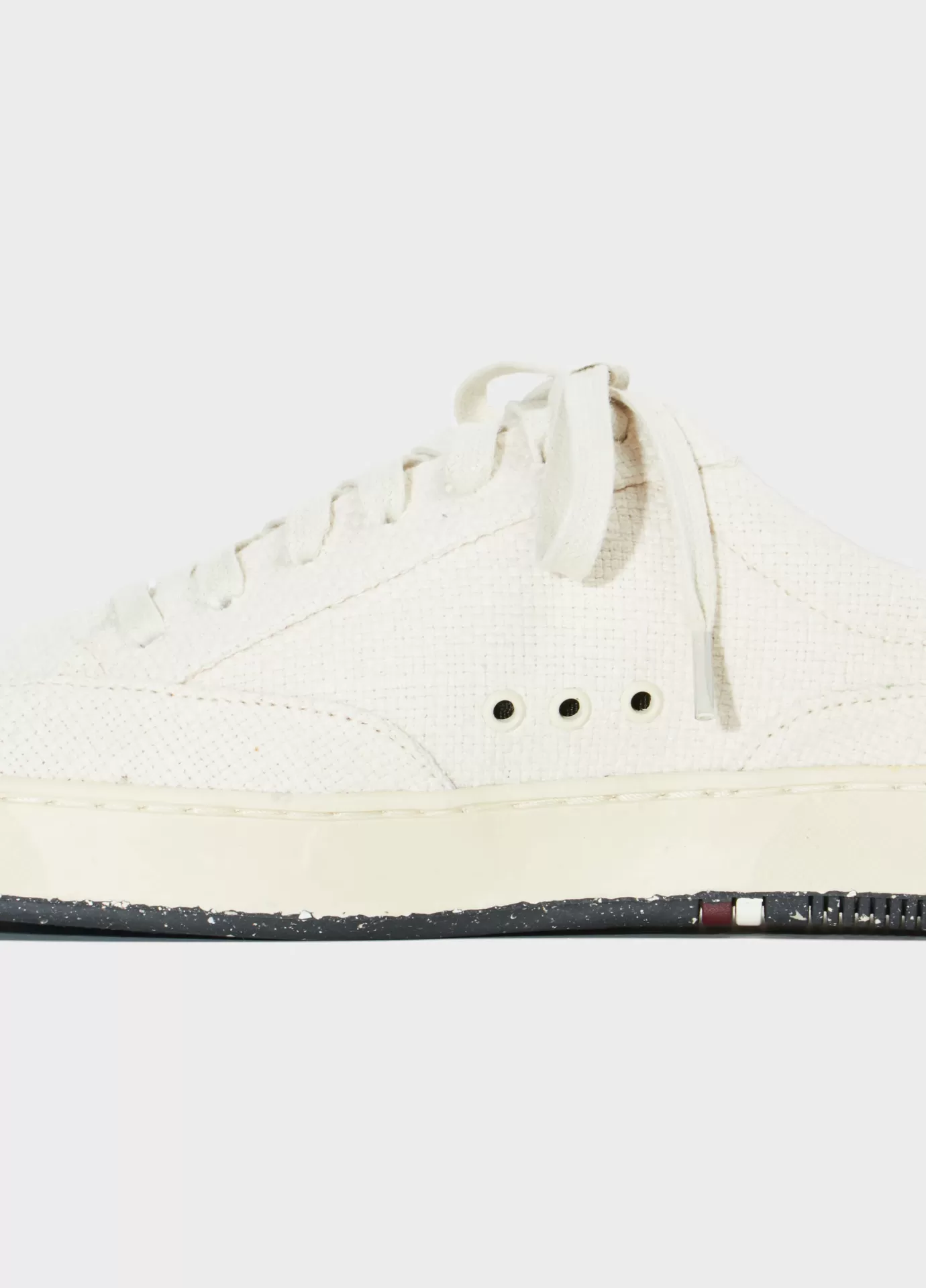 Tênis em lona tramada de algodão reciclado. Assinatura lateral em borracha texturizad