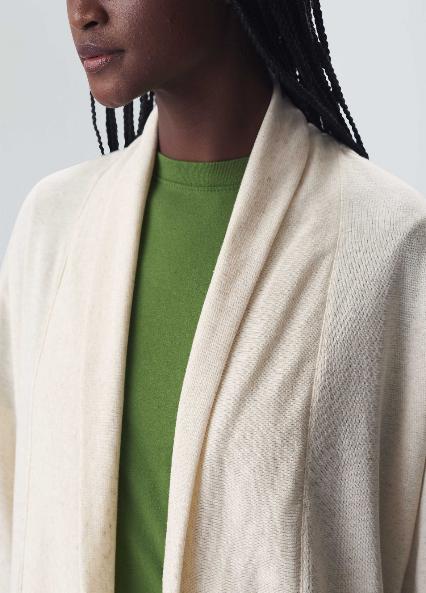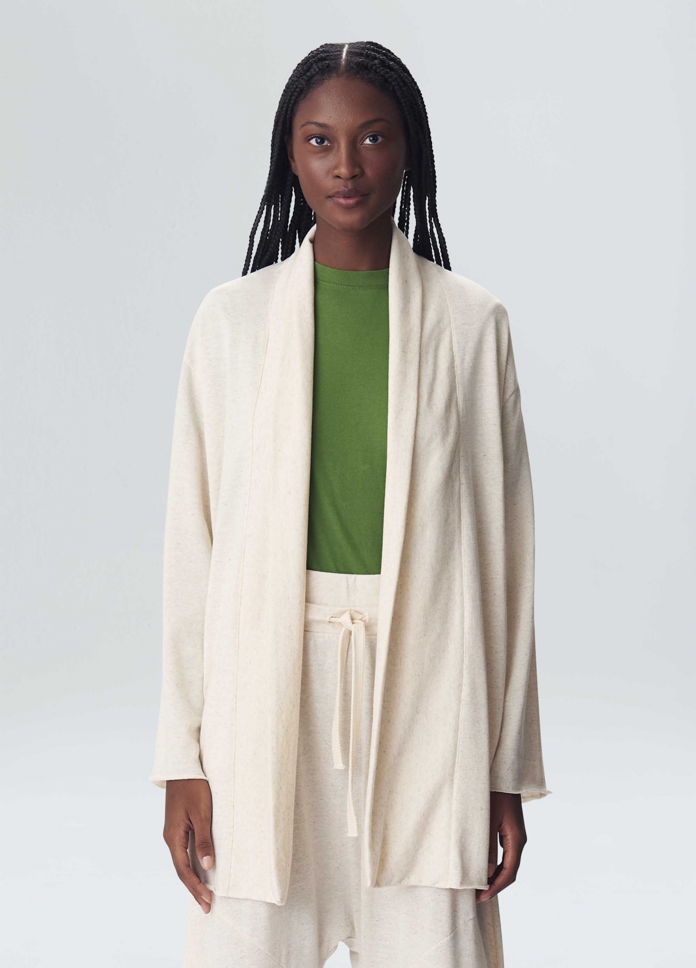 descrição Casaco tipo cardigan feminino feito em malha com uma combinação de fibras de algodão certificado, algodão reciclado, pet reciclado, cânhamo e linho. A peça tem mangas amplas e caimento oversized. Essa é uma peça Respect Our People, pois foi confeccionada através do projeto de desenvolvimento de amaciantes e aromas têxteis naturais oriundos do bioma da Amazônia, que estimulam uma experiência sensorial por meio do tato e do olfato. Por ser produzida com elementos naturais como o óleo de andiroba, copaíba, cumaru e estoraque, esta peça contribui para a proteção da floresta e beneficia mais de 800 pessoas em diferentes regiões da Amazônia. A produção destes óleos, além de promover o empoderamento social, estimula a econômia da floresta em pé e a valorização da riqueza cultural brasileira.