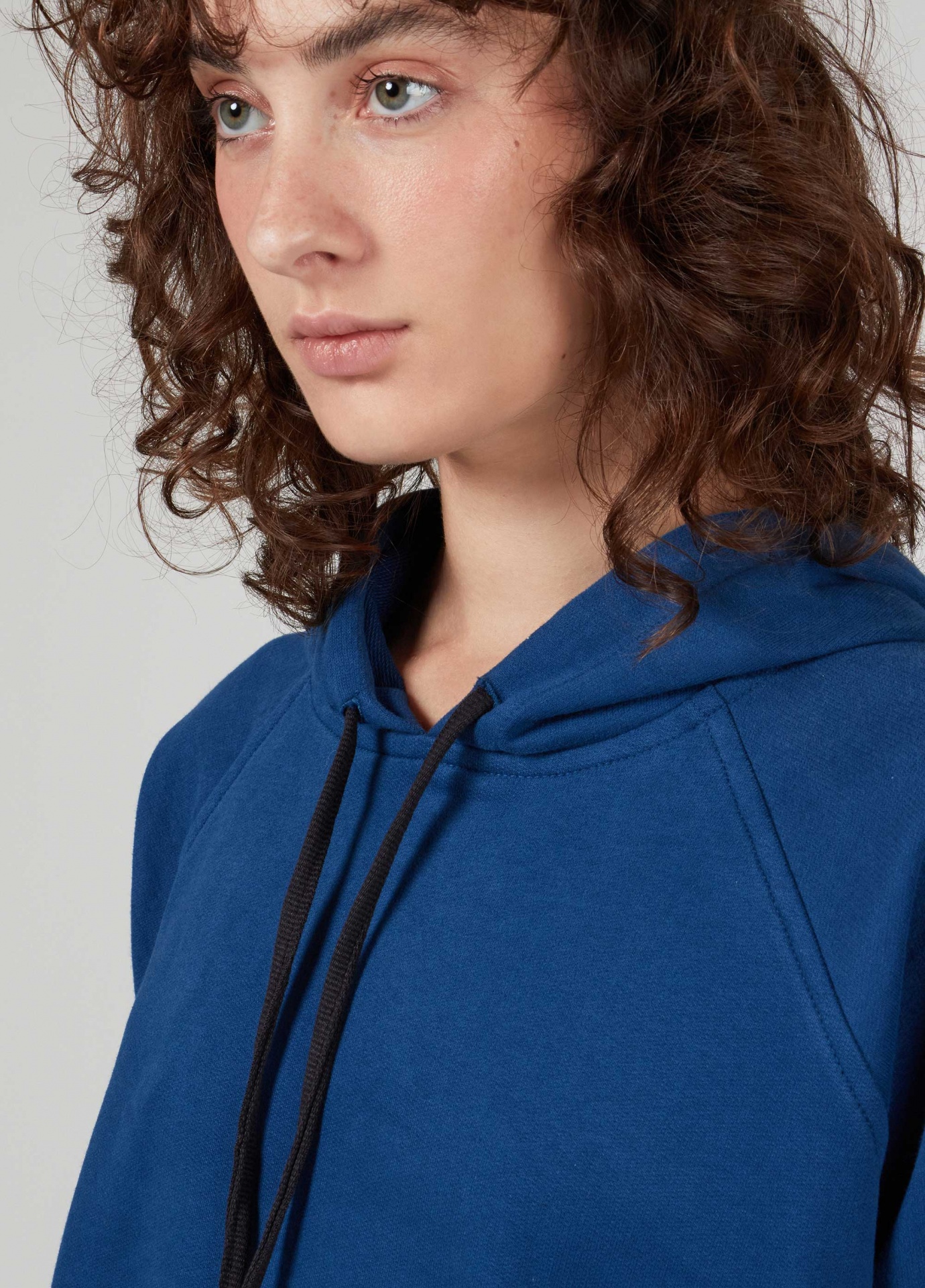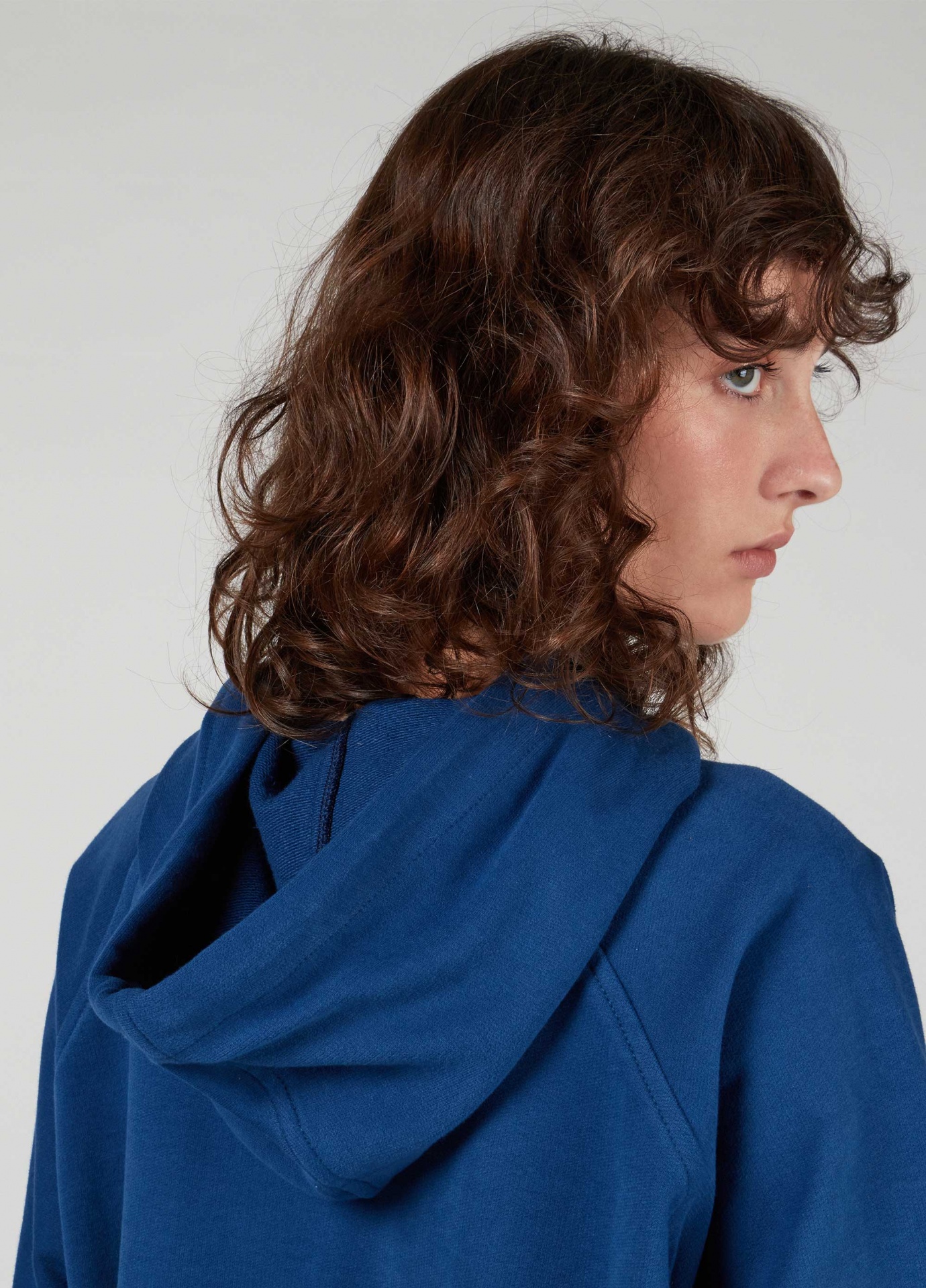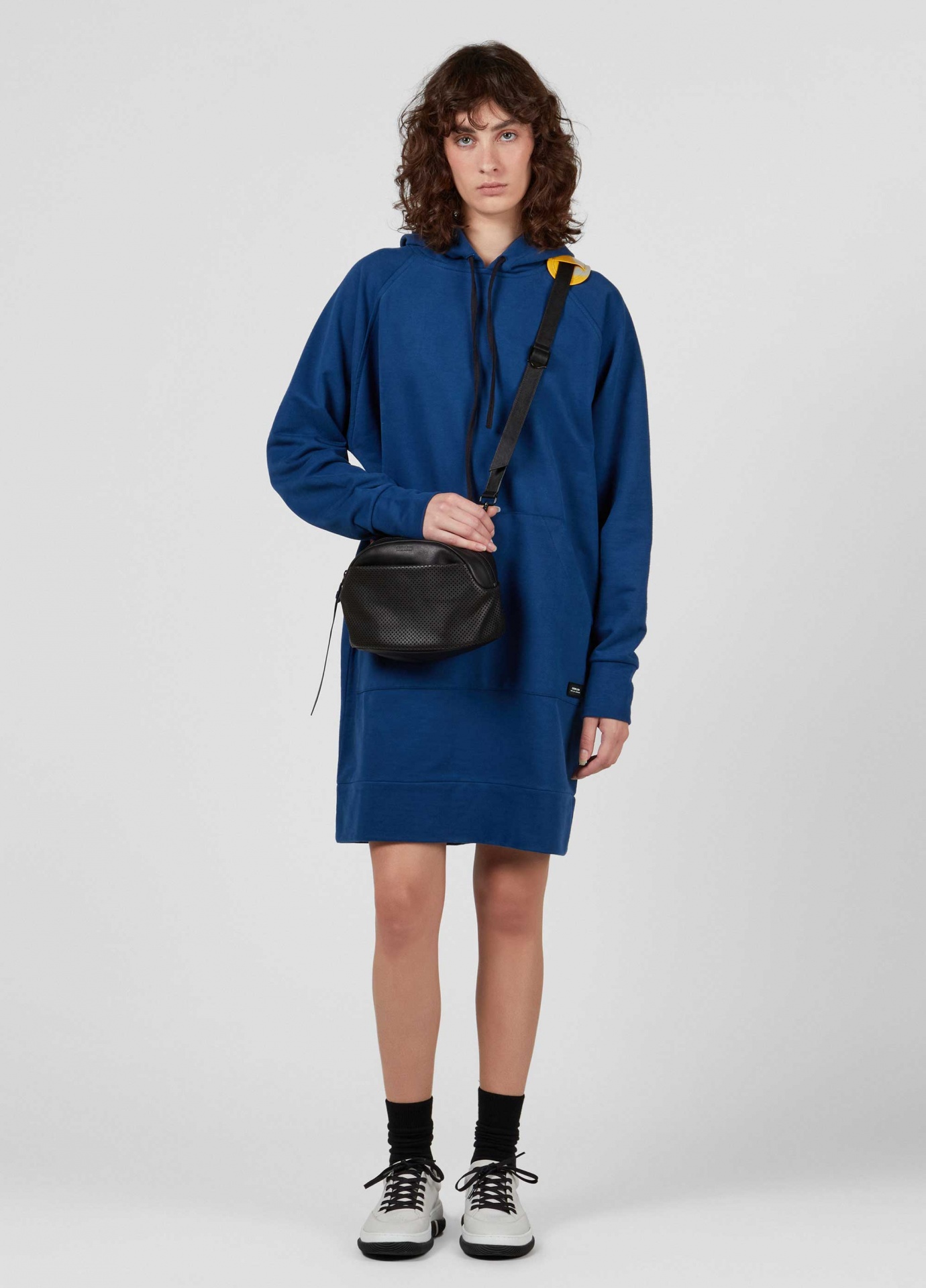 Vestido curto feito em moletom de algodão. A peça tem mangas longas com recortes raglan, capuz com cadarço e bolso canguru. Seu caimento é ligeiramente over. A peça tem uma etiqueta de assinatura externa. Composição: 100% algodão.