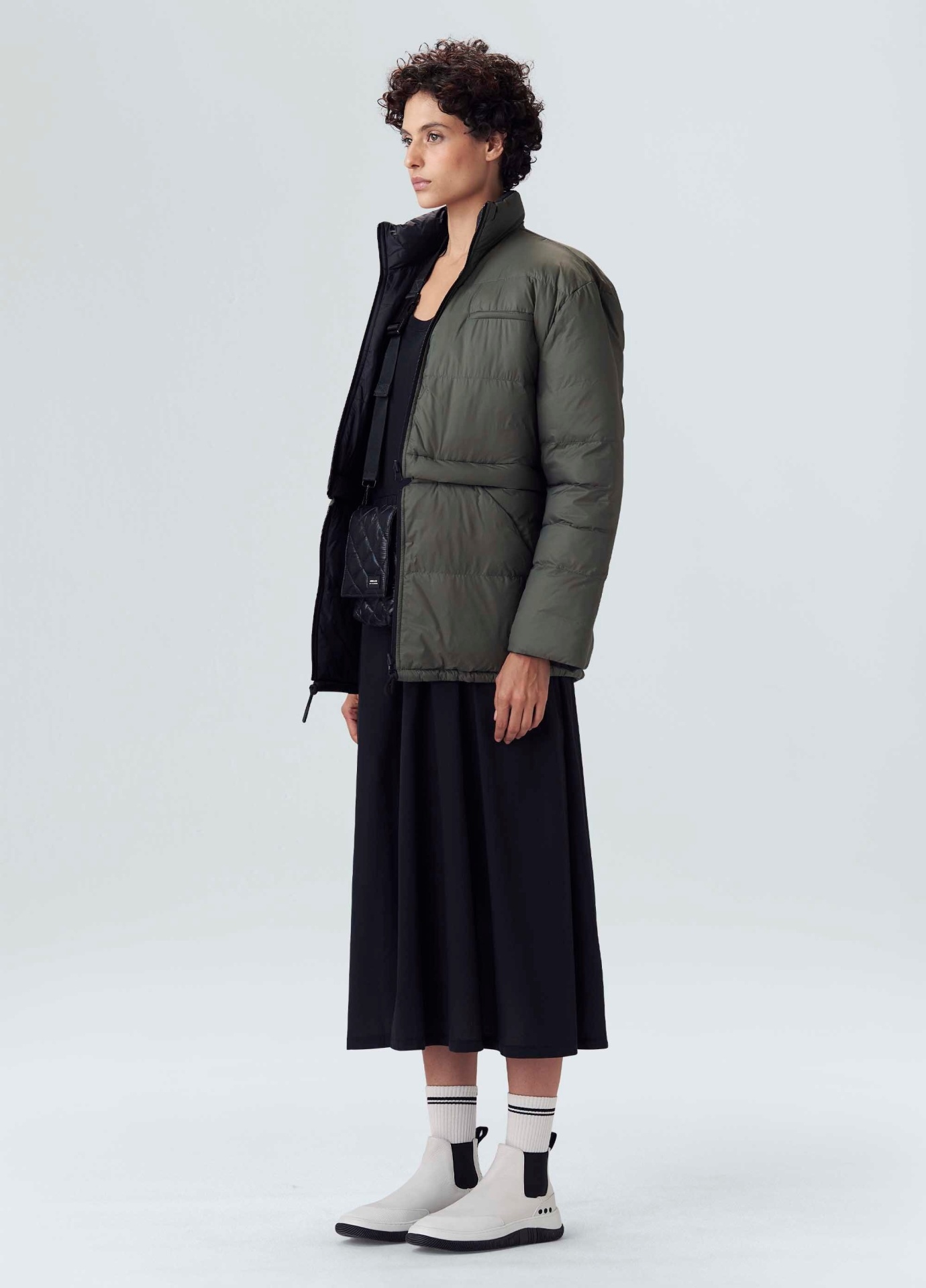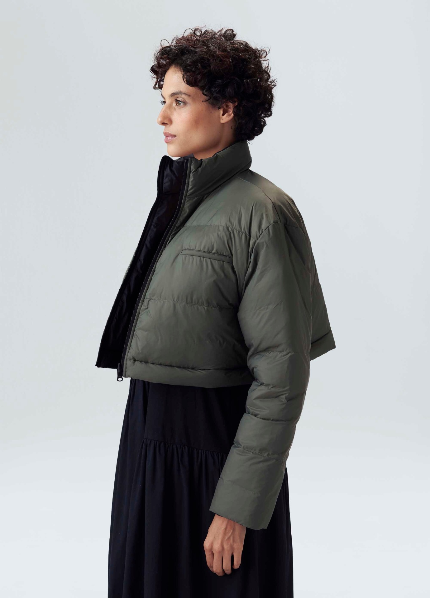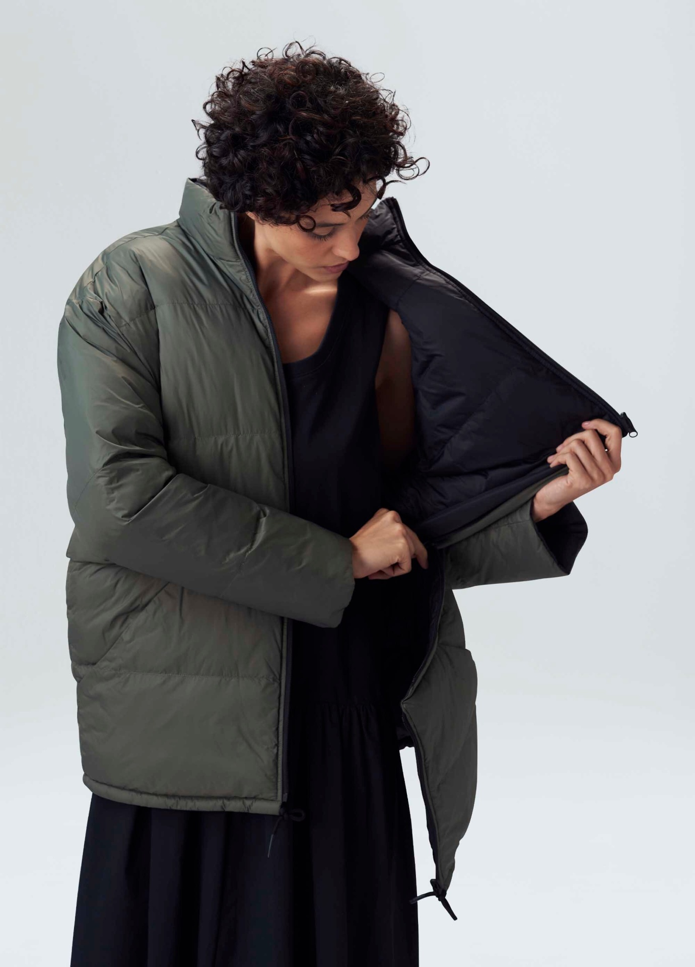 Casaco feminino com capuz, double face sendo um lado preto e outro forest com bolsos nos dois lados. A peça possui um zíper para encurtar o casaco em nylon matelasse.