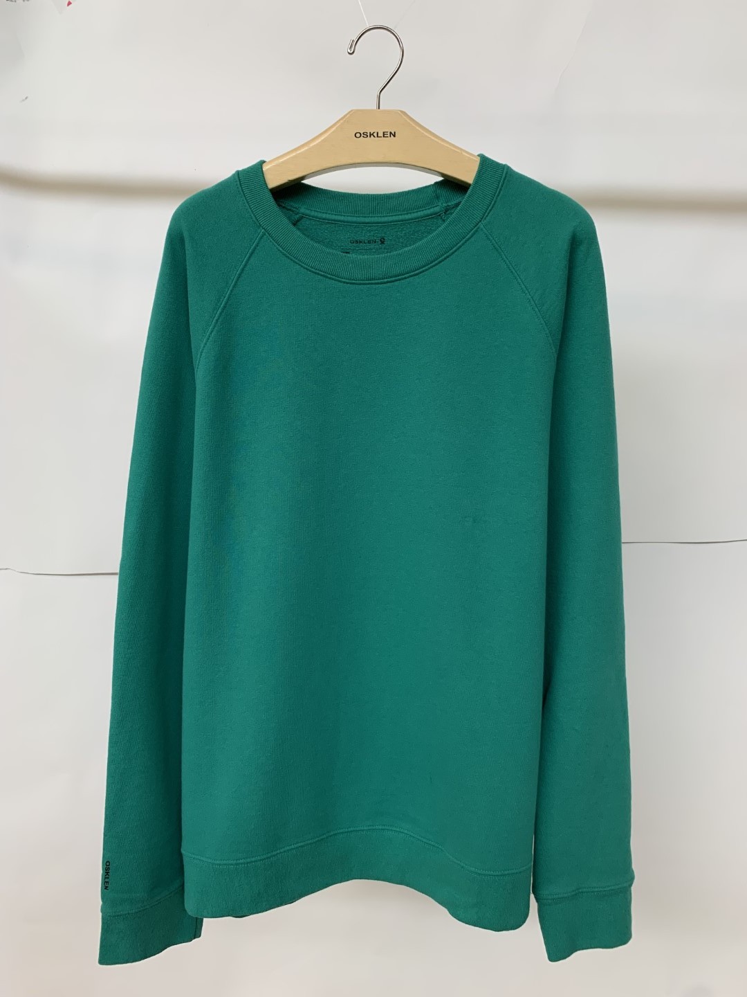 Camisola verde de manga comprida com gola redonda pendurada num cabide de madeira.