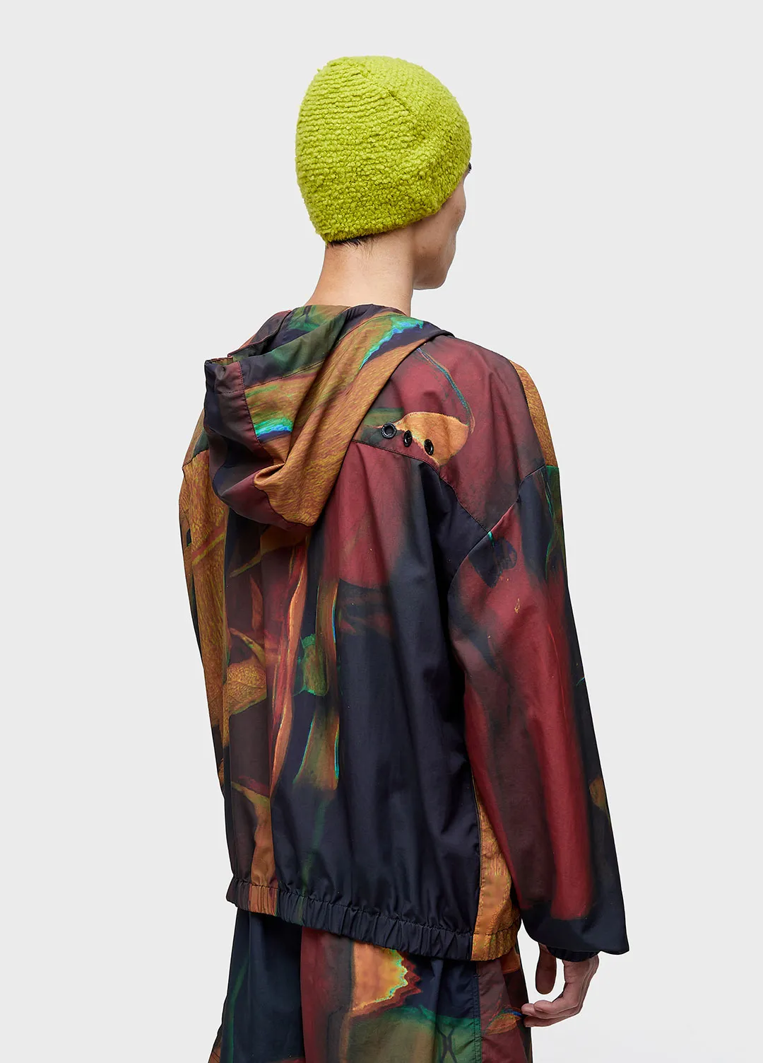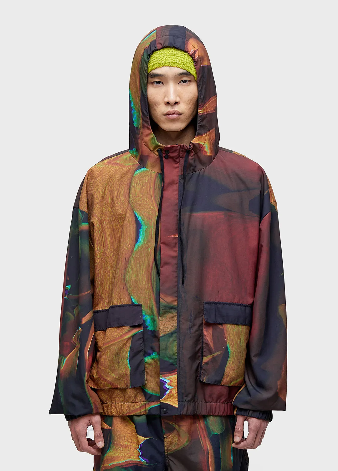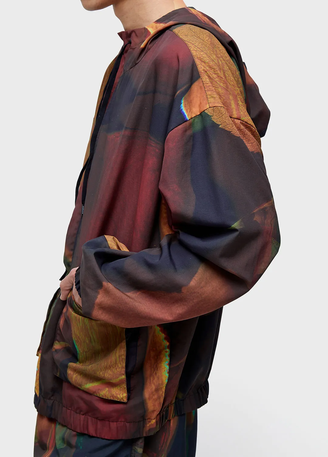Casaco com capuz, com modelagem over, fechamento frontal com zíper e elástico na barra e punhos. peça feita em nylon leve com estampa exclusiva osklen.