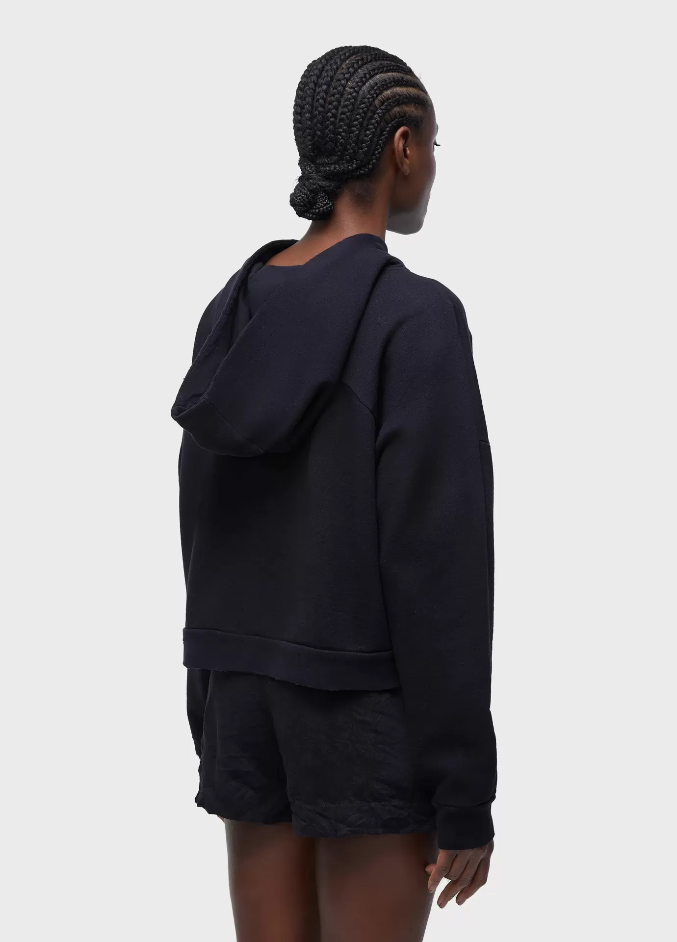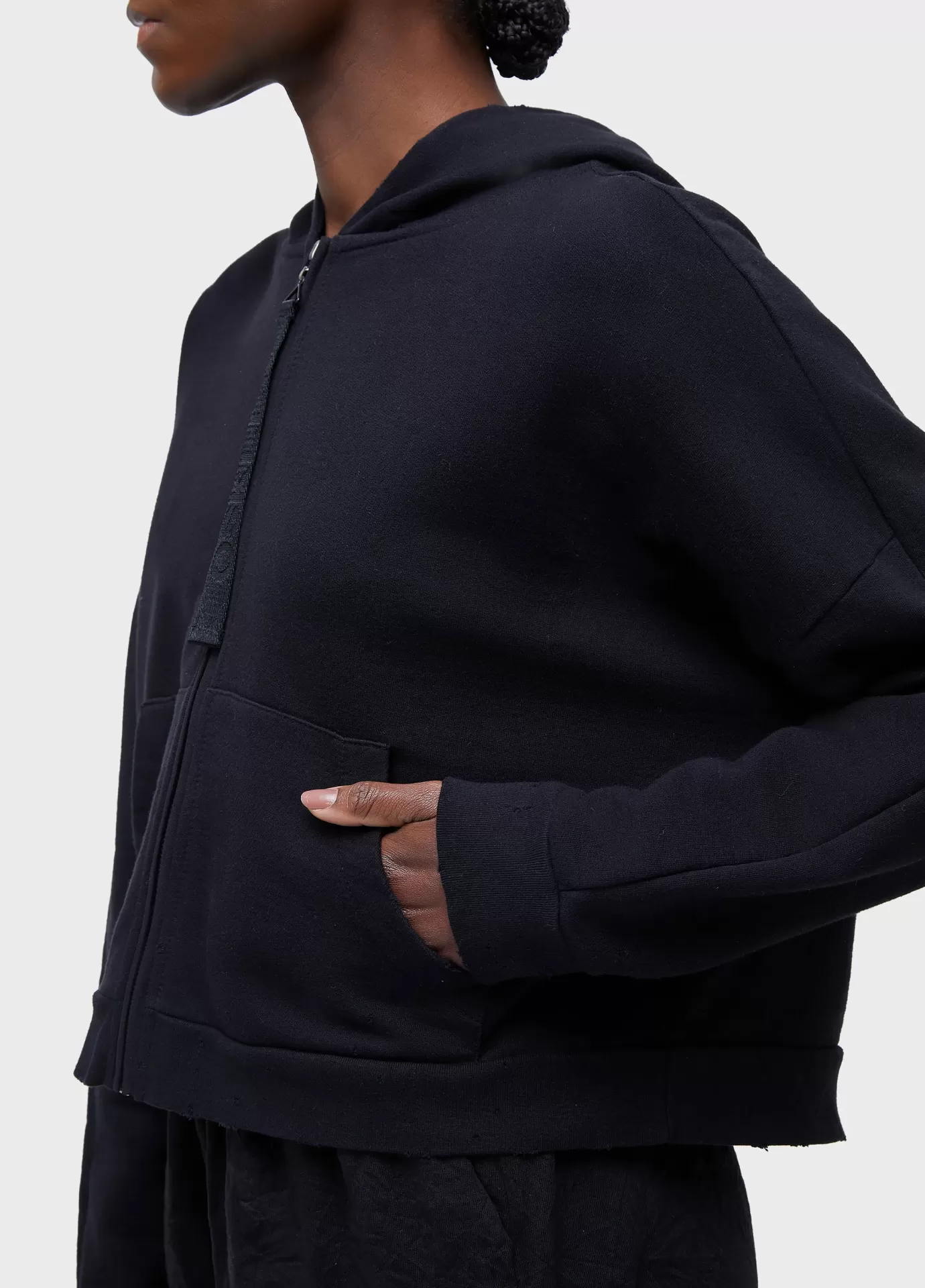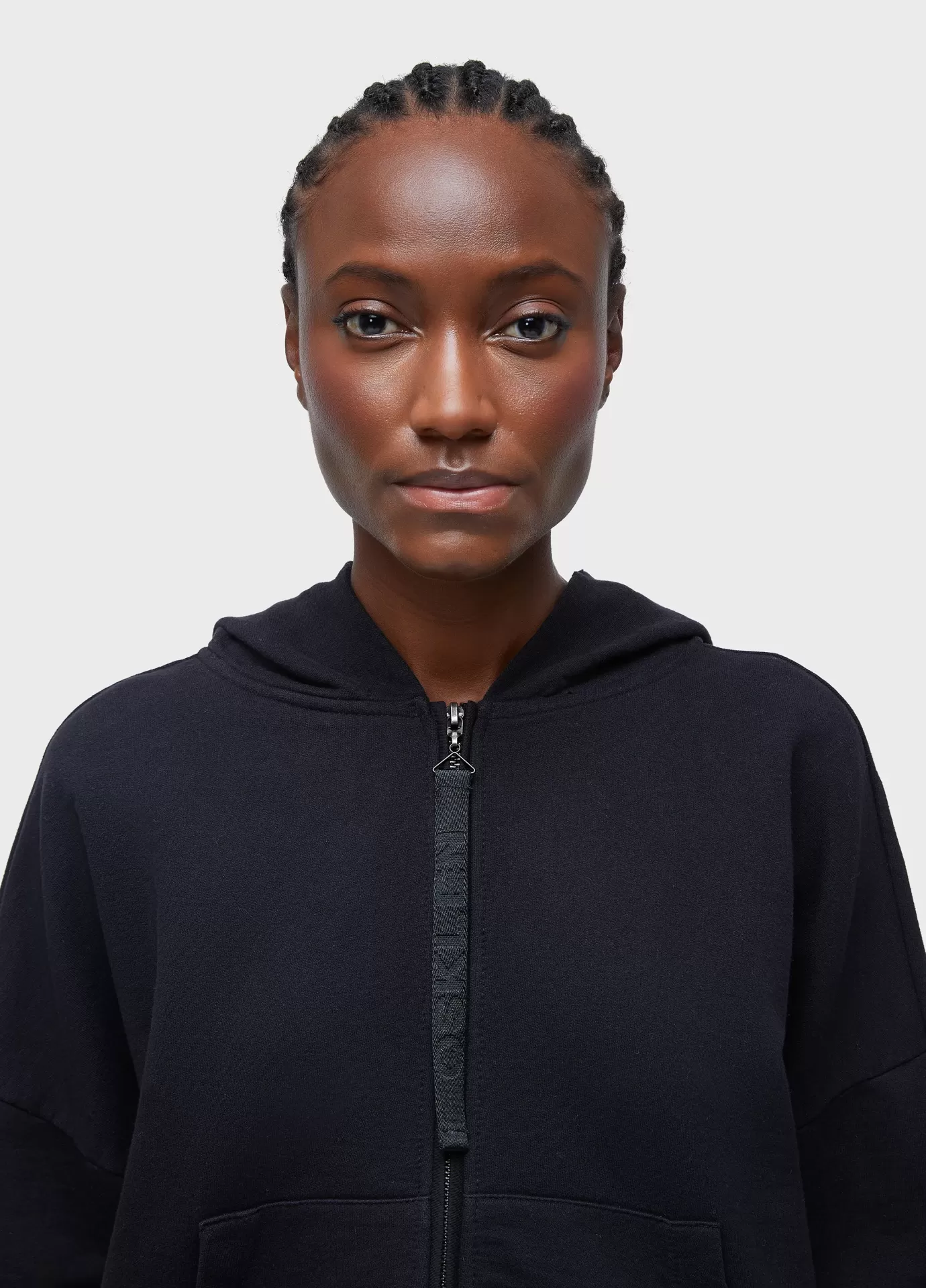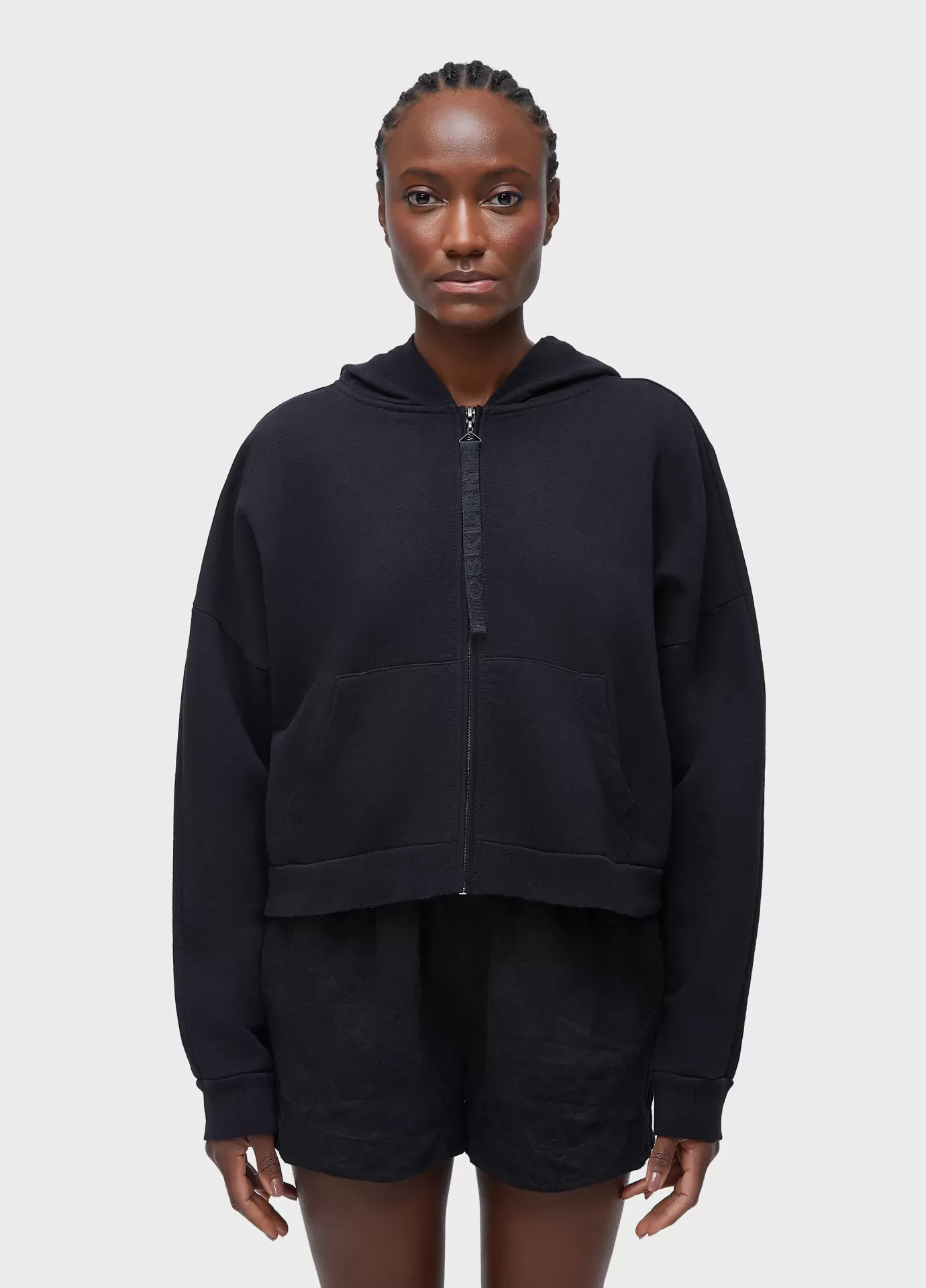 Casaco de moletom; com capuz e bolso canguru; fechamento com z?per de metal no centro frente. acabamento puído nas extremidades; peça produzida com algodao certificado e amaciada com menta organica. bandeira rl - certified cotton +organic mint wash
