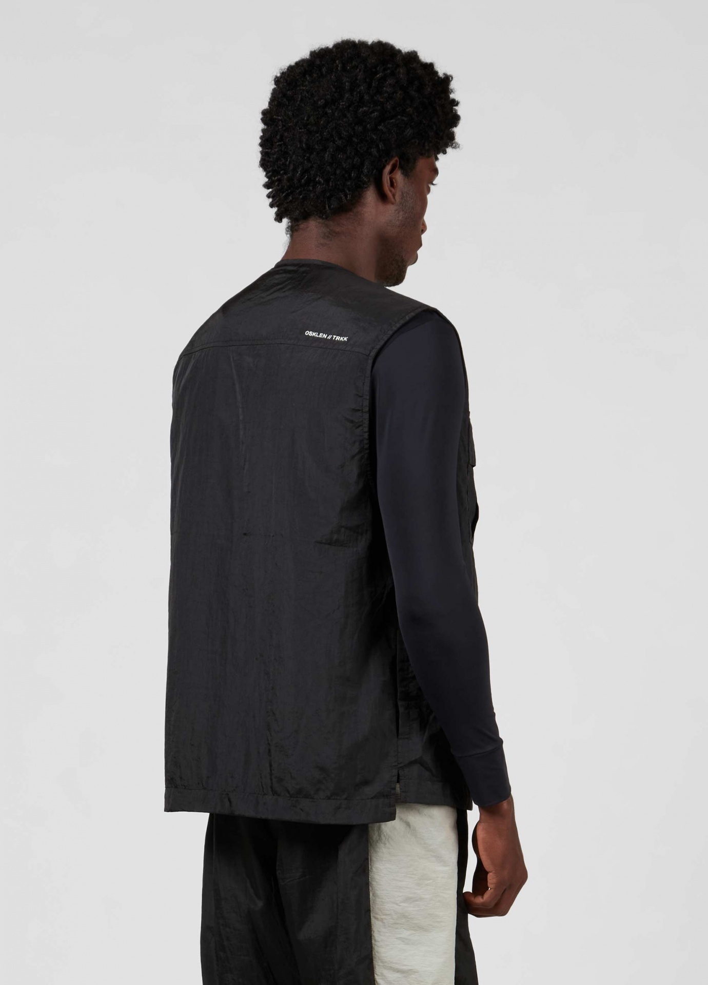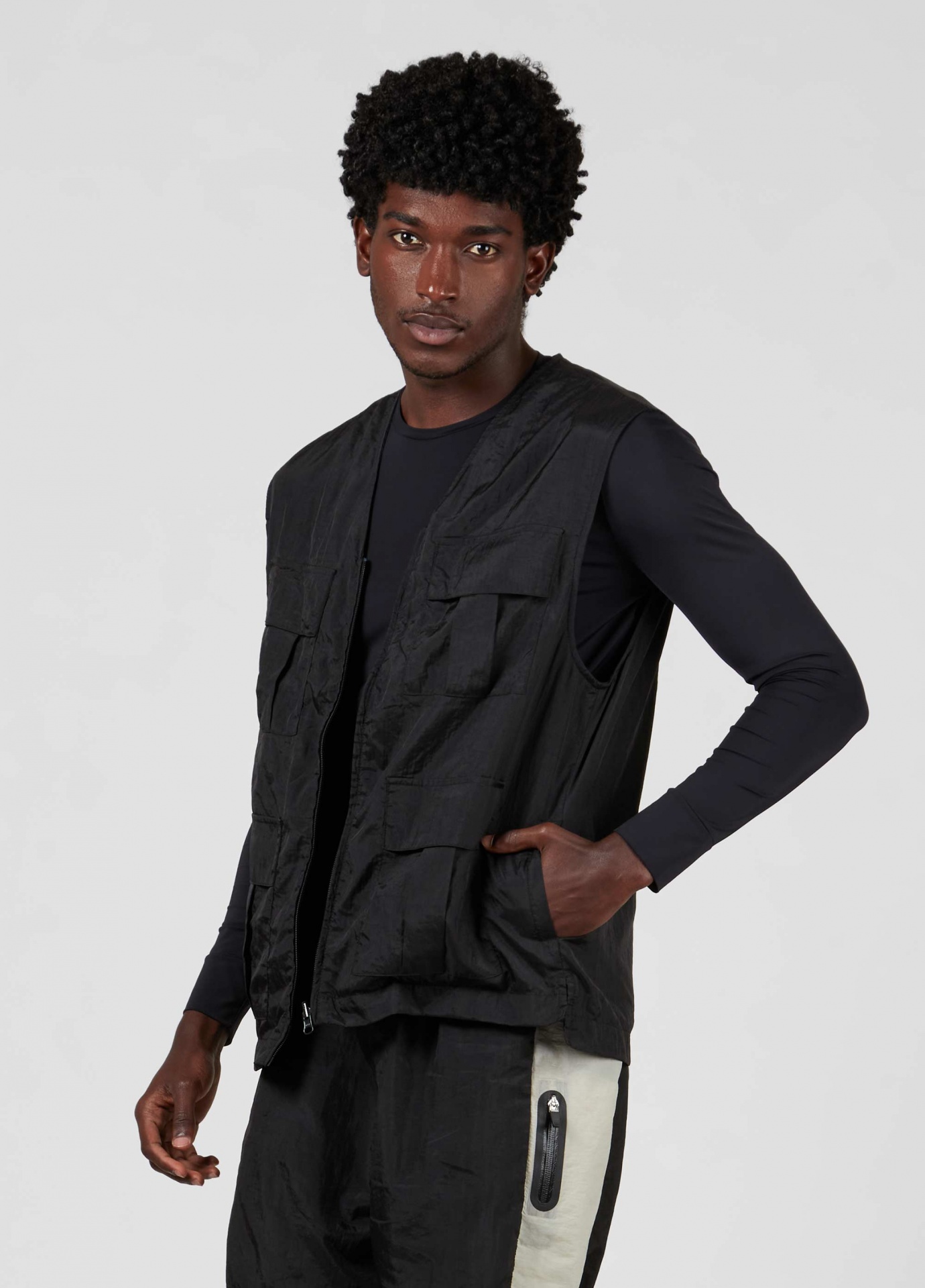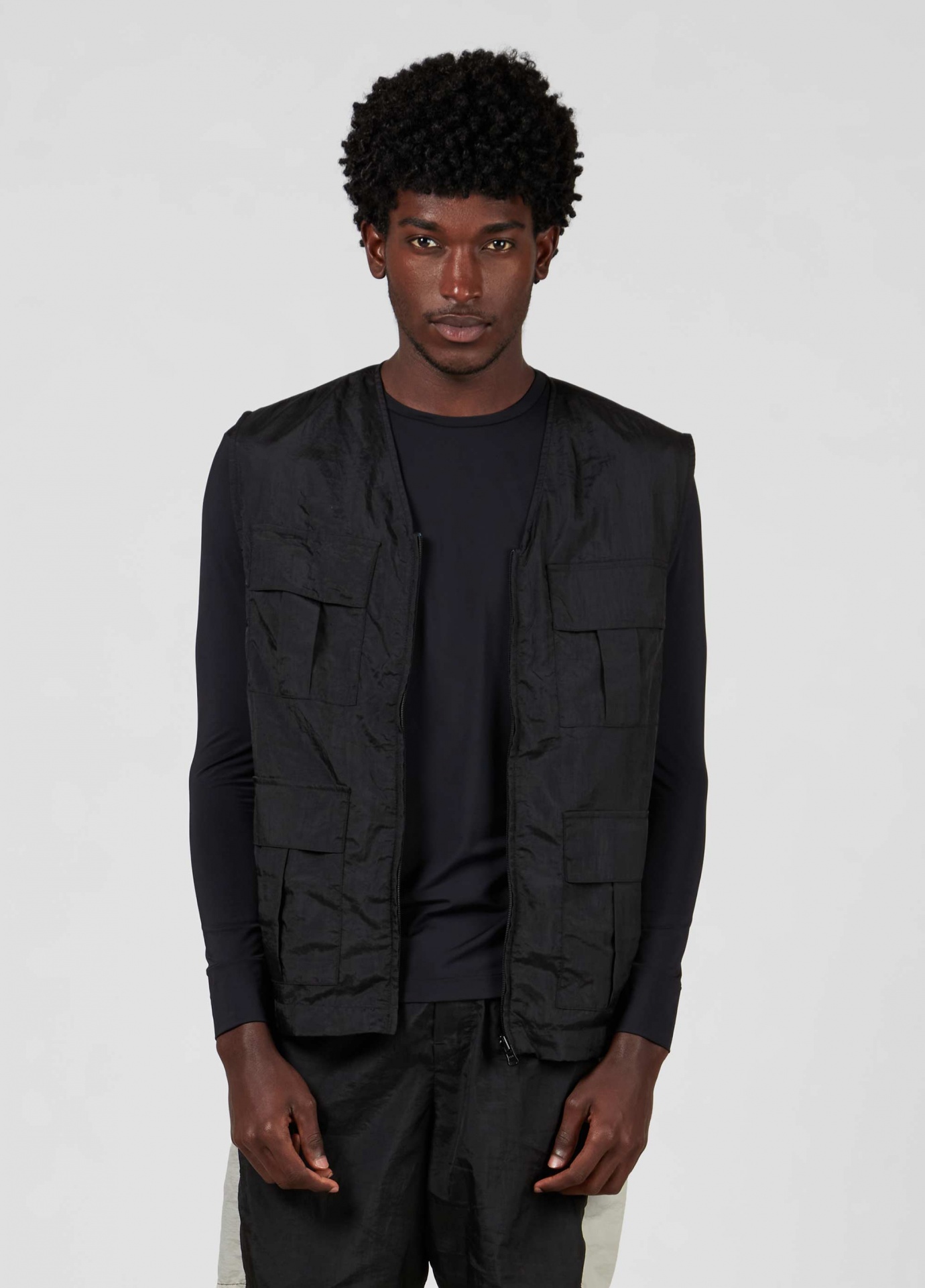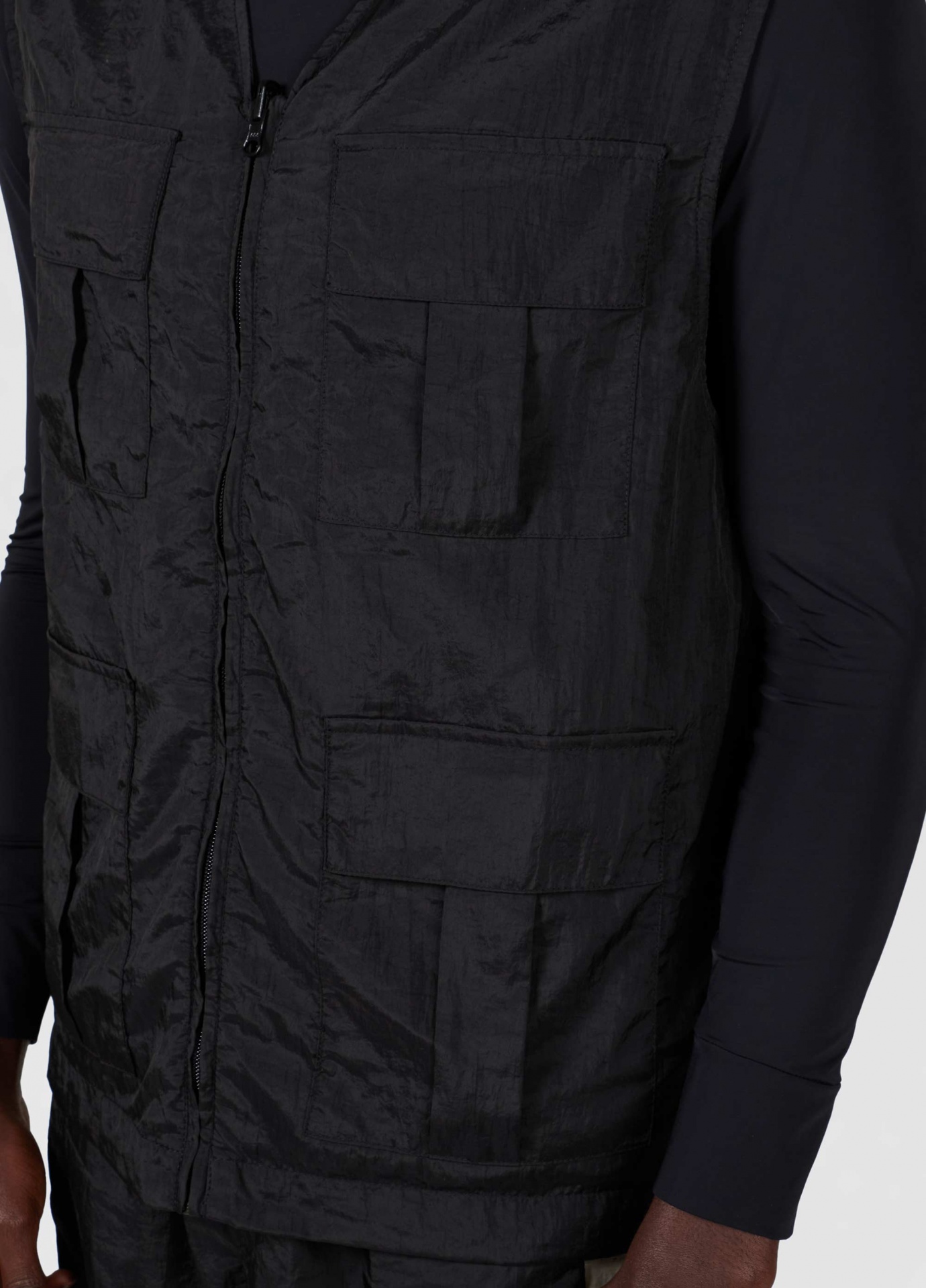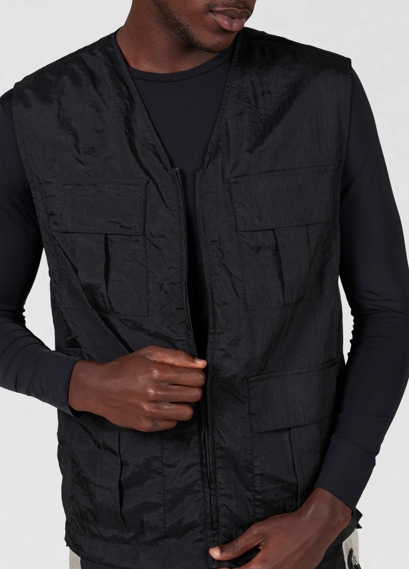 Colete utilitário feito em nylon-e, com acabamento impermeável. Ideal para viagens e para o dia a dia pois é uma peça leve e facil de transportar. O nylon-e é produzido a partir de materiais plásticos industriais que seriam descartados, transformando o que seria resíduo em novas fibras de nylon reciclado certificado pela global recycled standard (grs).