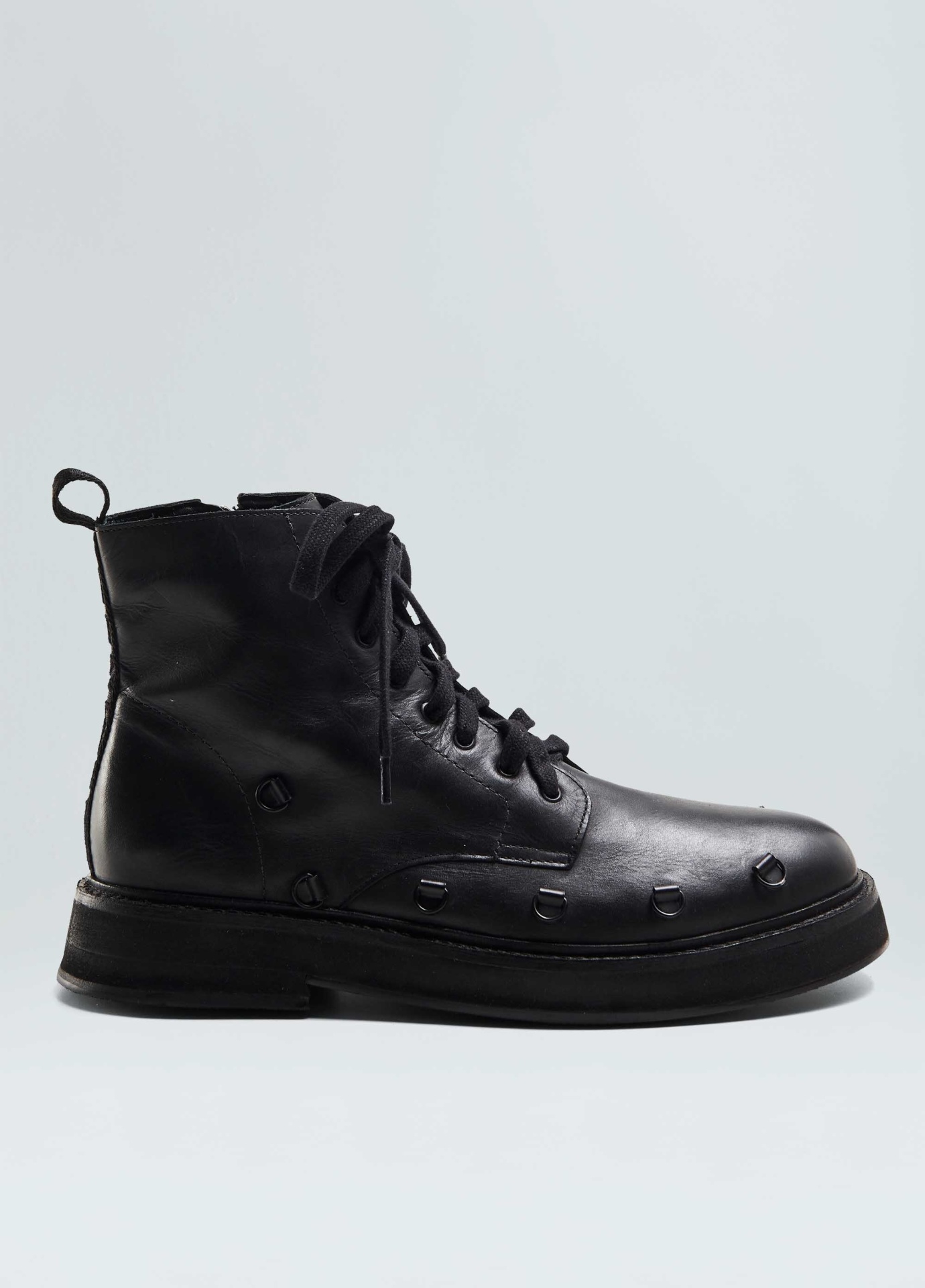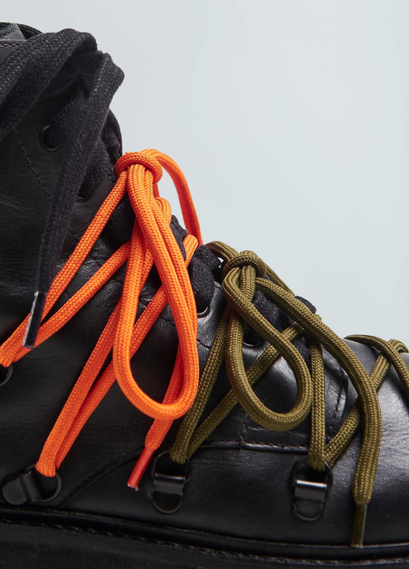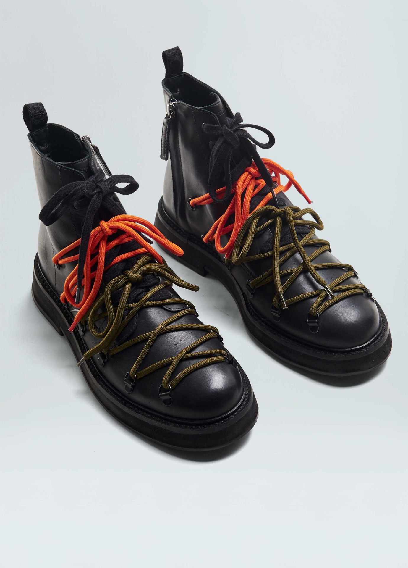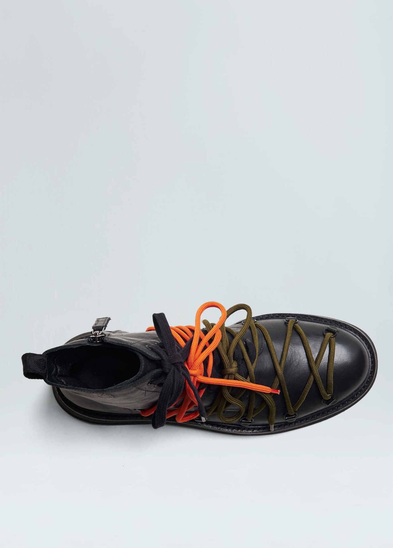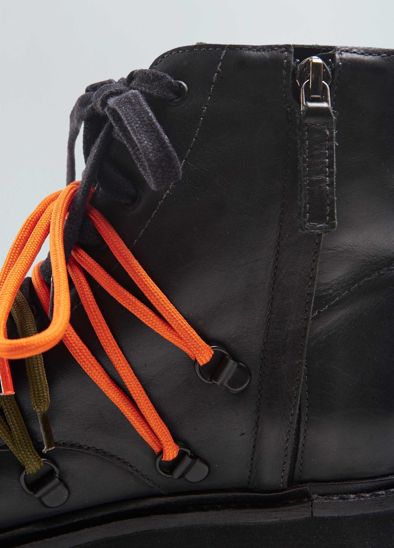 Bota coturno em couro bovino. Fechamento com zíper na lateral e amarração com 2 opções de uso, com e sem as cordas esportivas por cima do cadarço de algosão. Detalhe traseiro em fita personalizada Osklen.