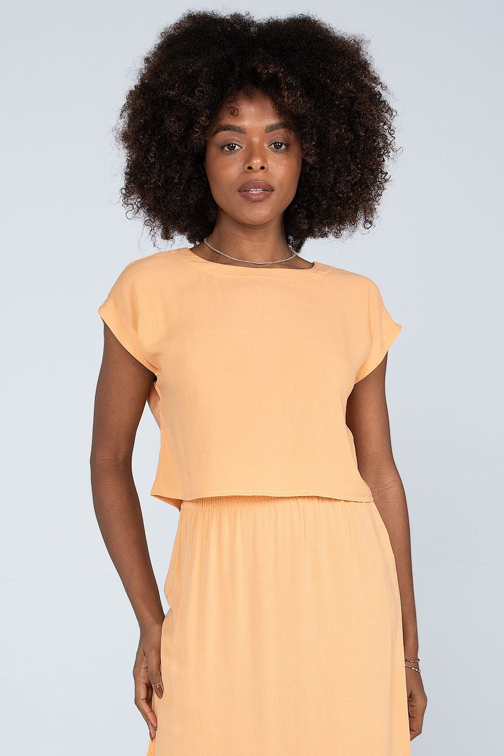 Modelo regata, com alça larga e decote arredondado. Fica soltinho no corpo.