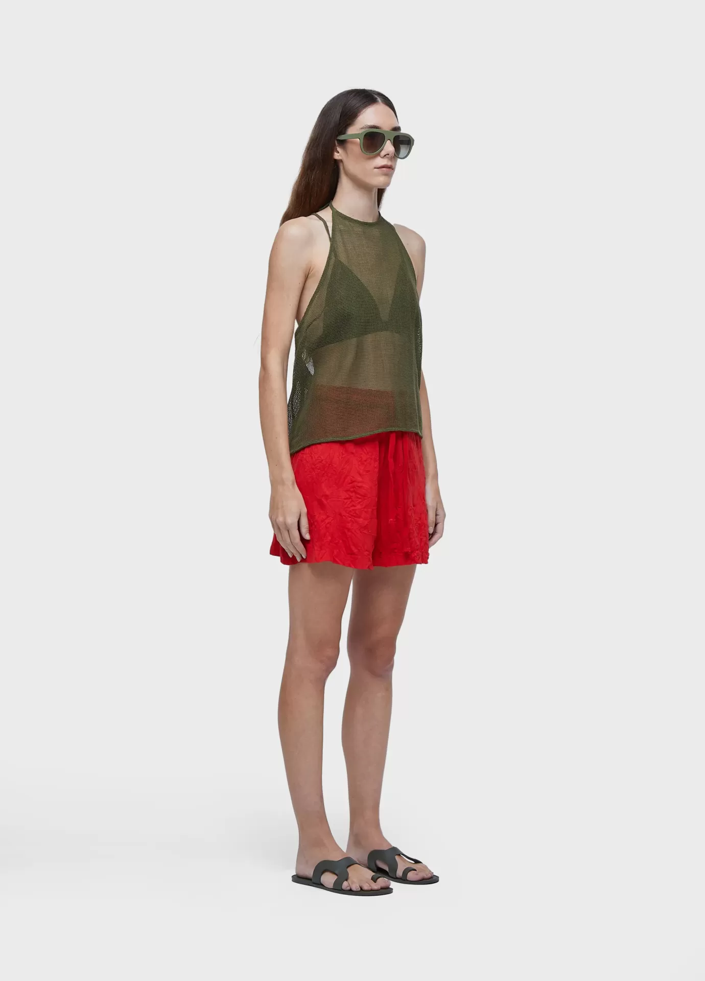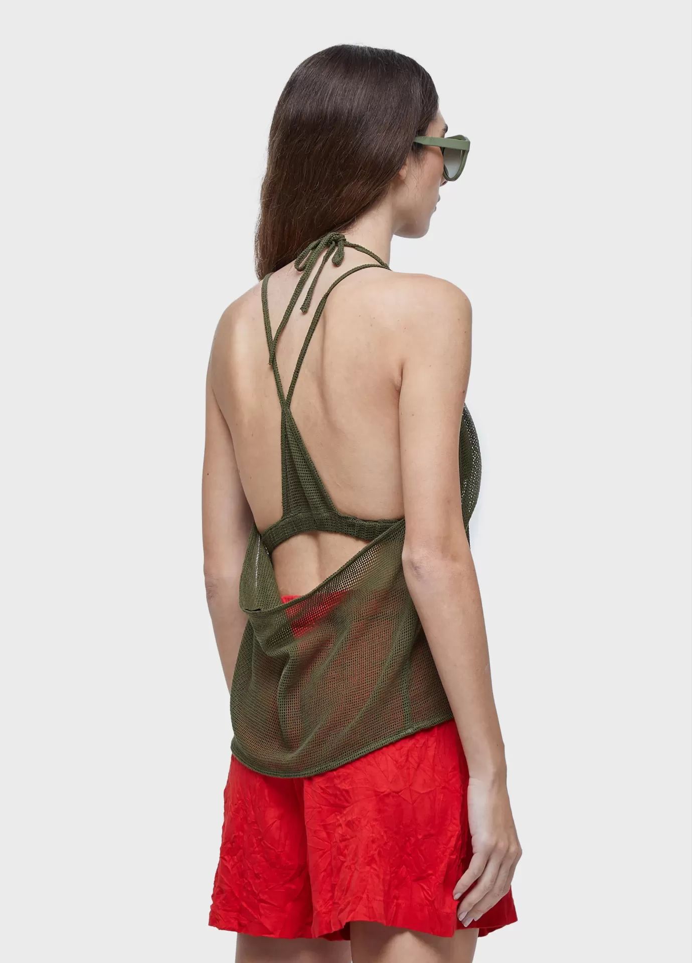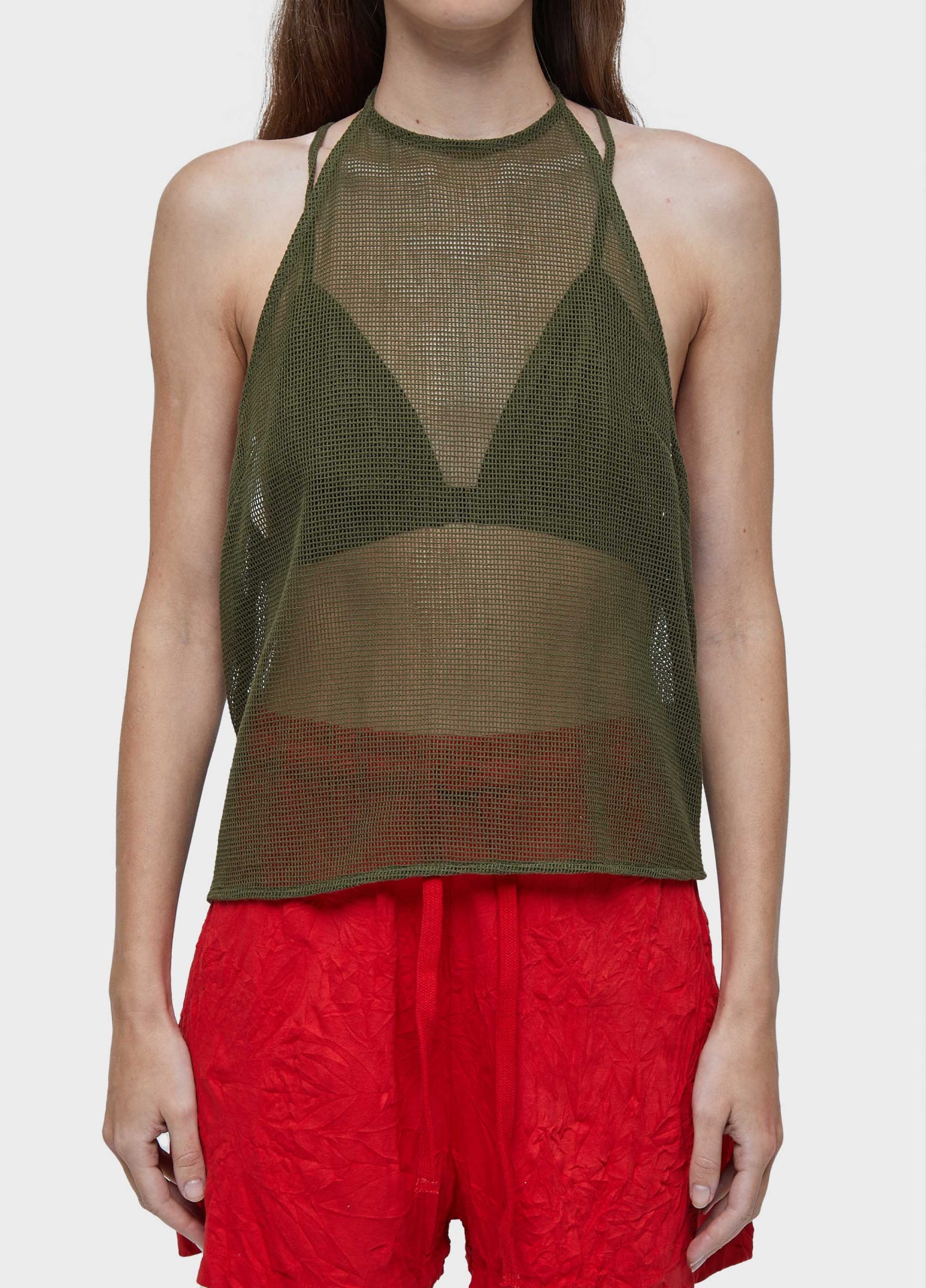 Blusa estilo frente única feita em tela. decote raglan. amarração no pescoço. fecho de zíper invisível na lateral. acompanha top interno de tela. top modelagem triângulo com elástico na barra e alcinha fina. tecido tela de algodão.