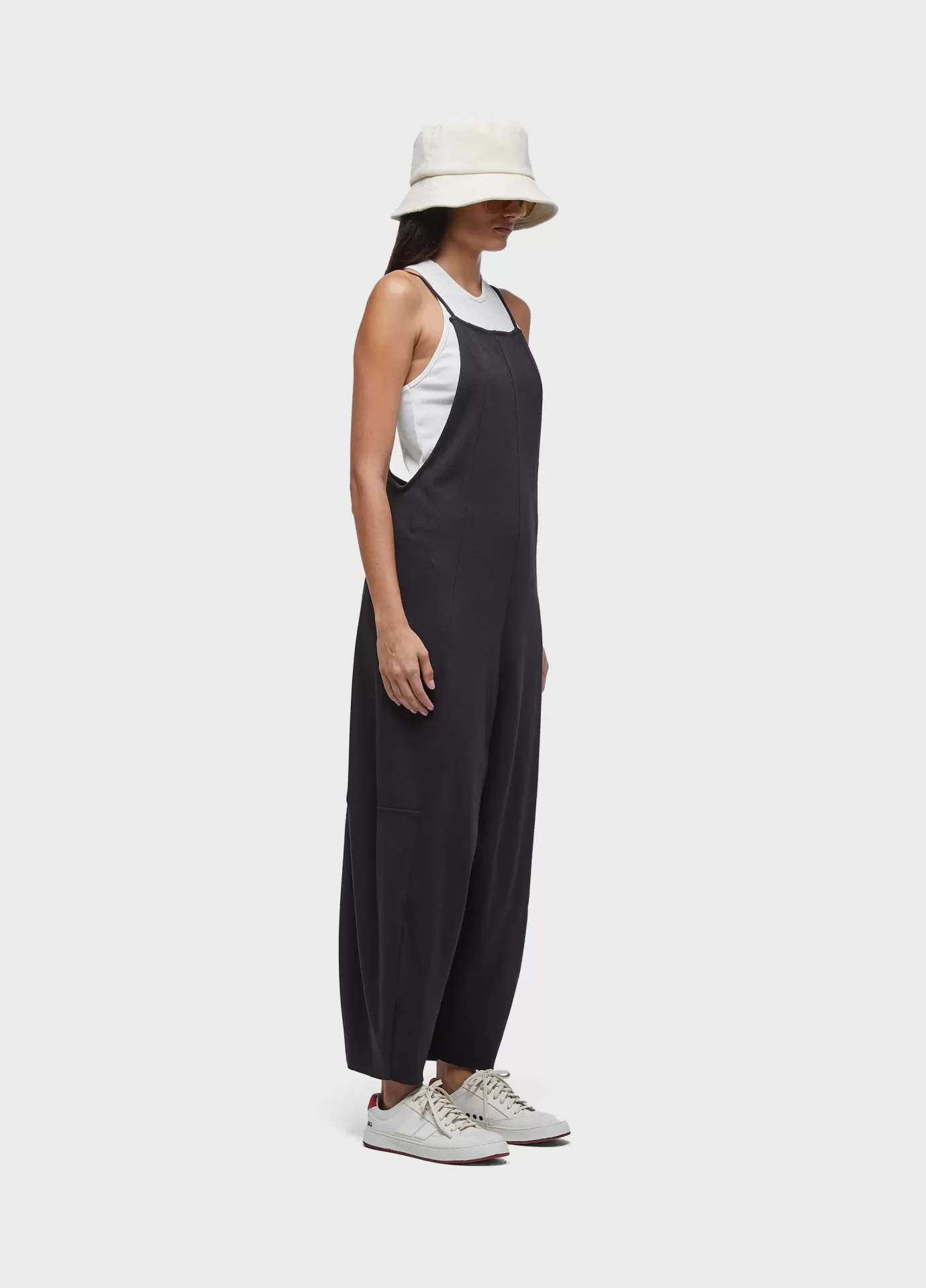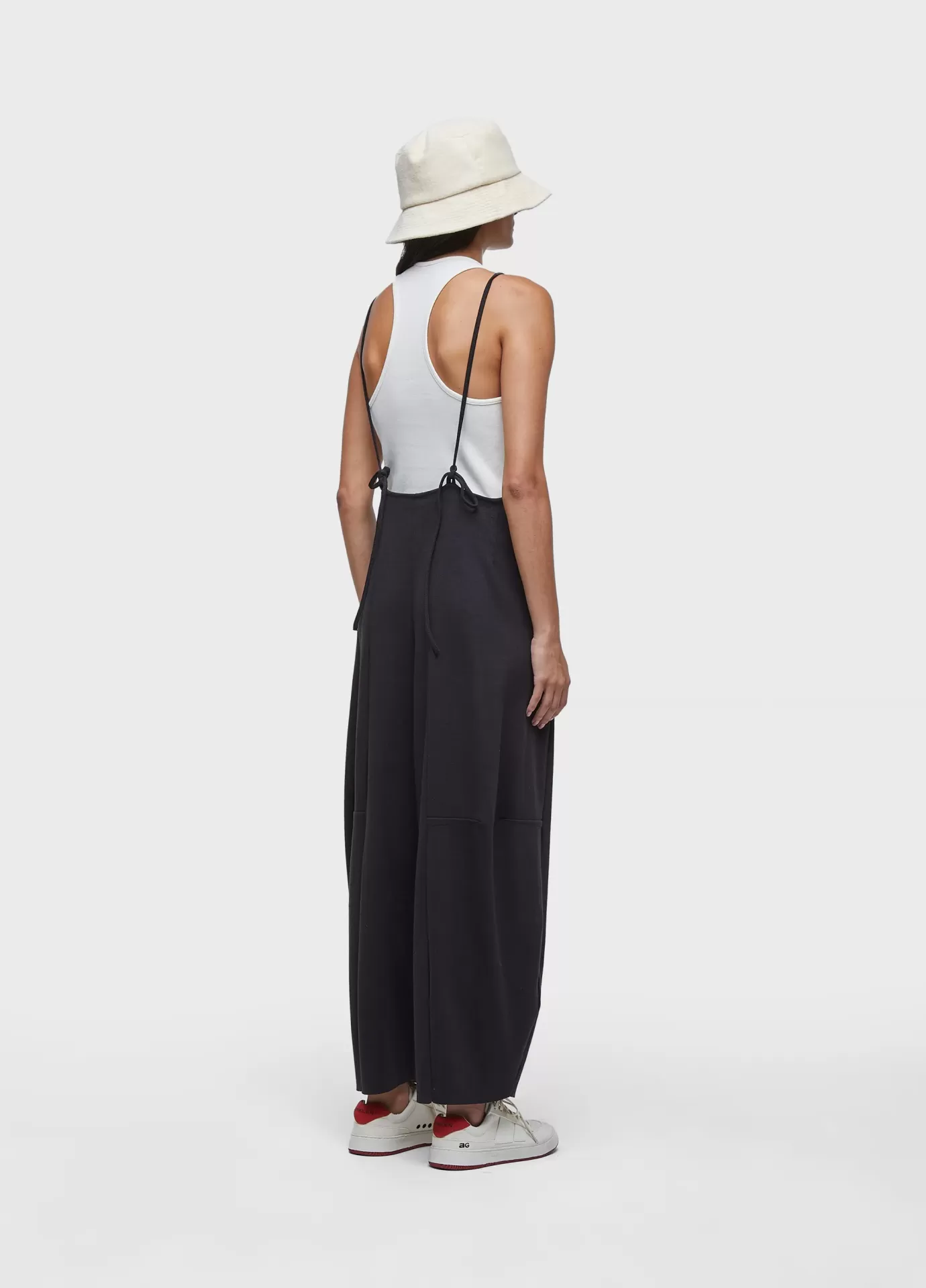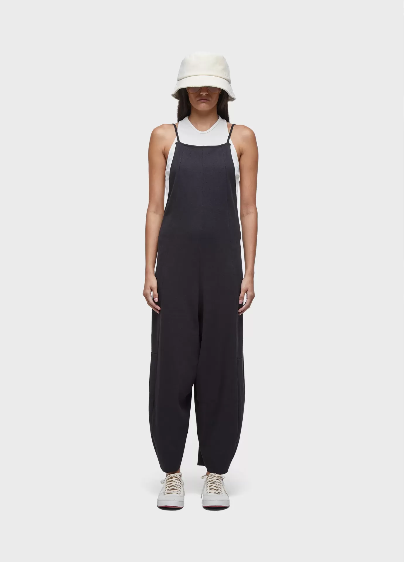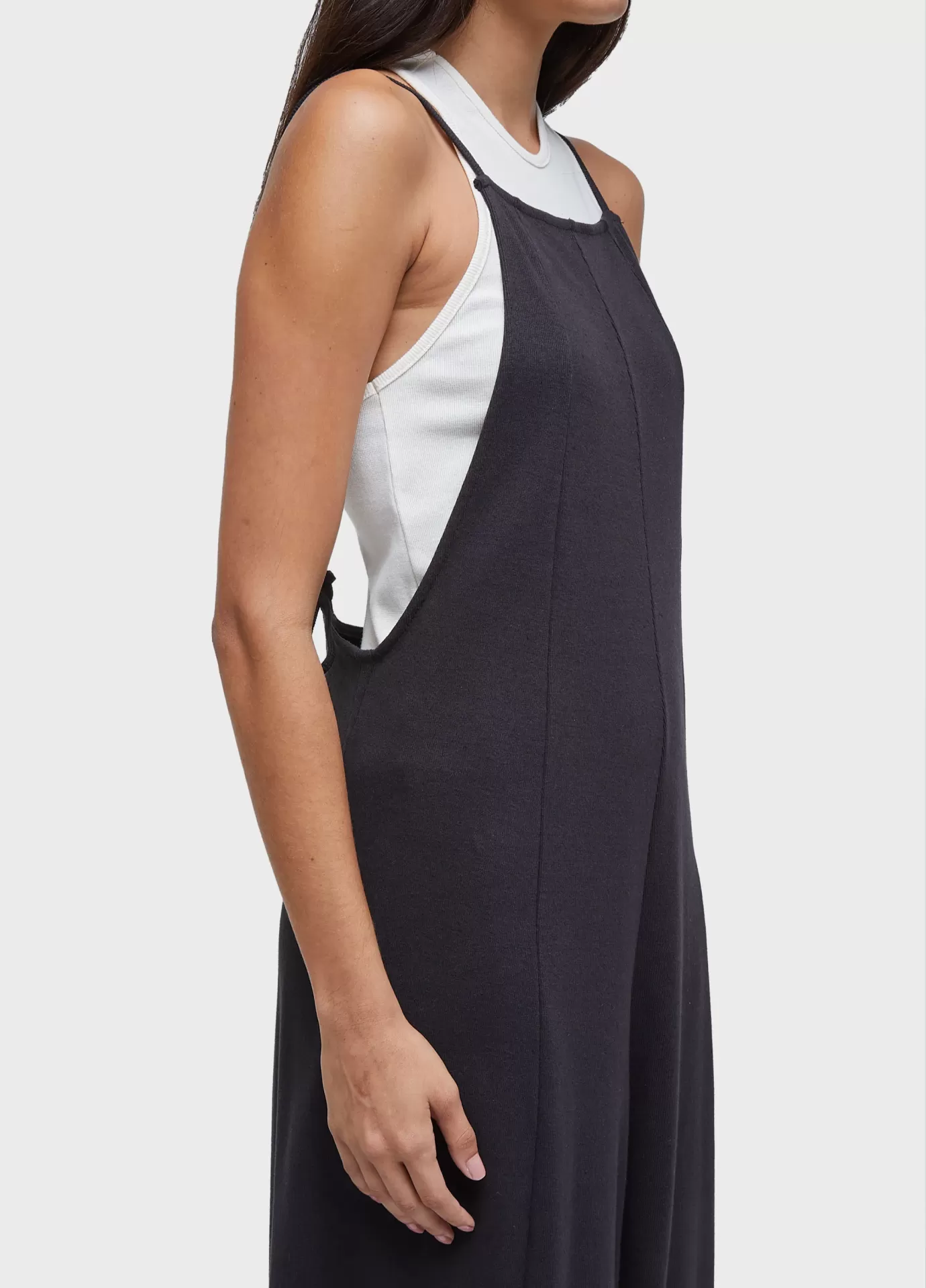 Macacão feito em malha canelada com fibras recicladas. modelagem tipo jardineira, com decote reto na frente e costas nuas. alças finas. modelagem levemente em a. acompanha regata de combinação com decote nadador e comprimento curto. recycled fibers + andiroba oil.