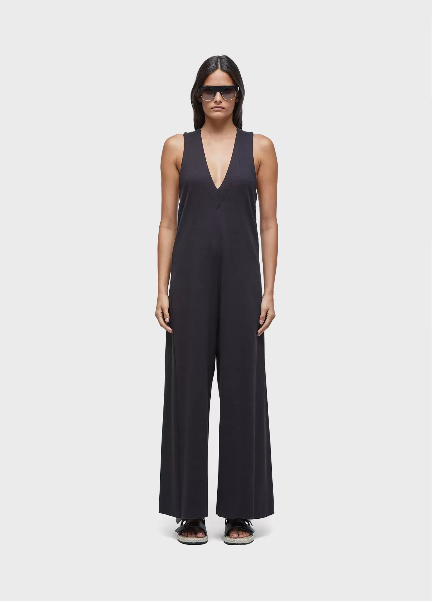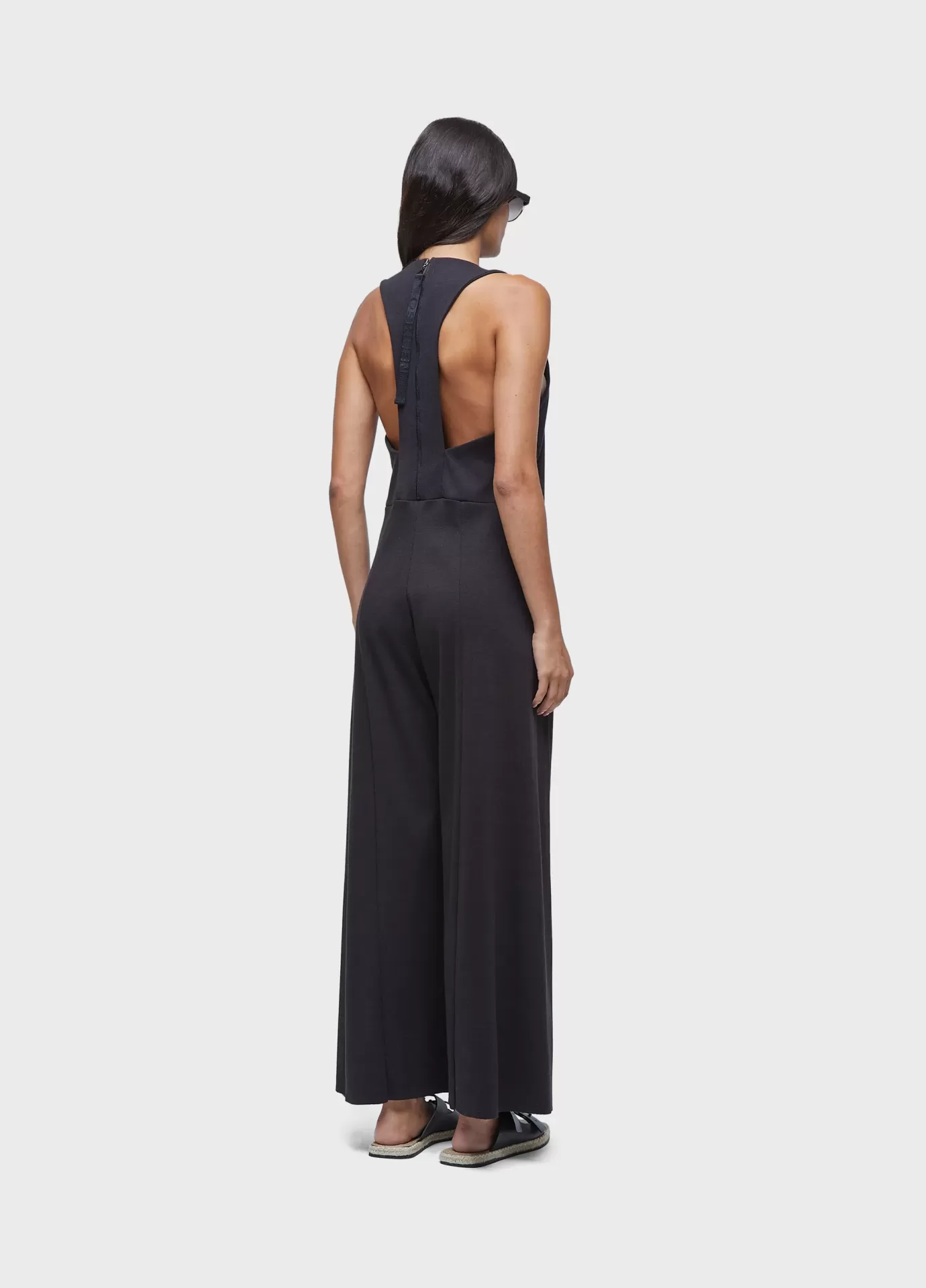 Macacão feito e malha canelada com fibras recicladas. decote em v na frente e nadador bem pelado costas. fecho em zíper nas costas. modelagem com cintura marcada e pernas tipo pantalona. recycled fibers + andiroba oil.