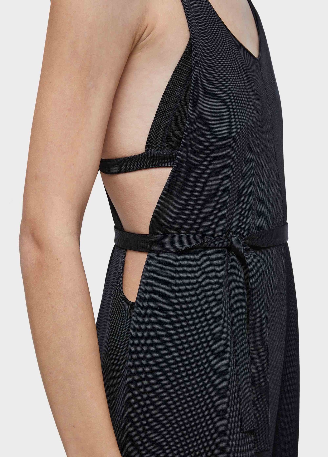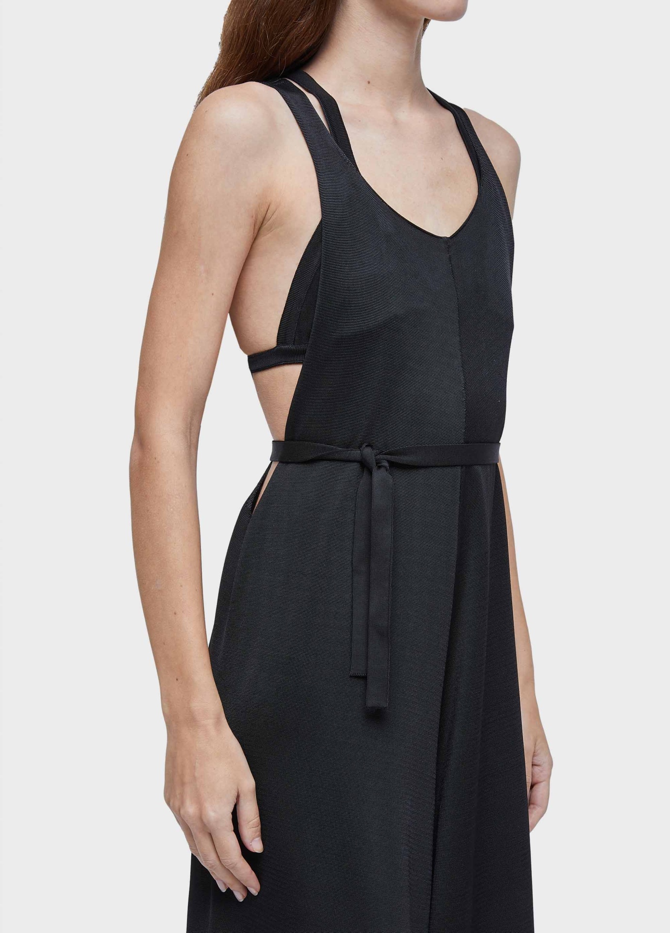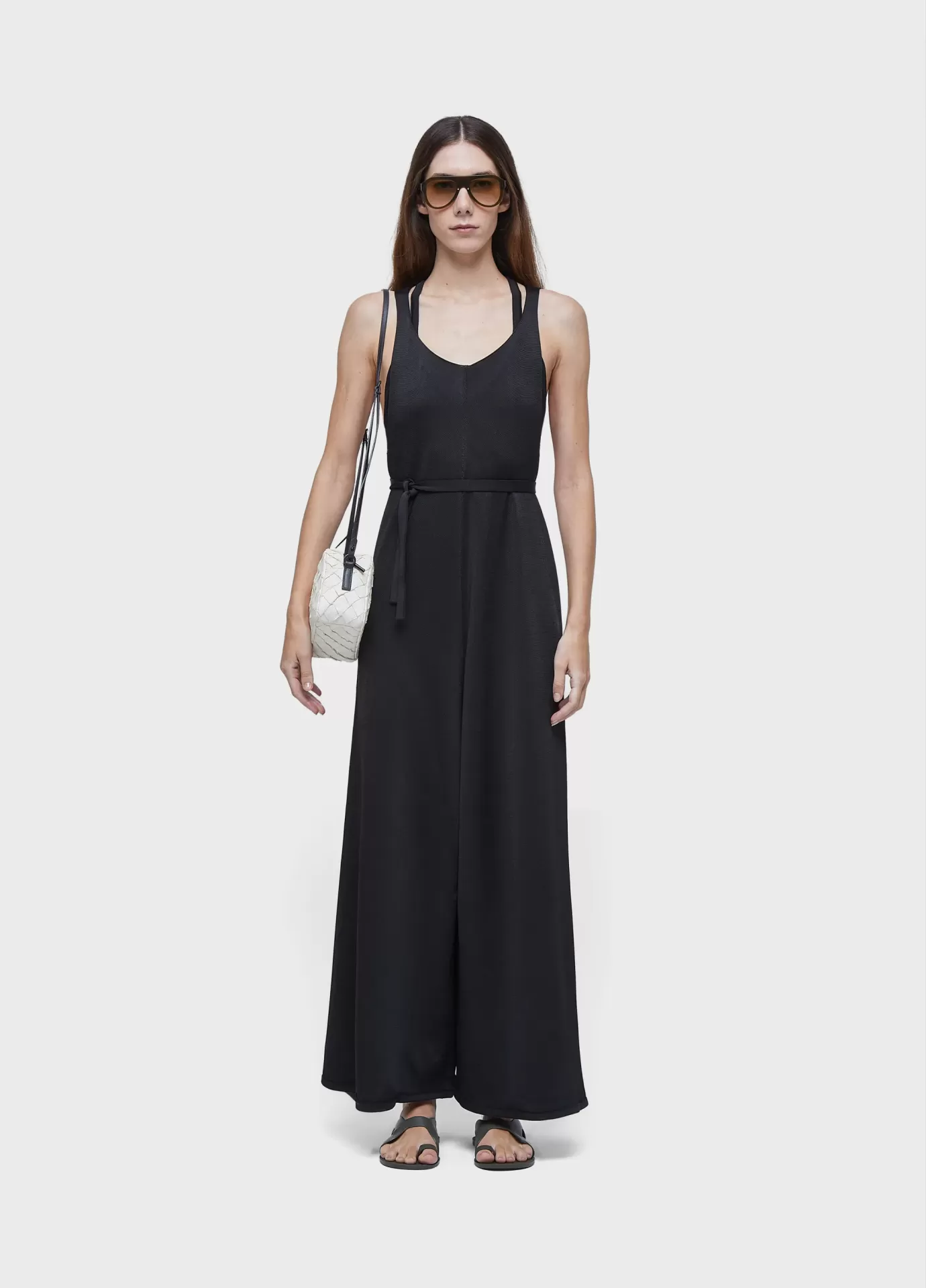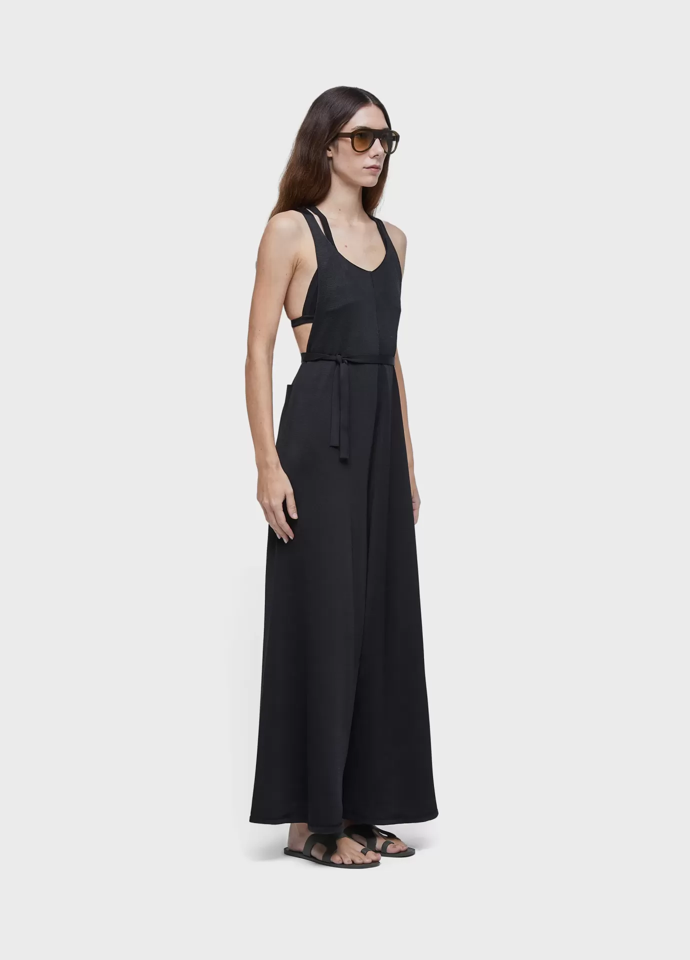 Macacão de tricot com fio de rayon com elastano. a peça possui nadador profundo em "y" nas costas e faixa para amarração na cintura. modelagem solta no corpo, com cavas abertas. além disso, a peça possui como combinação um top triângulo fixo, também de tricot de rayon com elastano.