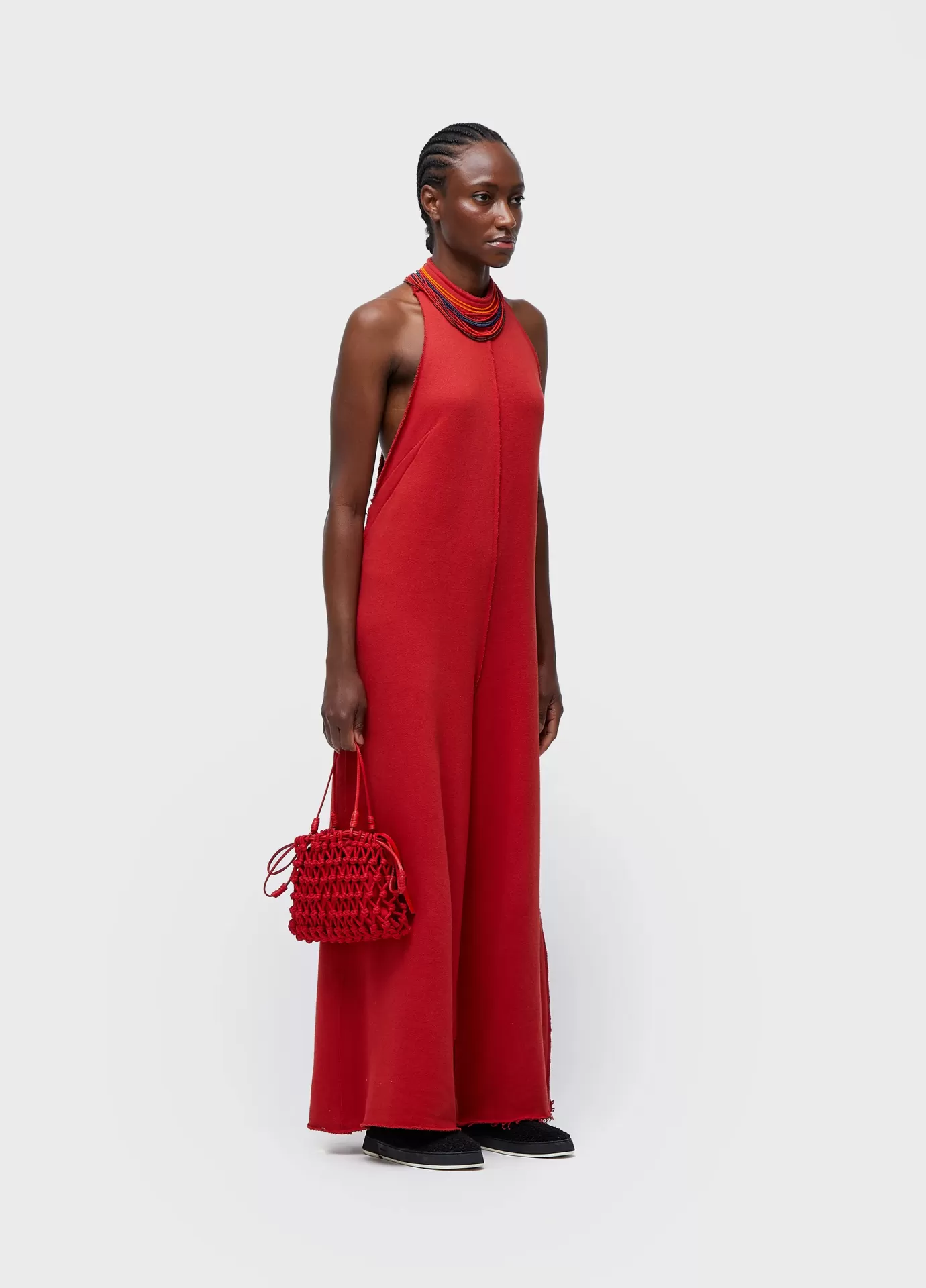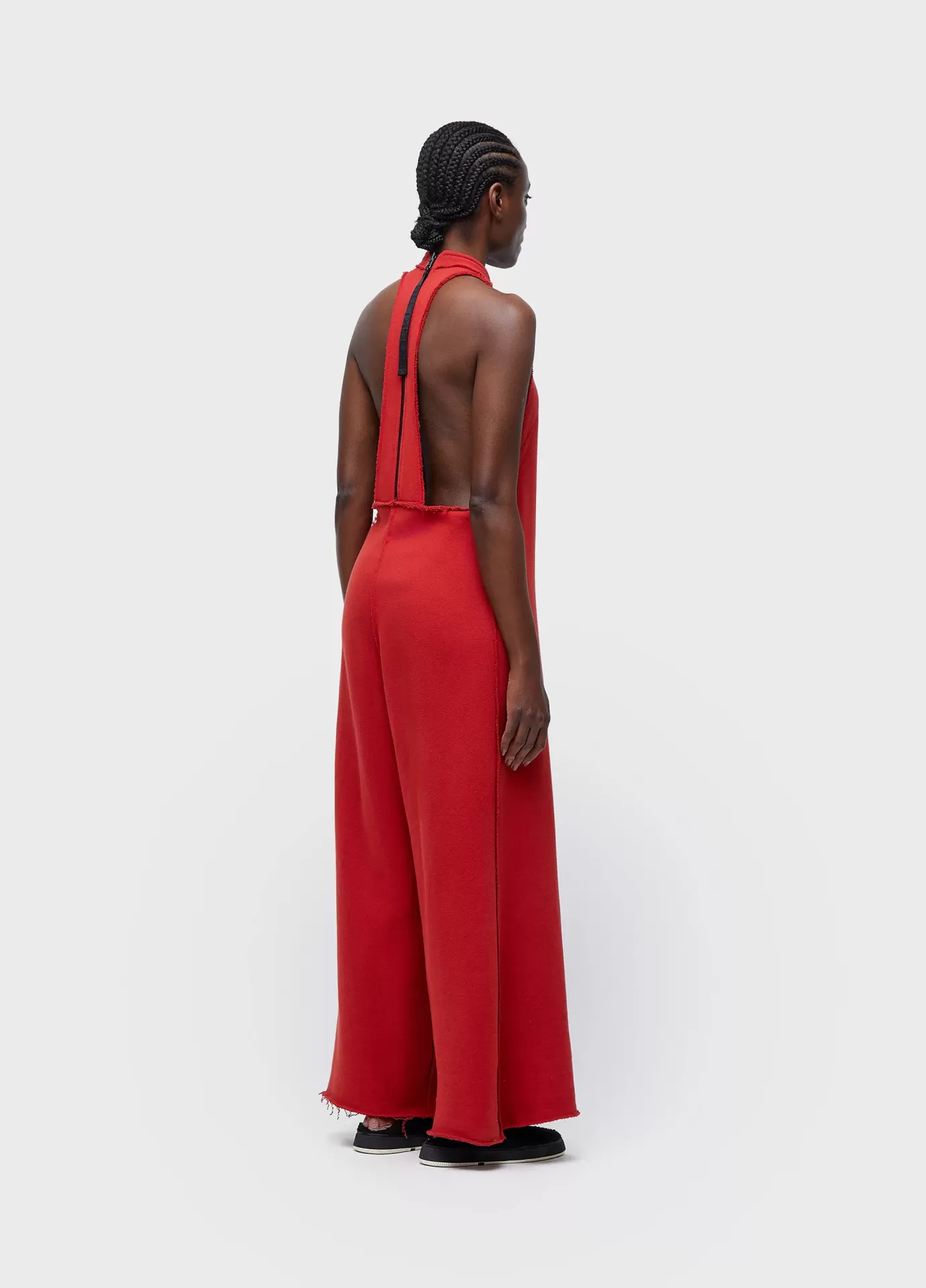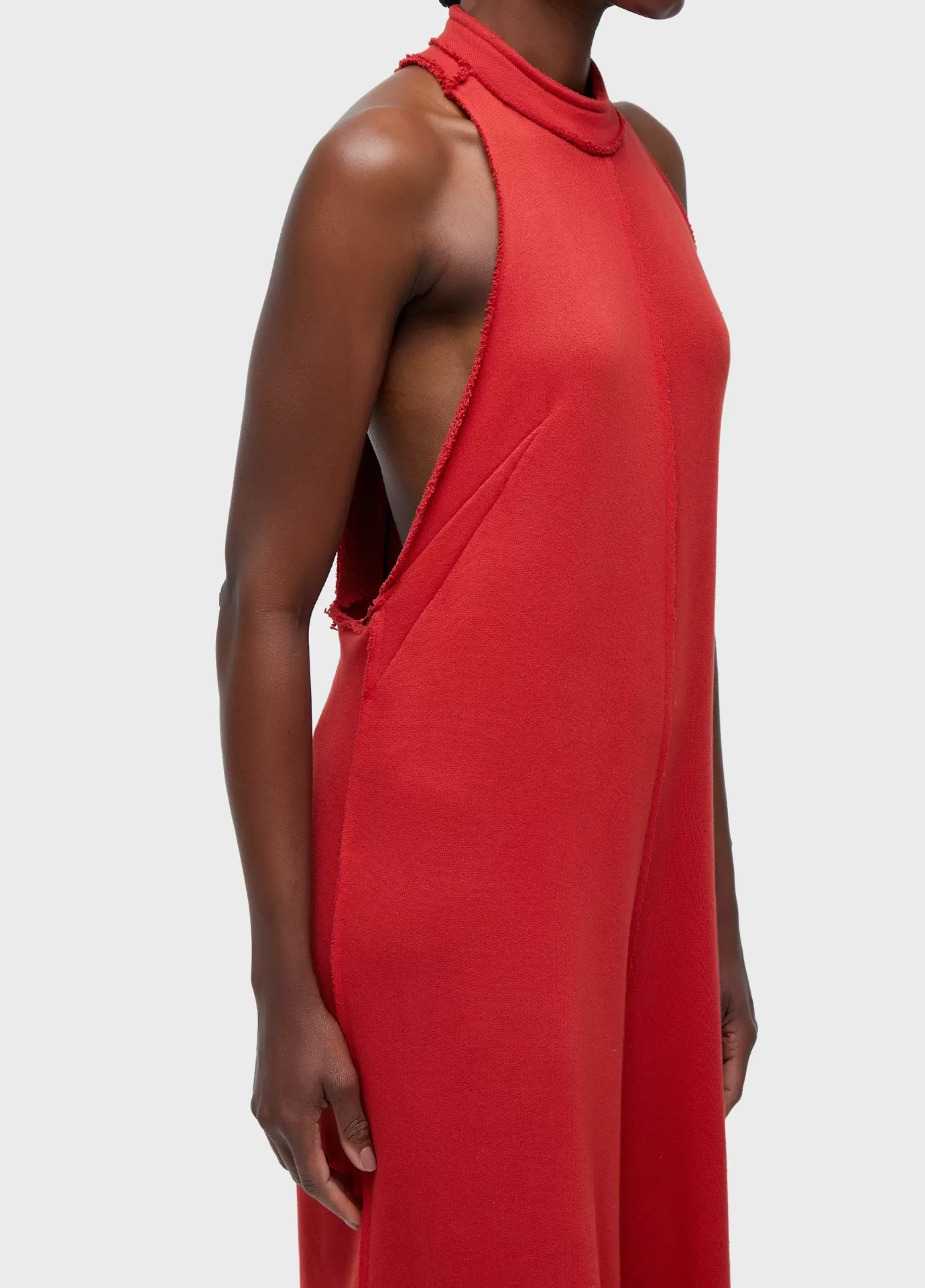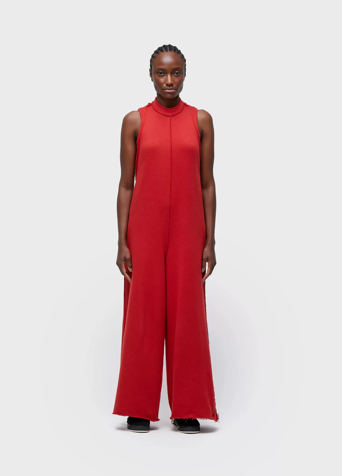 Macacão nadador; modelagem ampla; peça double face: lado com textura e outro liso; fechamento com zíper de metal no centro costas; possui regata avulsa para uso interno; feito em moletom com fibras recicladas e amaciadas