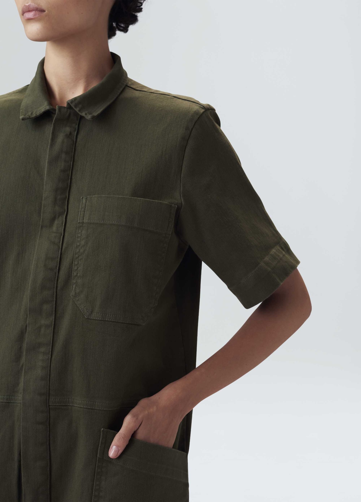 descriçãoMacacão utilitário, manga longa, com bolsos e abotoamento frente em cupro