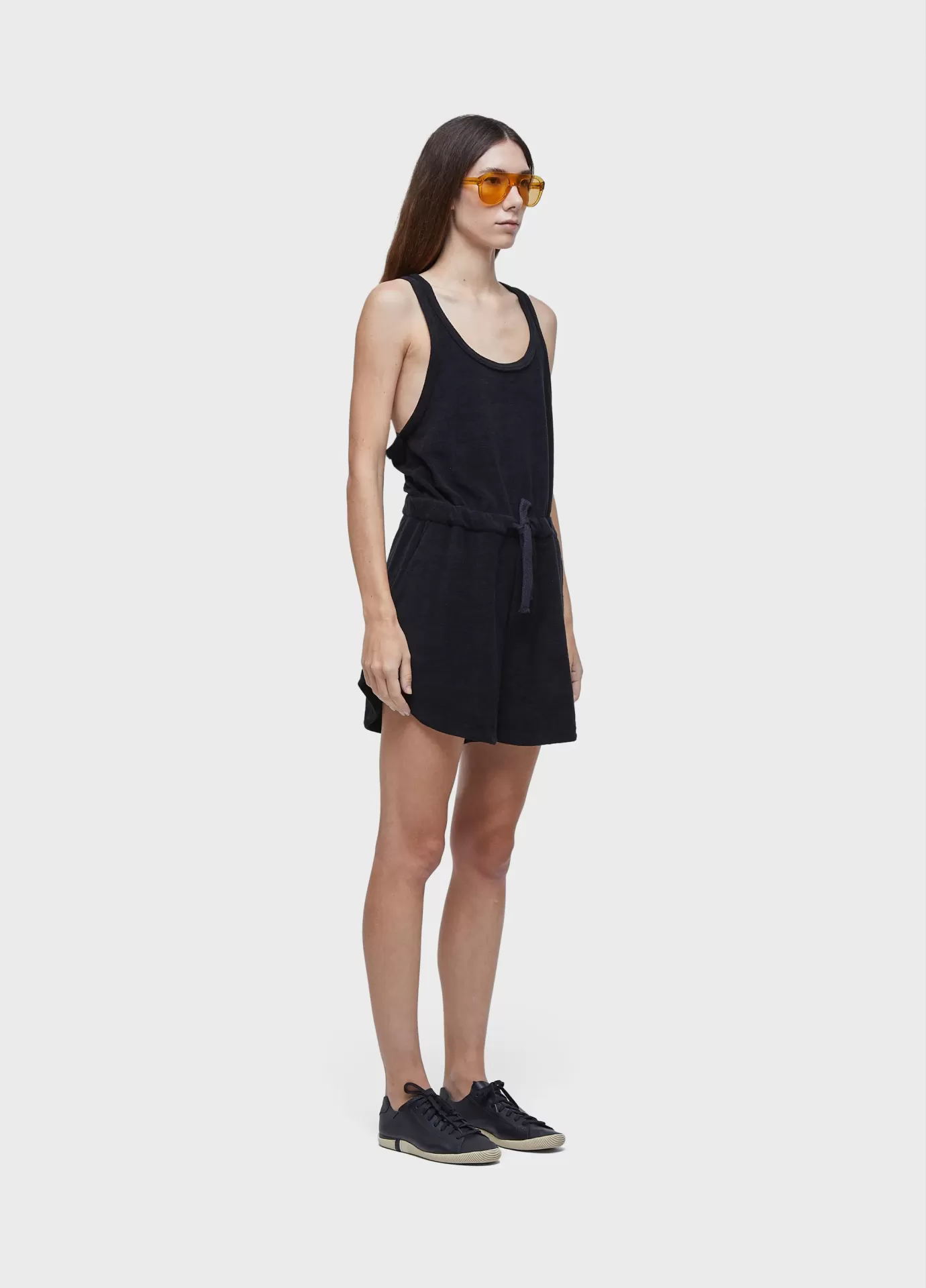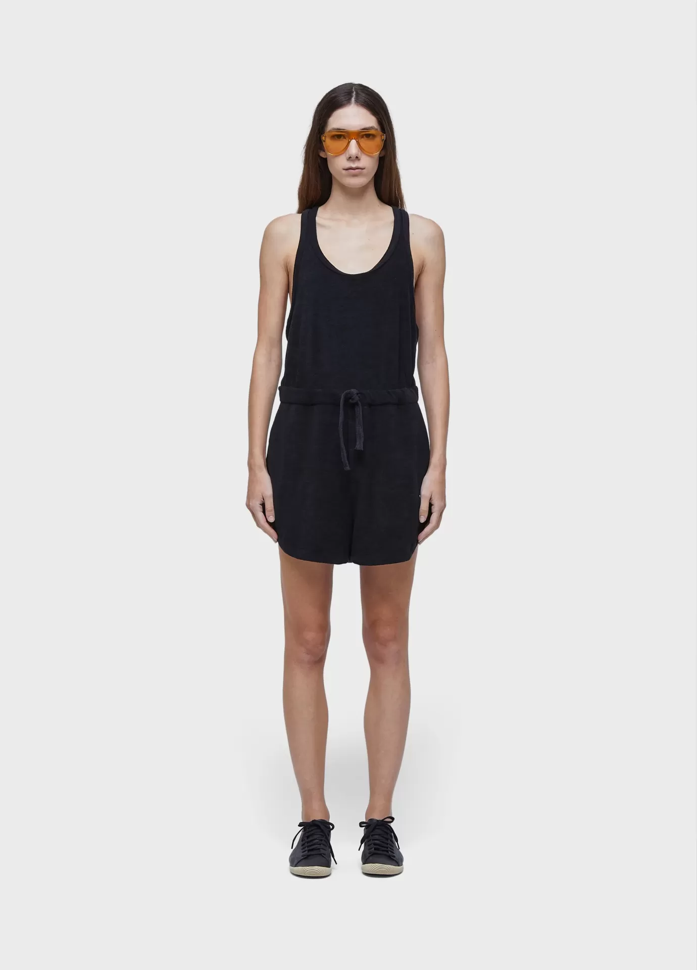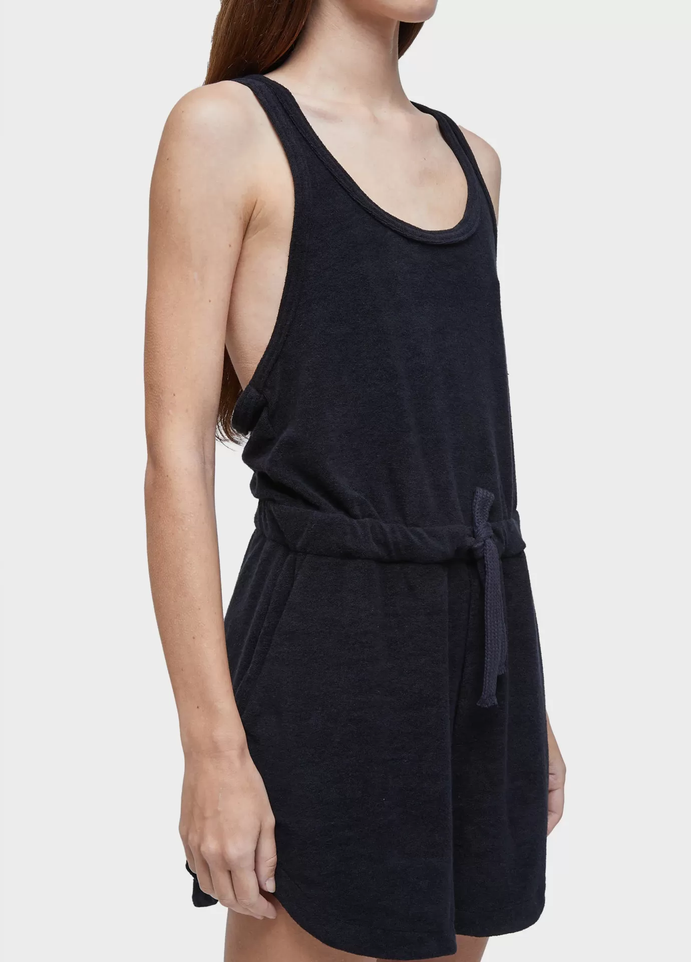 Macaquinho atoalhado. alças finas, decote em u na frente, alças em v nas costas. modelagem reta. amarração na cintura. certified cotton + recycled pet.