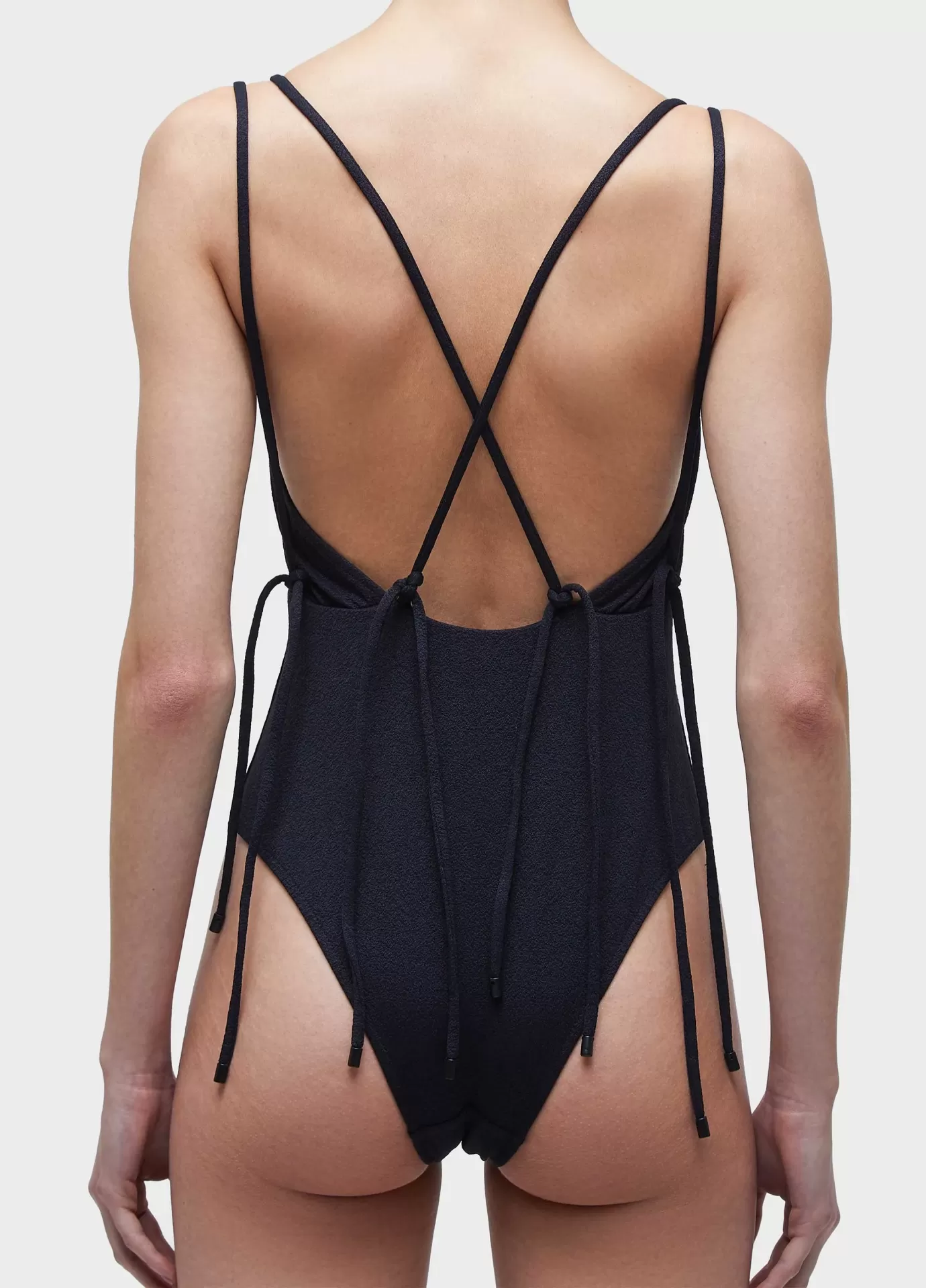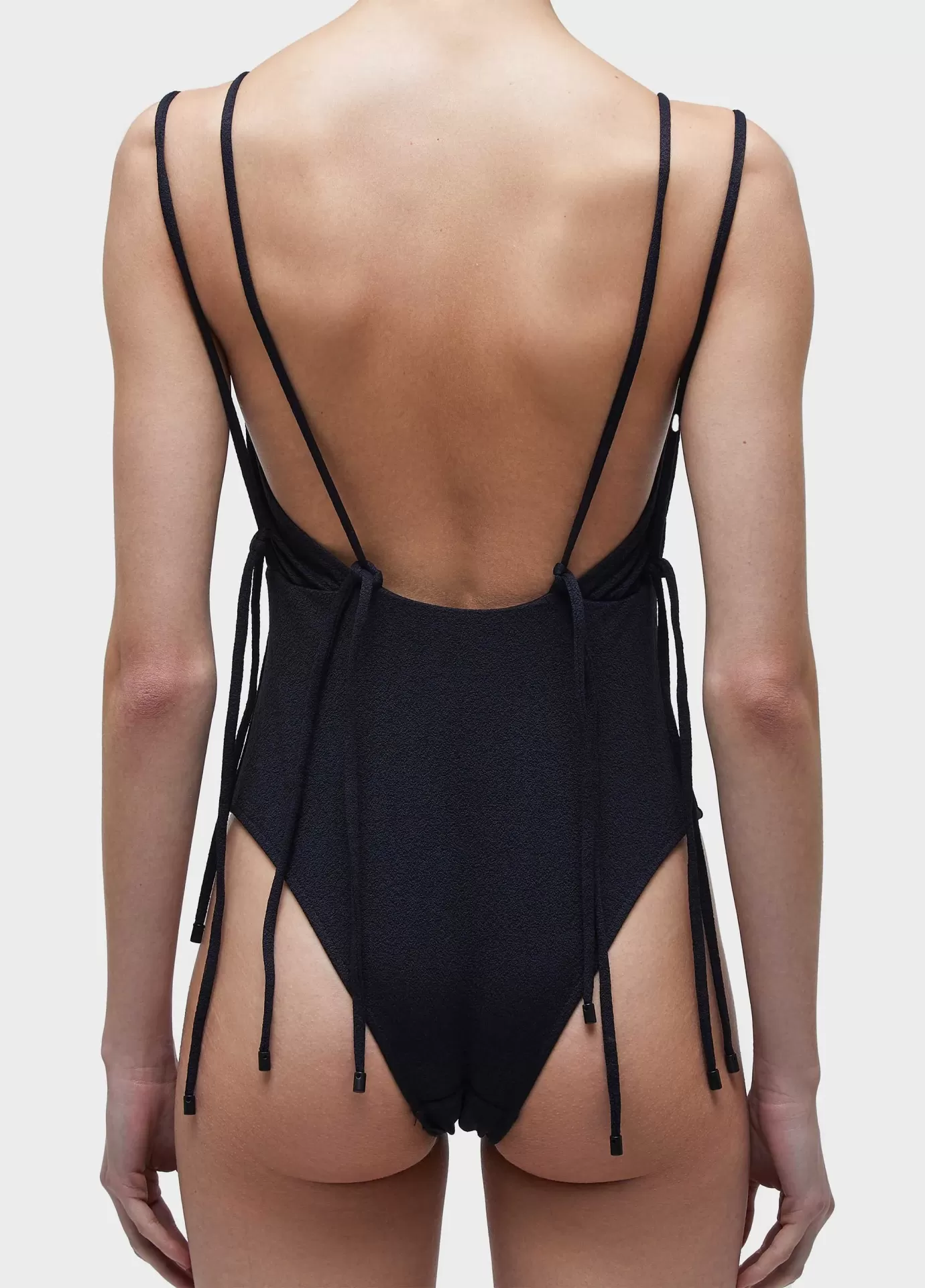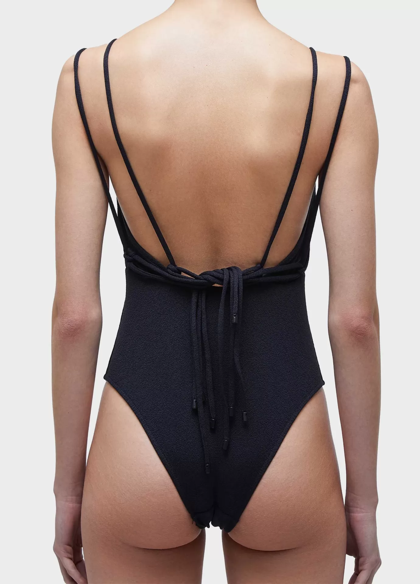 Maiô com decote reto e alças duplas. a peça possui decote cóstas aberto e amarração com quatro laços nas cóstas. desenvolvido em malha elástica com textura . forro em malha elástica leve.
