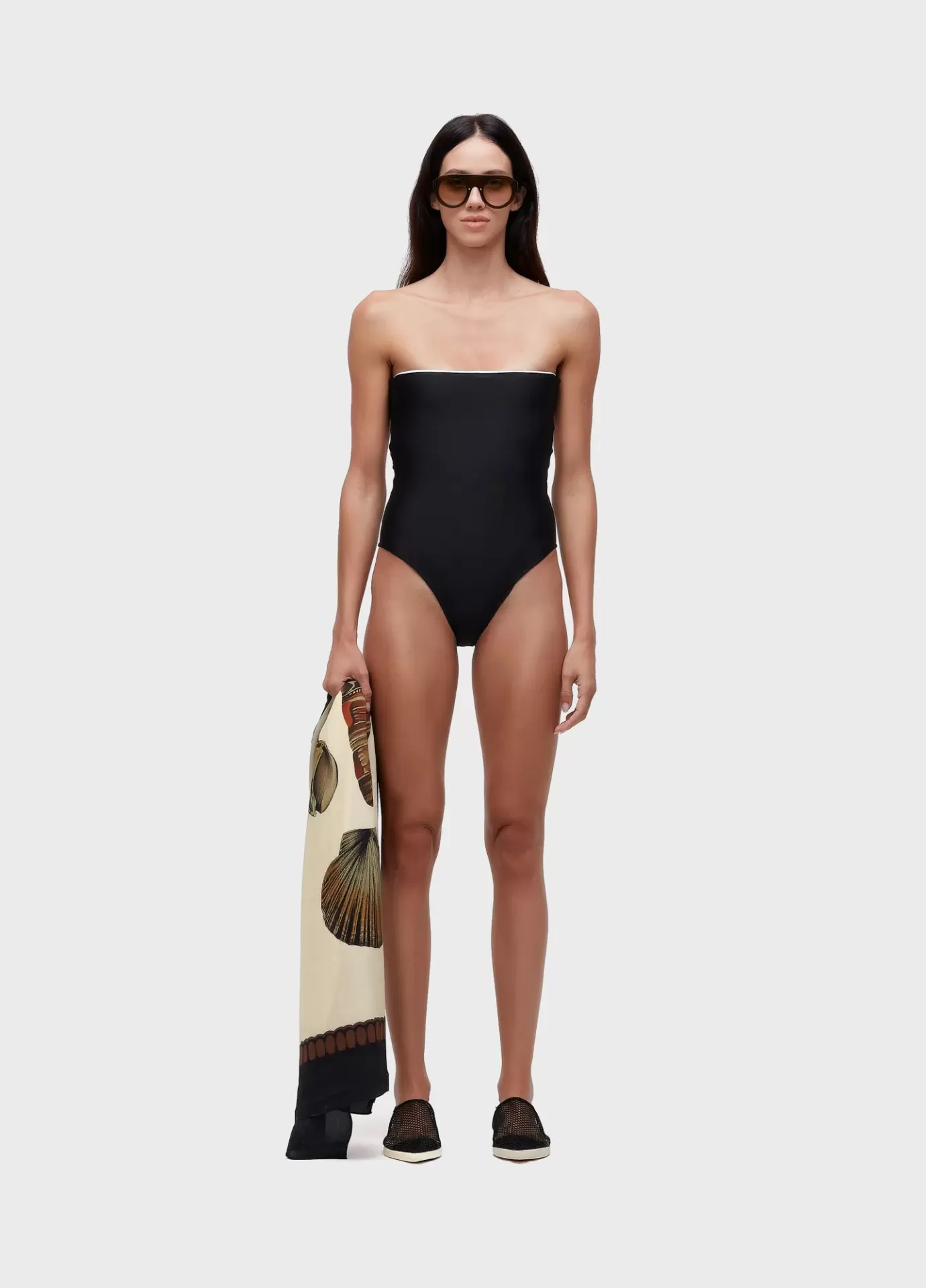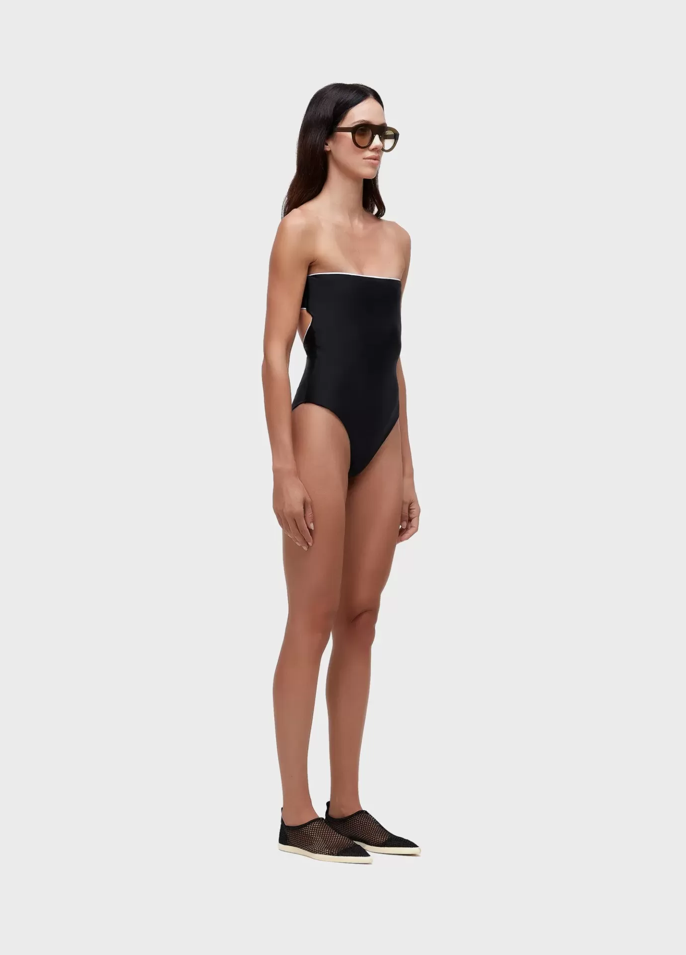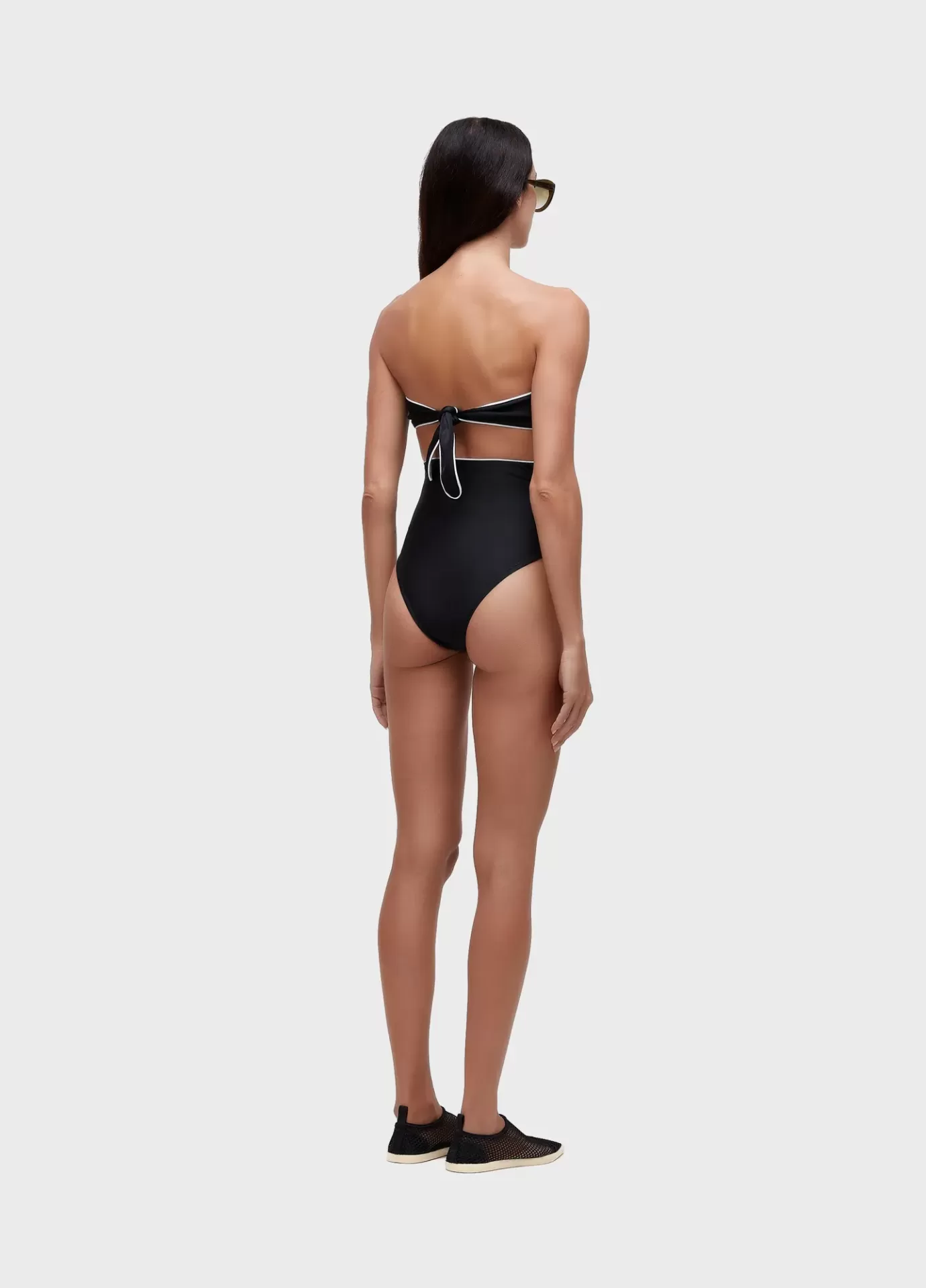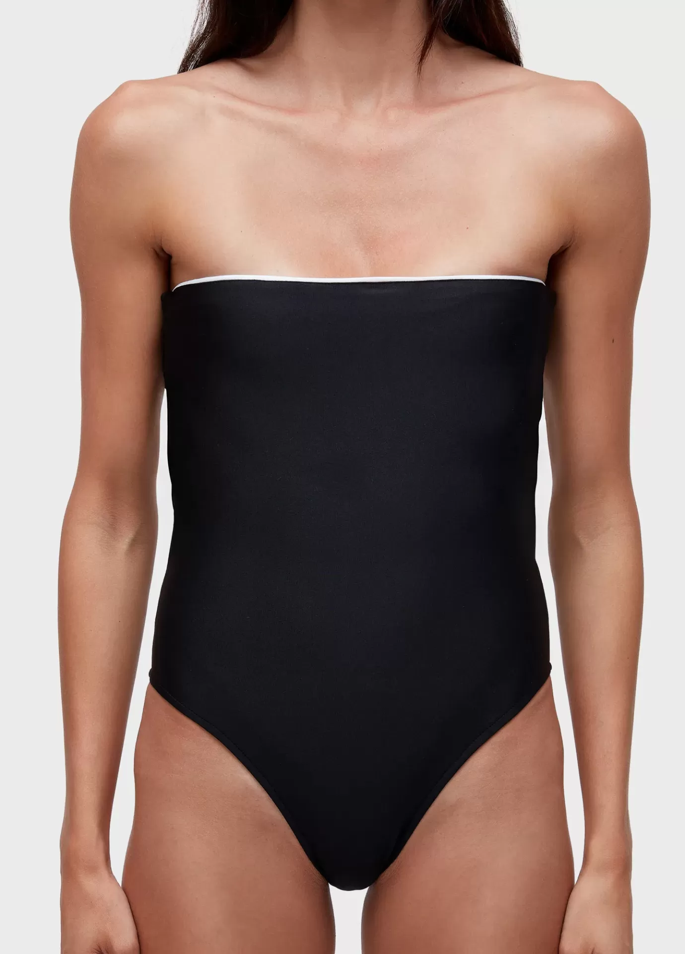 Maiô em modelagem bandeau, na cor preta, com friso no decote e cintura. Cor contrasta