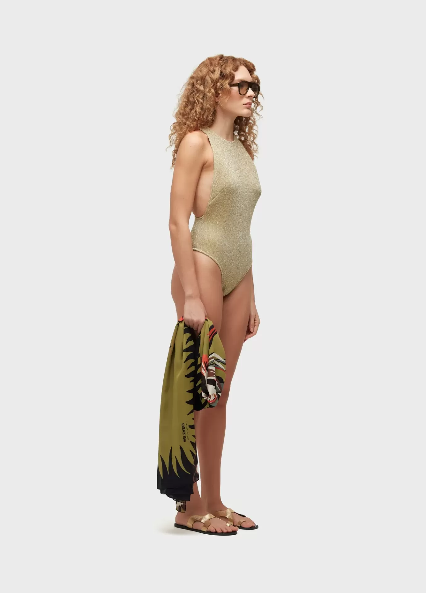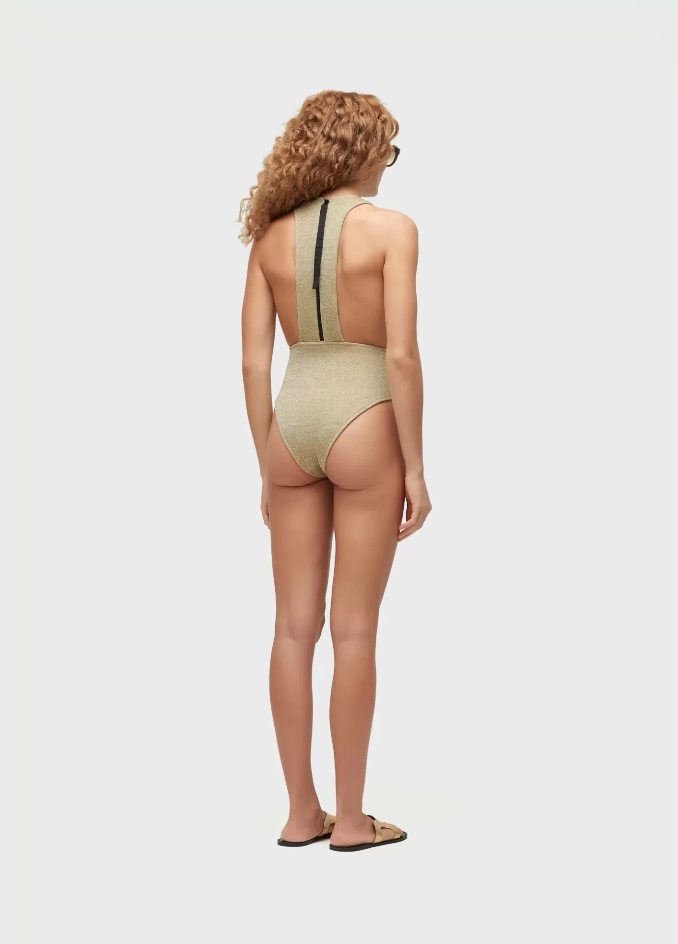 Maiô de tricot com fio de lurex, modelo nadador, com fechamento das costas com zíper selado e puxador personalizado Osklen. Forro em malha elástica leve.