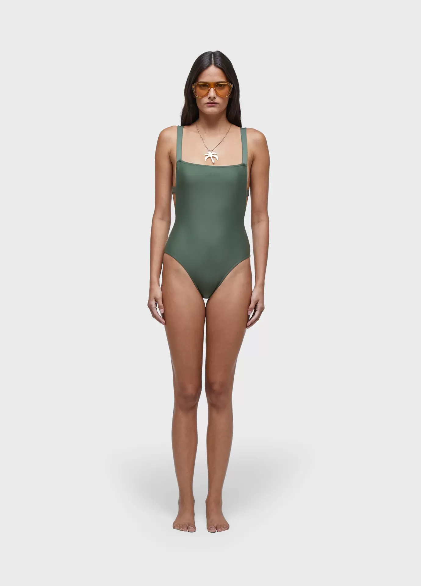 Maiô com decote reto e costas cruzadas, feitas com elástico embutido. alças regulavéis. desenvolvida em malha elástica com proteção uv50+, forro em malha elástica leve.